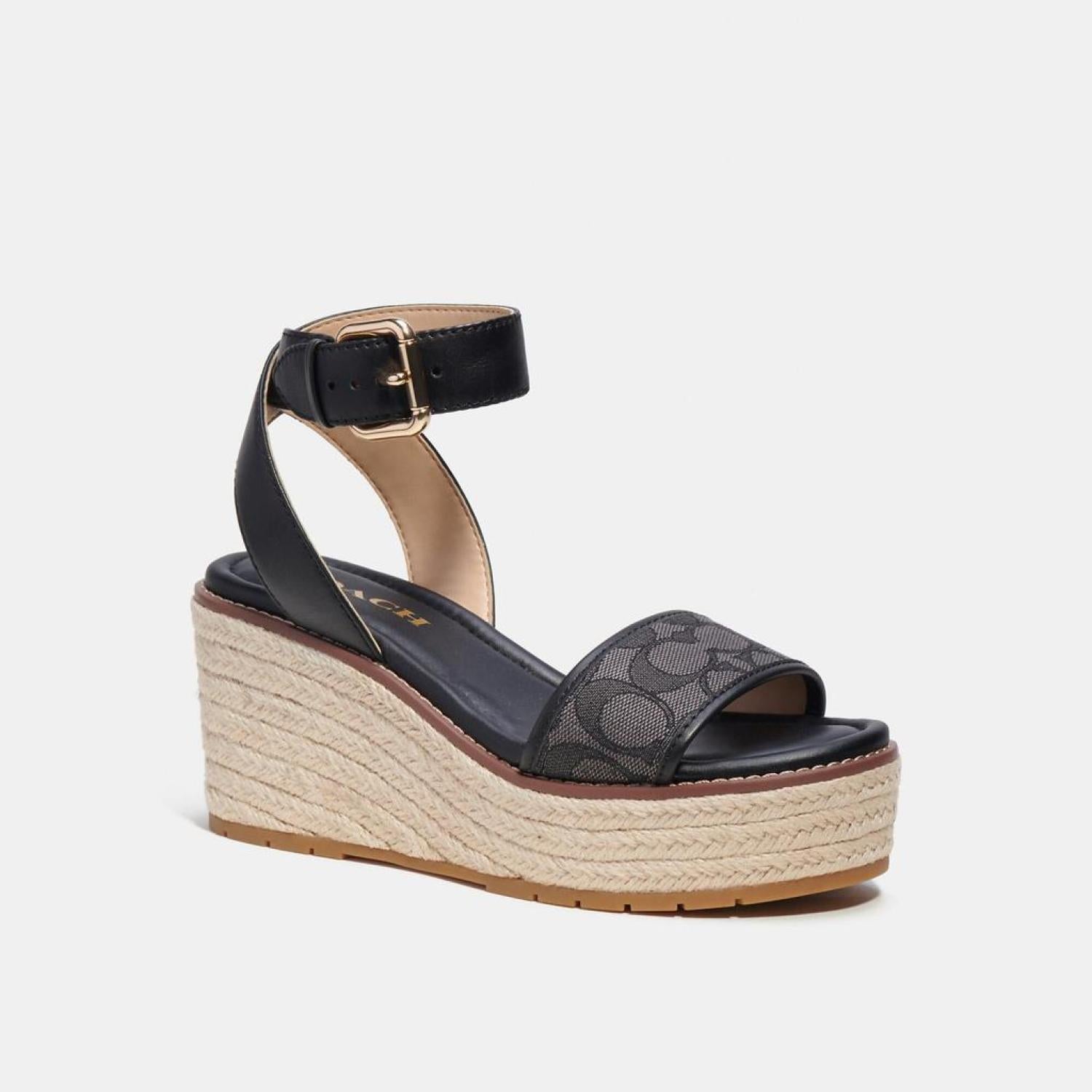 Signature jacquard and leather upper Man-made leather lining and footbed Rubber outsole Buckle closure 3 heel 1 3/4 platform Style No. CI047 | Coach Outlet Korey Espadrille In Signature Jacquard - Black, Size - 8