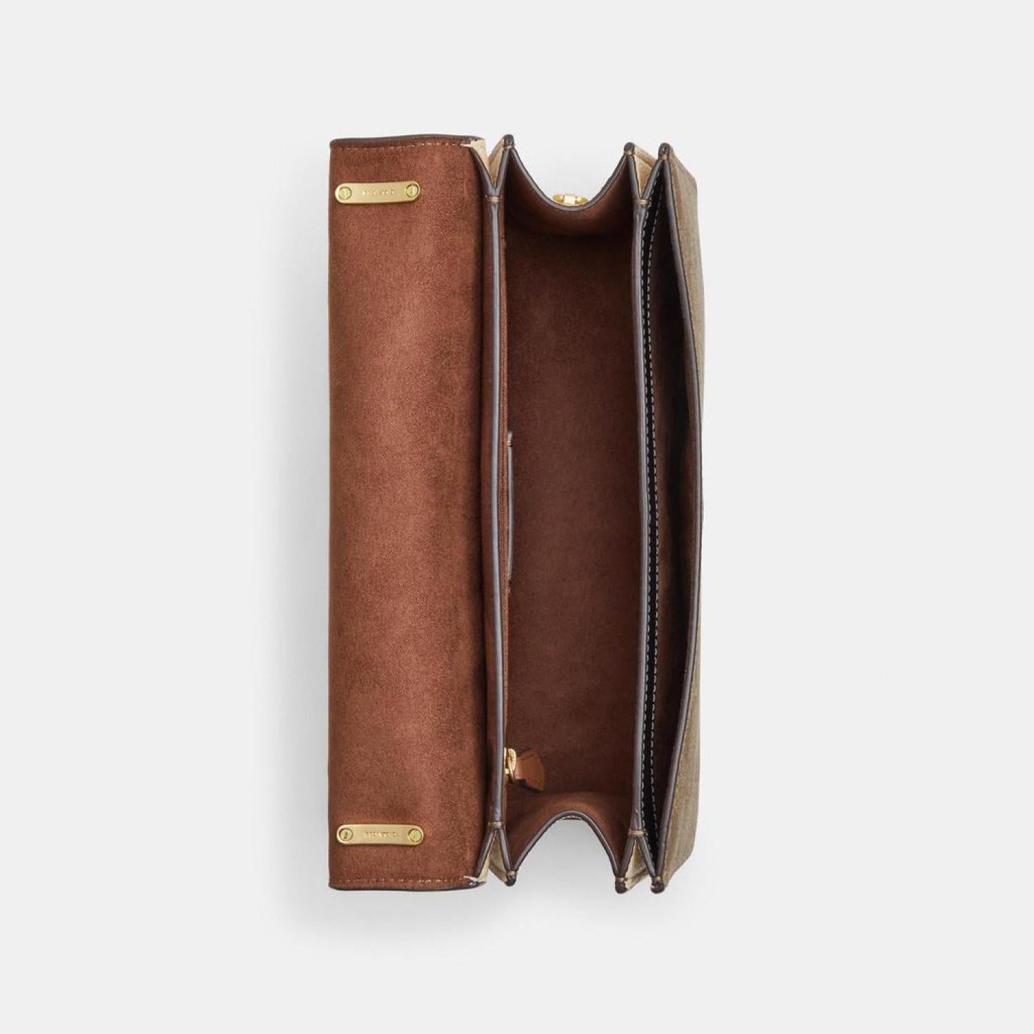 Signature coated canvas refined pebble leather and smooth leather Inside zip and multifunction pockets Snap closure fabric lining Adjustable strap with 21 1/2 drop for shoulder or crossbody wear Outside open pocket 9 3/4 (L) x 6 1/4 (H) x 3 (W) Style No. CM713 | Coach Outlet Large Morgan Square Crossbody In Colorblock Signature Canvas - Beige