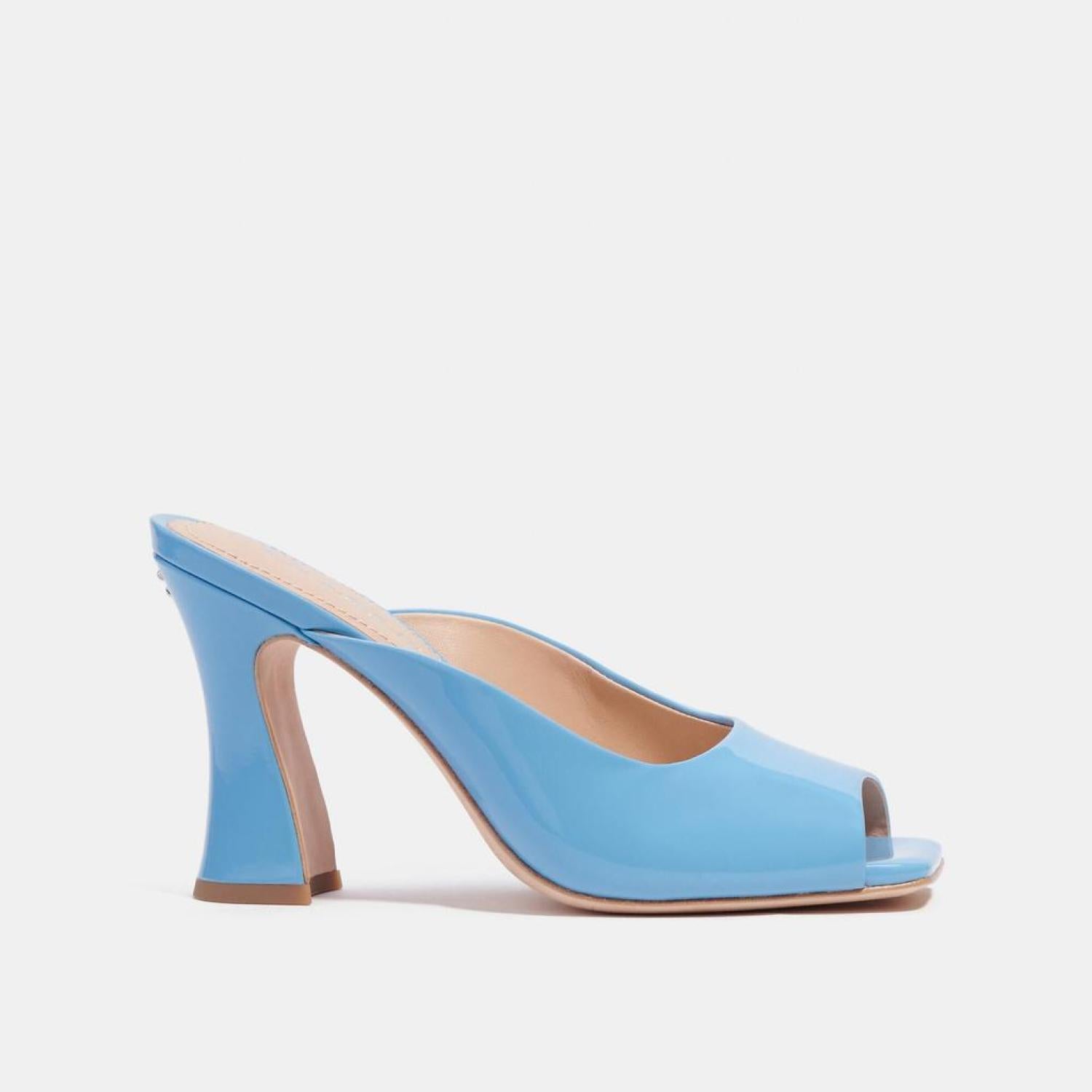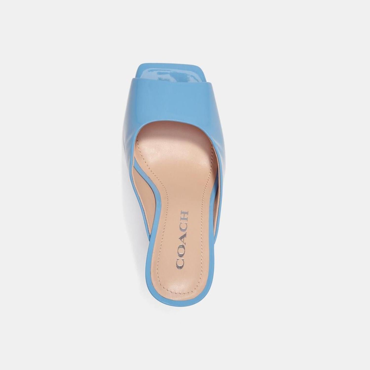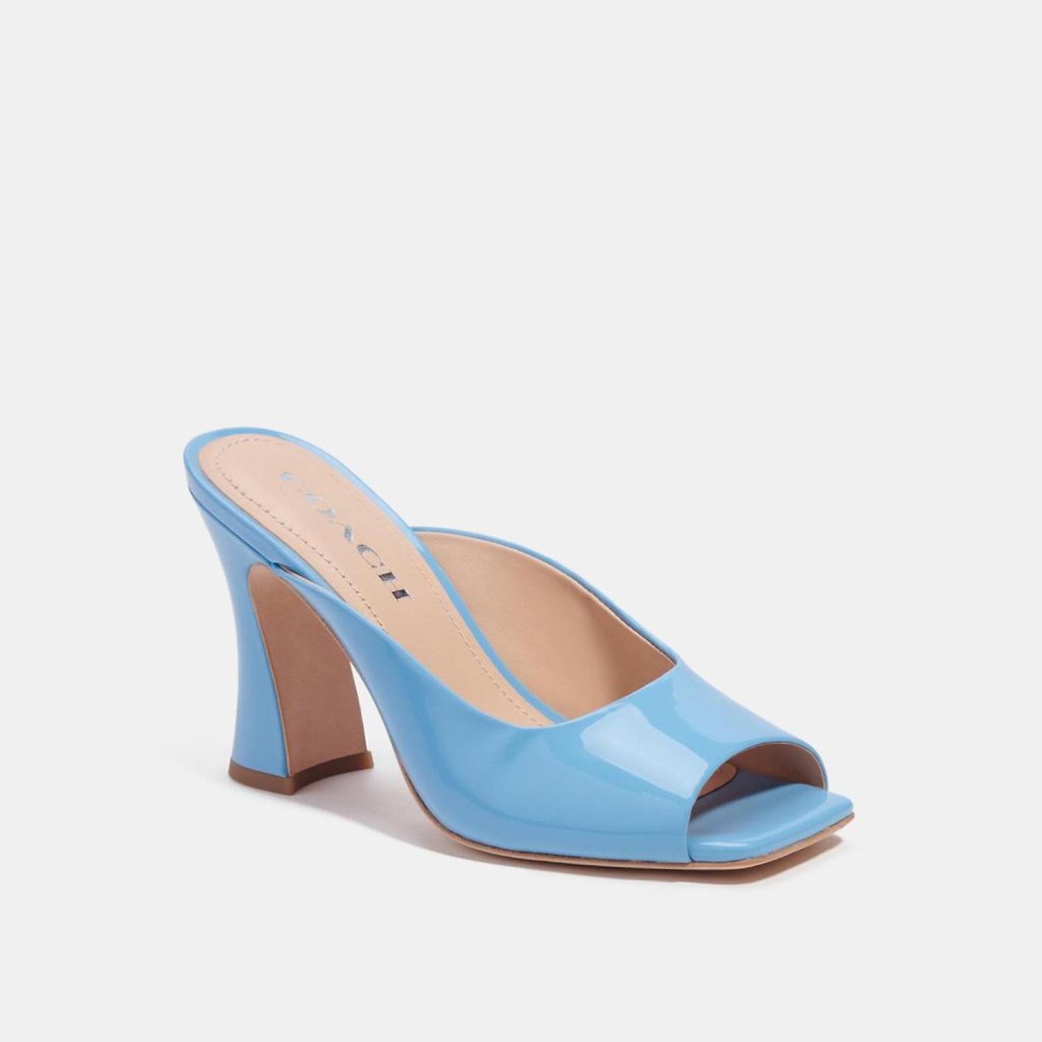 • Patent leather upper Leather lining and footbed Leather outsole Slip on 3 1/2 heel Style No. CI230 | Coach Outlet Laurence Sandal - Blue, Size - 6