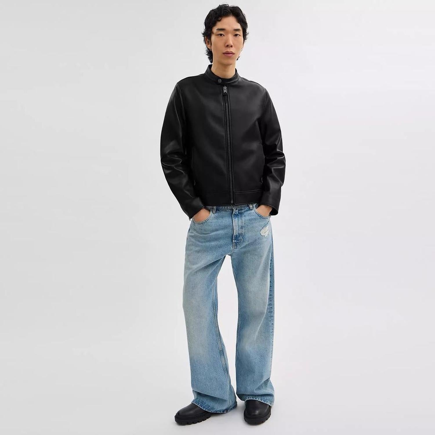 • 100% sheep leather Body lining - 58% polyester 42% viscose Sleeve lining - 56% recycled polyester 44% viscose Leather details Zip and snap closures Zip pockets Length - 25 Clean by leather specialist Model is 6'2 (188cm) and wears a size M Style No. CU407 | Coach Outlet Leather Racer - Black, Size - Medium