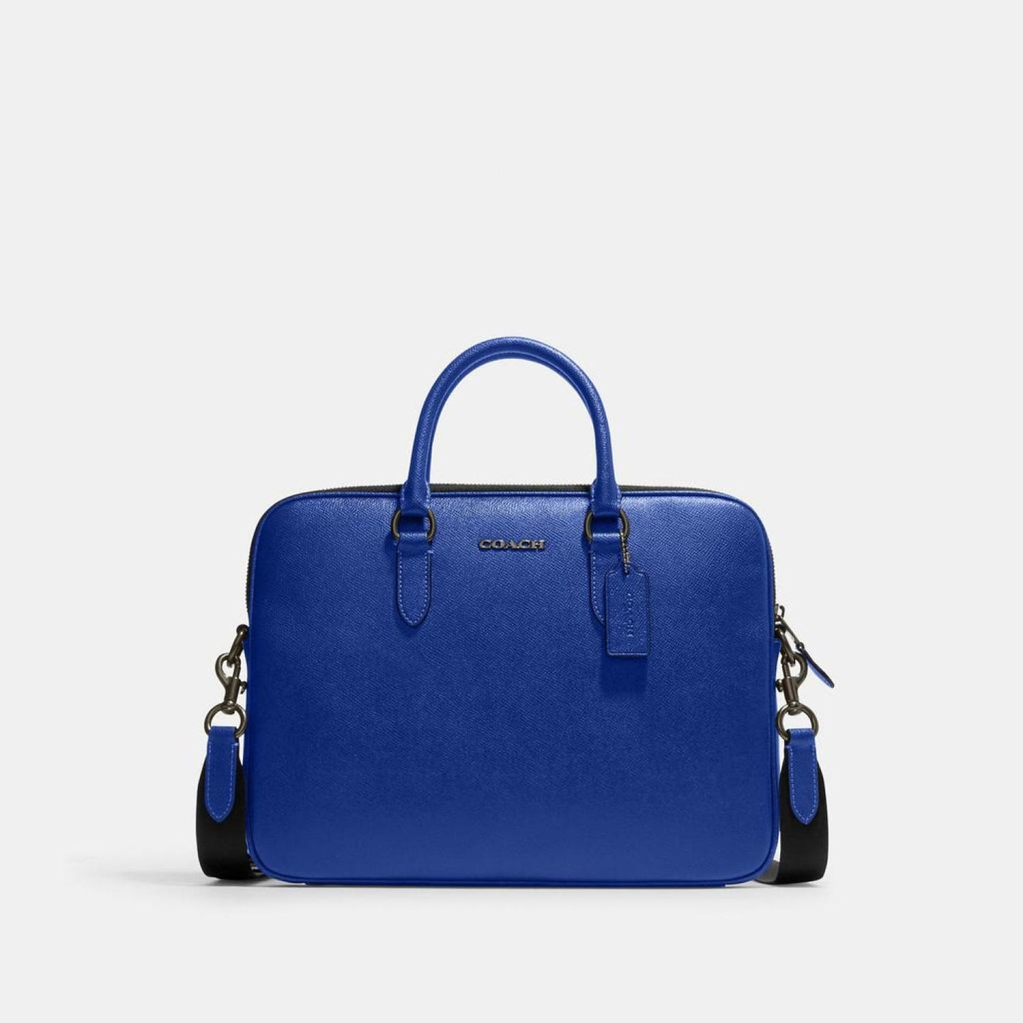 Crossgrain leather Inside zip and multifunction pockets Zip closure fabric lining Handles with 3 1/2 drop Outside open pocket Detachable strap with 27 1/2 drop for shoulder or crossbody wear 13 (L) x 9 3/4 (H) x 1 (W) Style No. CJ652 | Coach Outlet Liam Compact Brief - Blue