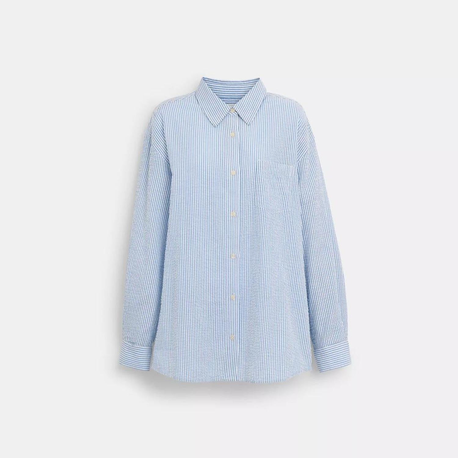 100% cotton Button closure Chest pocket Length - 29 1/4 Machine wash Model is 5'10 (178cm) chest 31 (79cm) waist 24 (61cm) hips 35 (89cm) and wears a size S Style No. CT413 | Coach Outlet Striped Seersucker Button Down Shirt - Blue, Size - Small
