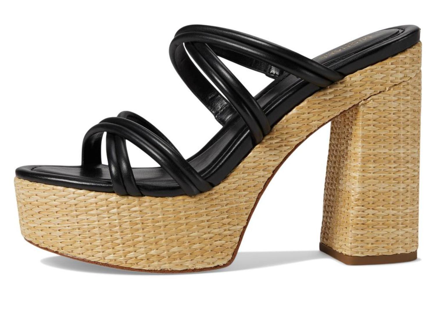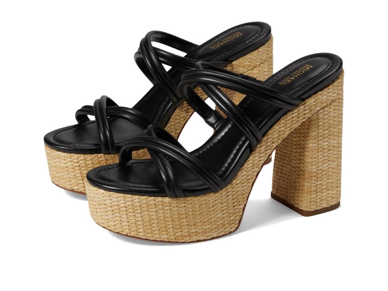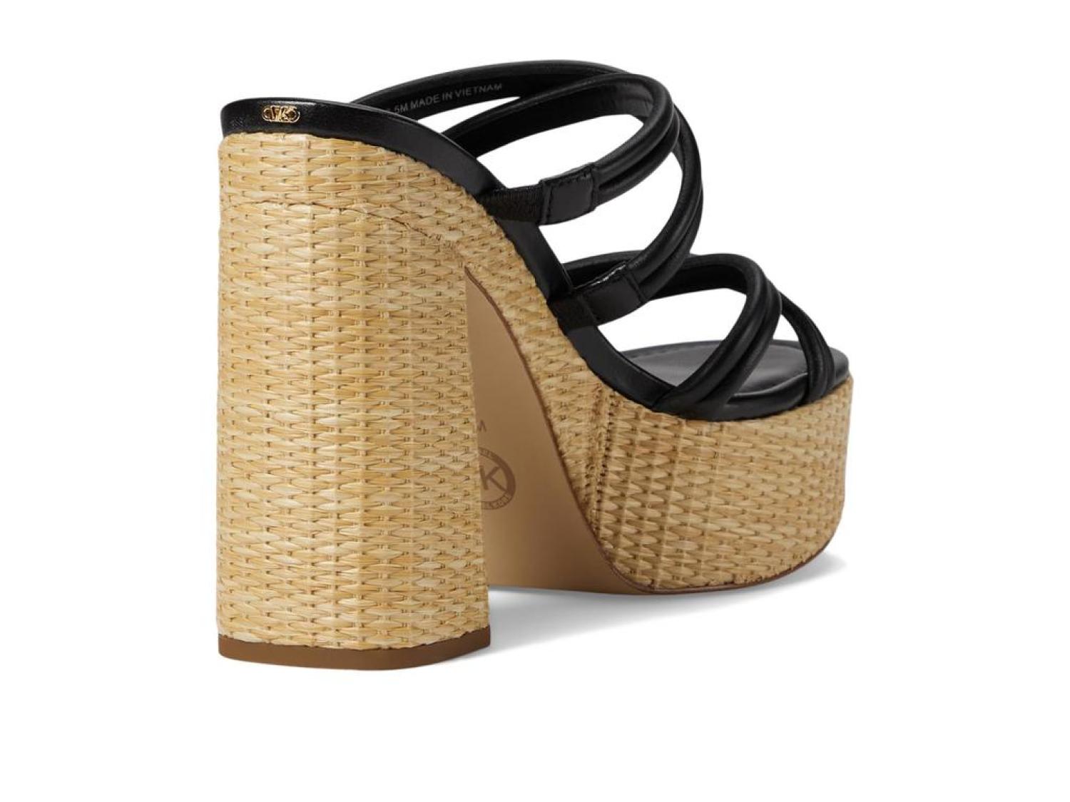 • Walk the runway of style and sophistication wearing the MICHAEL Michael Kors® Corrine Platform. Crafted from leather upper, faux leather lining and synthetic insole, this pair of sandals features open round toe, extra padded sock and cushioned comfort footbed with empire stud hardware branding on heel rand. These platform slide sandals come with wrapped raffia detailing.
