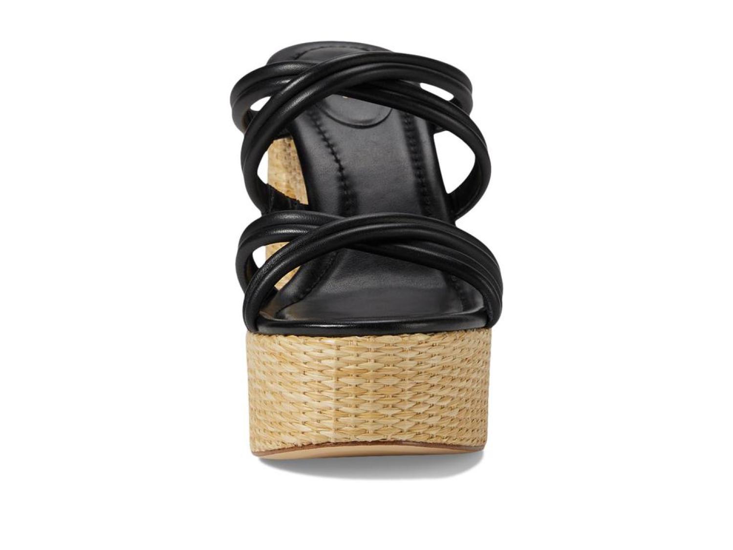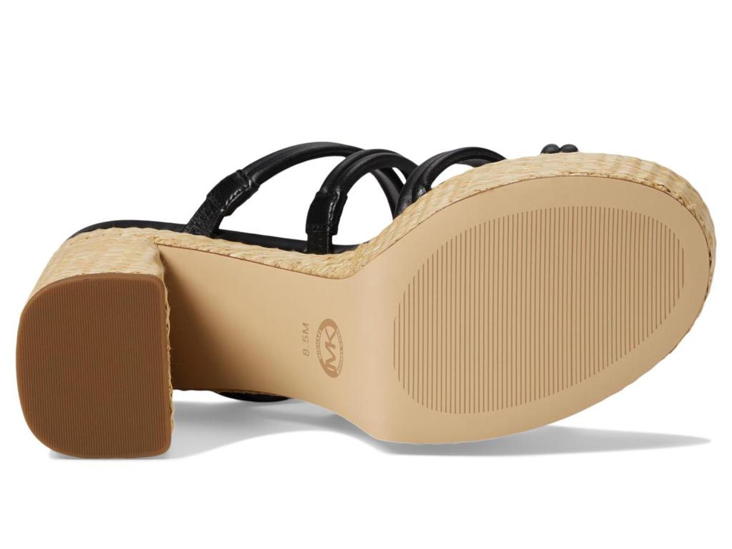 Walk the runway of style and sophistication wearing the MICHAEL Michael Kors® Corrine Platform. Crafted from leather upper, faux leather lining and synthetic insole, this pair of sandals features open round toe, extra padded sock and cushioned comfort footbed with empire stud hardware branding on heel rand. These platform slide sandals come with wrapped raffia detailing.