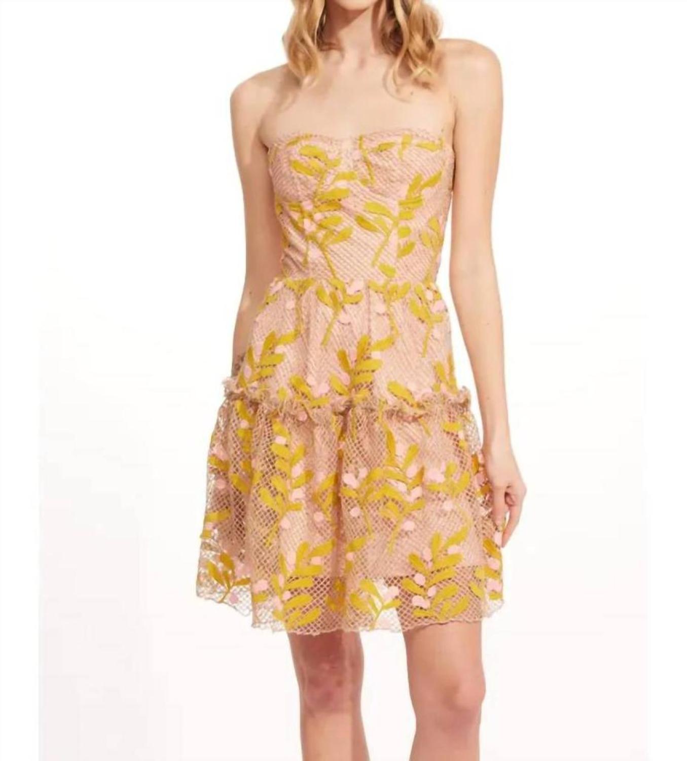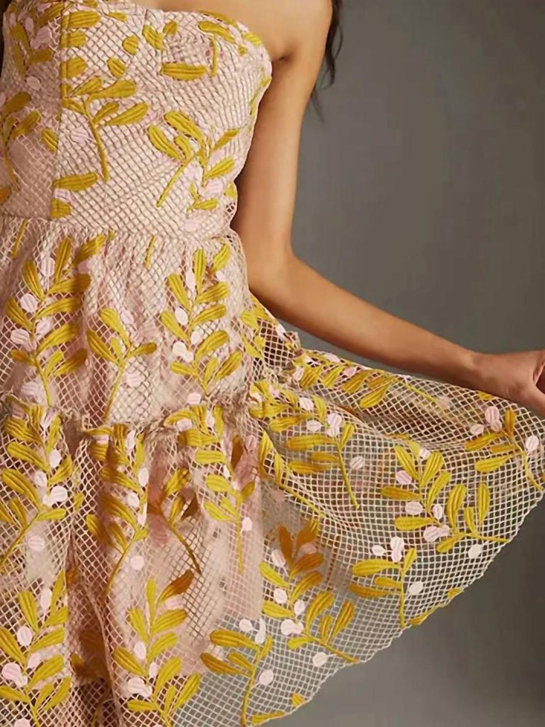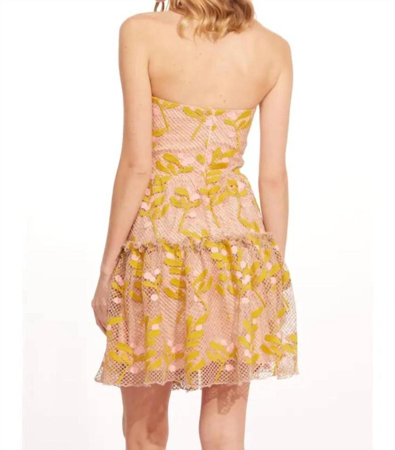 • A short and breezy dress for those warmer days.Parisien-inspired, the Cossette Dress comes in a mini length, corset style and is crafted from a beautiful cotton lace net fabric with golden embroidered flowers. Fully lined. Strapless corset top. 100% Cotton. Mini length. Back zip