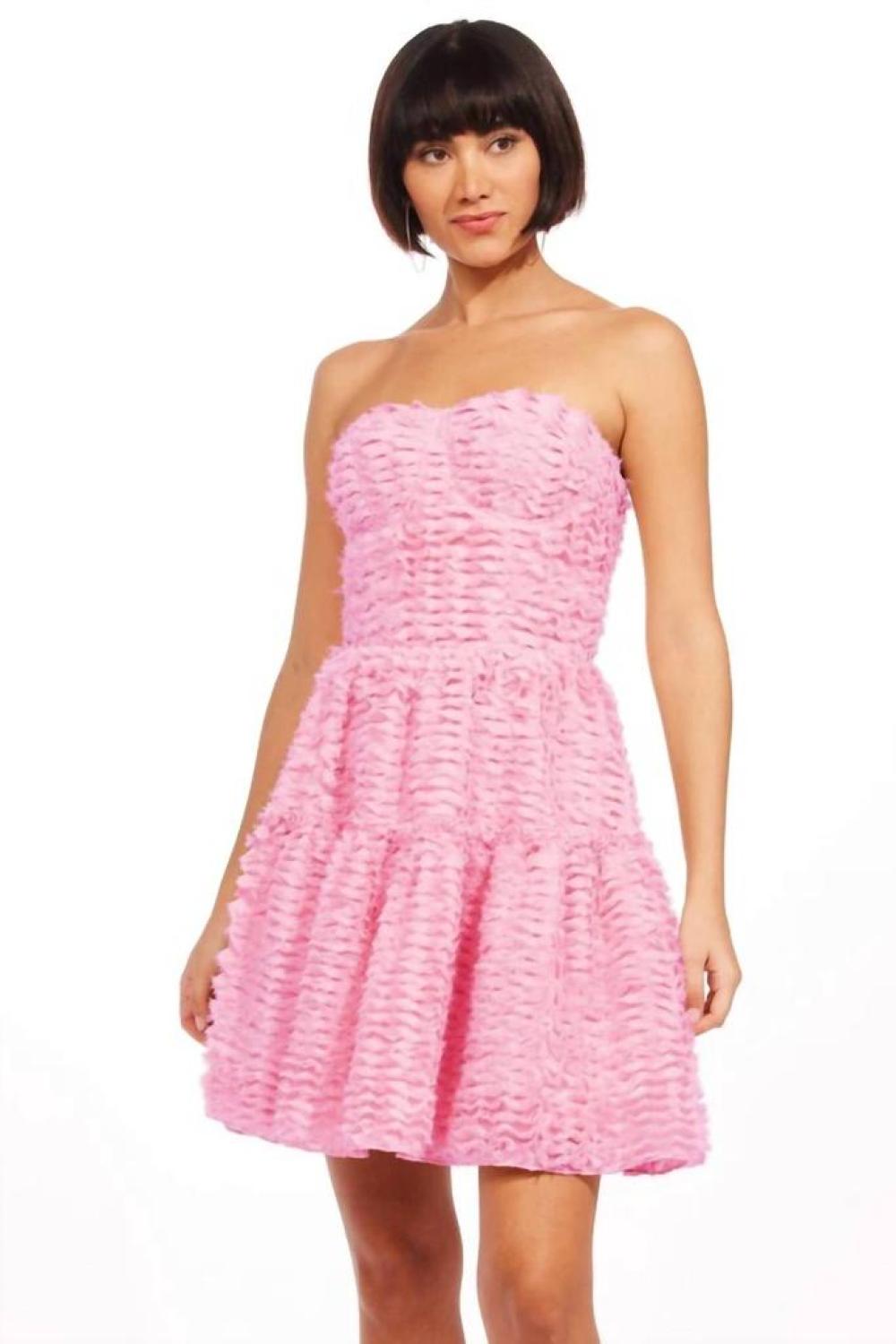 A strapless dress so versatile you can dress it up with heels or wedges, or give off a more casual vibe with flats.Sweet like a dessert, the souffle cossette collection is a stunning mini strapless fit and flare dress. Whether you are stepping out for high tea or a special occasion, this corset style is crafted from a beautiful chiffon that has been meticulously cut into strips and then sewn onto the fabric to achieve a very plush 3D feeling to it. Rear zip Fitted corset Boning on the side Full skirt Raw hem 100% Polyester Lining - 100% Polyester