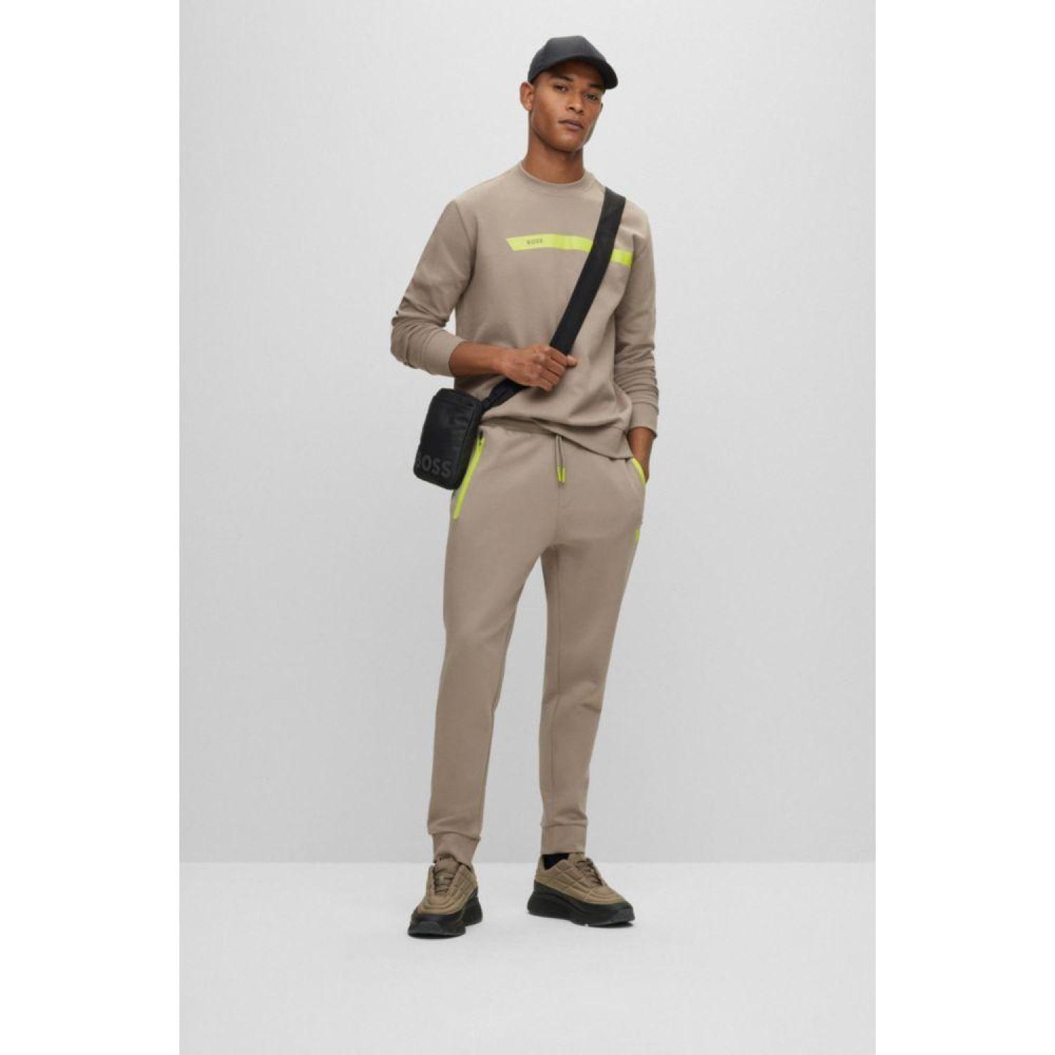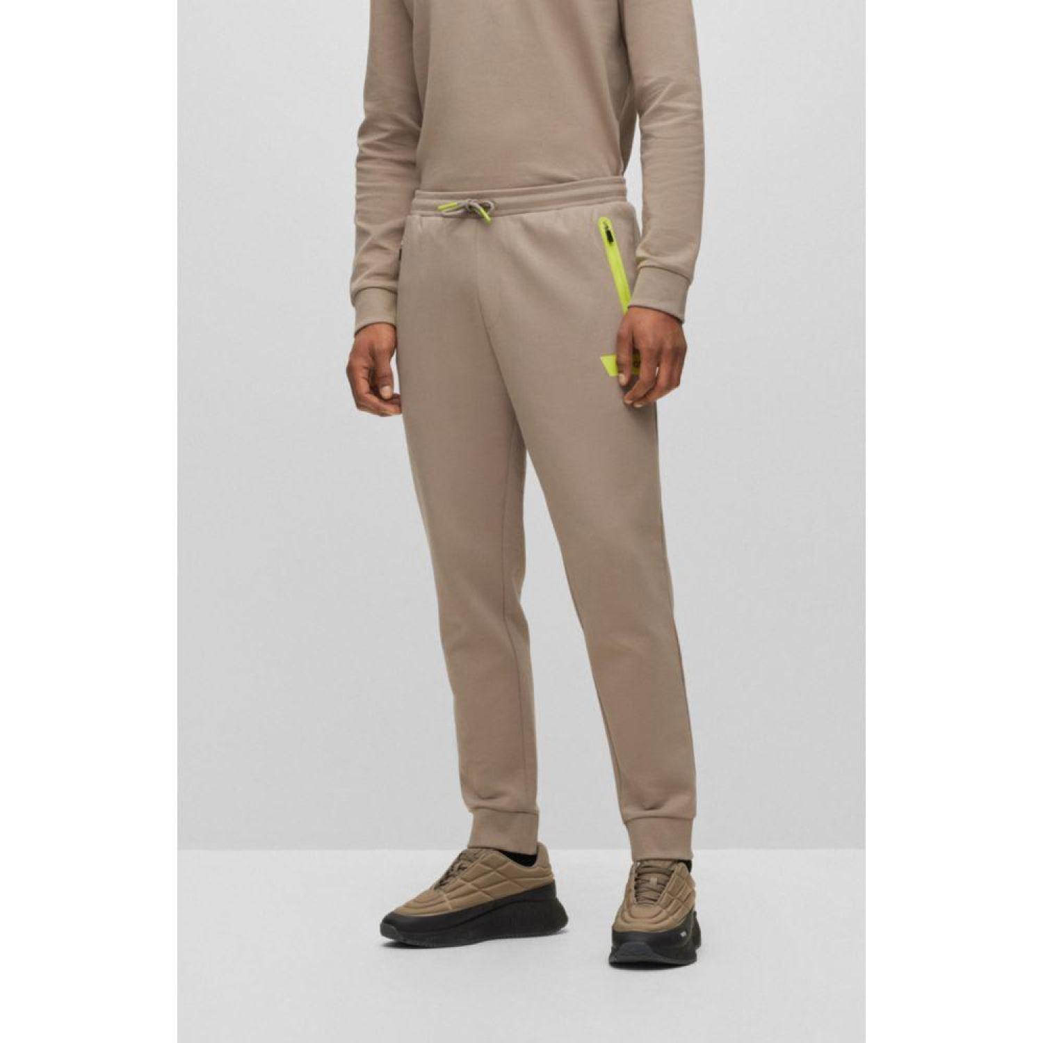 • Cuffed regular-fit tracksuit bottoms in stretch jersey with glued pocket-zip frames and a branded graphic stripe by BOSS Menswear. For our RESPONSIBLE products, we always use at least 60% more sustainable raw materials.This product is made from cotton that has been farmed according to our HUGO BOSS cotton and plant fibers commitment, from sources with improved management practices to benefit people and the environment.