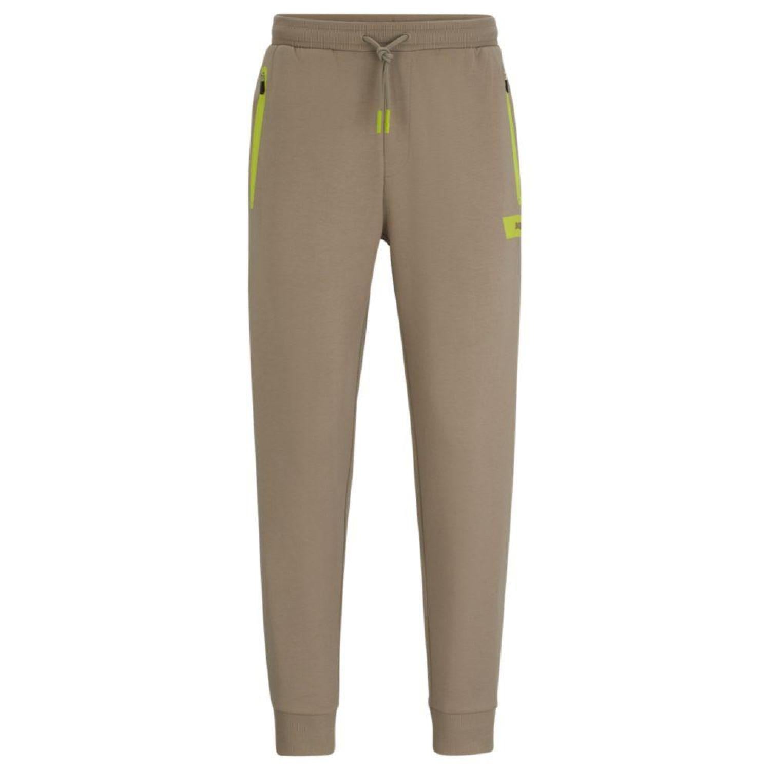 Cuffed regular-fit tracksuit bottoms in stretch jersey with glued pocket-zip frames and a branded graphic stripe by BOSS Menswear. For our RESPONSIBLE products, we always use at least 60% more sustainable raw materials.This product is made from cotton that has been farmed according to our HUGO BOSS cotton and plant fibers commitment, from sources with improved management practices to benefit people and the environment.
