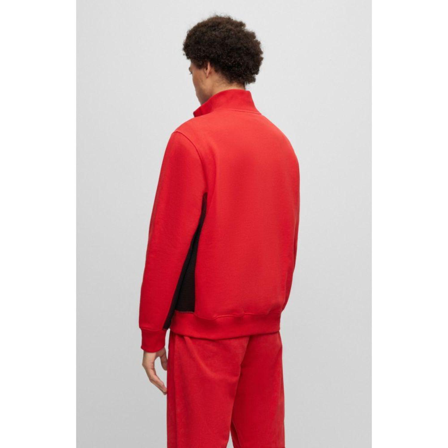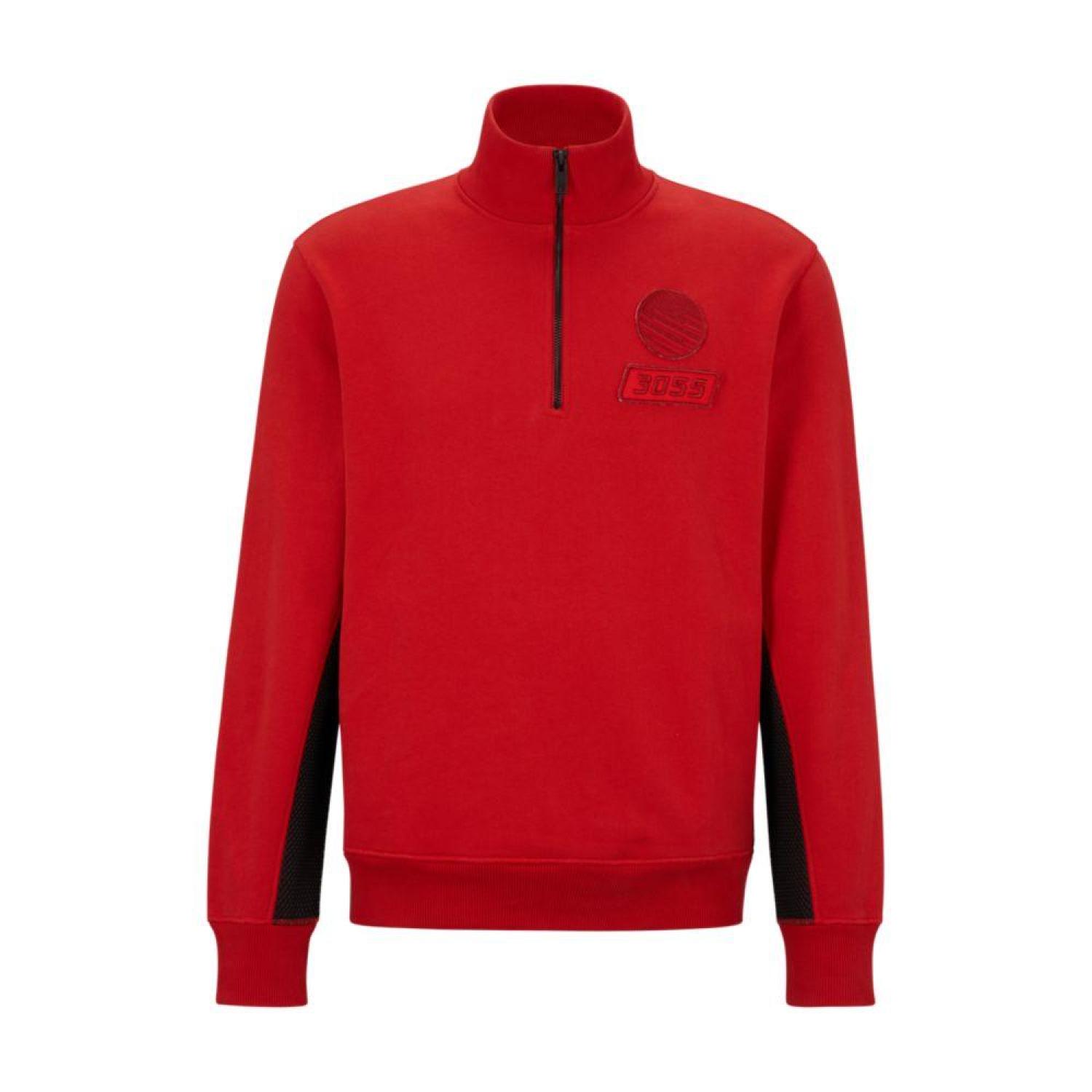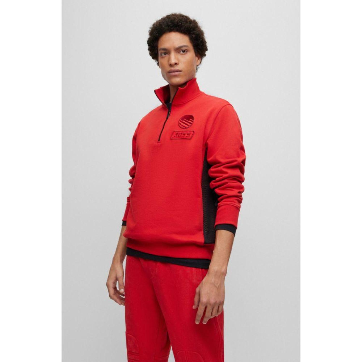 A zip-neck sweatshirt cut to a relaxed fit in French-terry cotton with mesh panels and racing-inspired badges by BOSS Menswear.