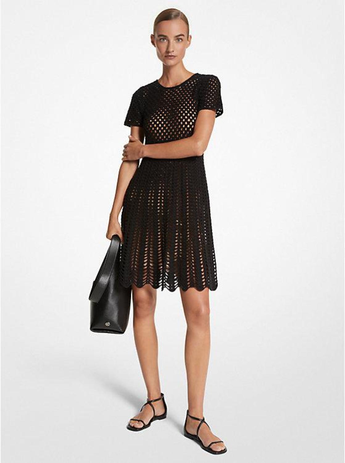 • The joy of vacationing inspires the making of this dress, which is intricately crocheted from an Italian cashmere and cotton blend. Contrasting stitches accentuate the open-weave design, while the scalloped hem provides a romantic finish. Slip it on over a swimsuit before heading to the beach.