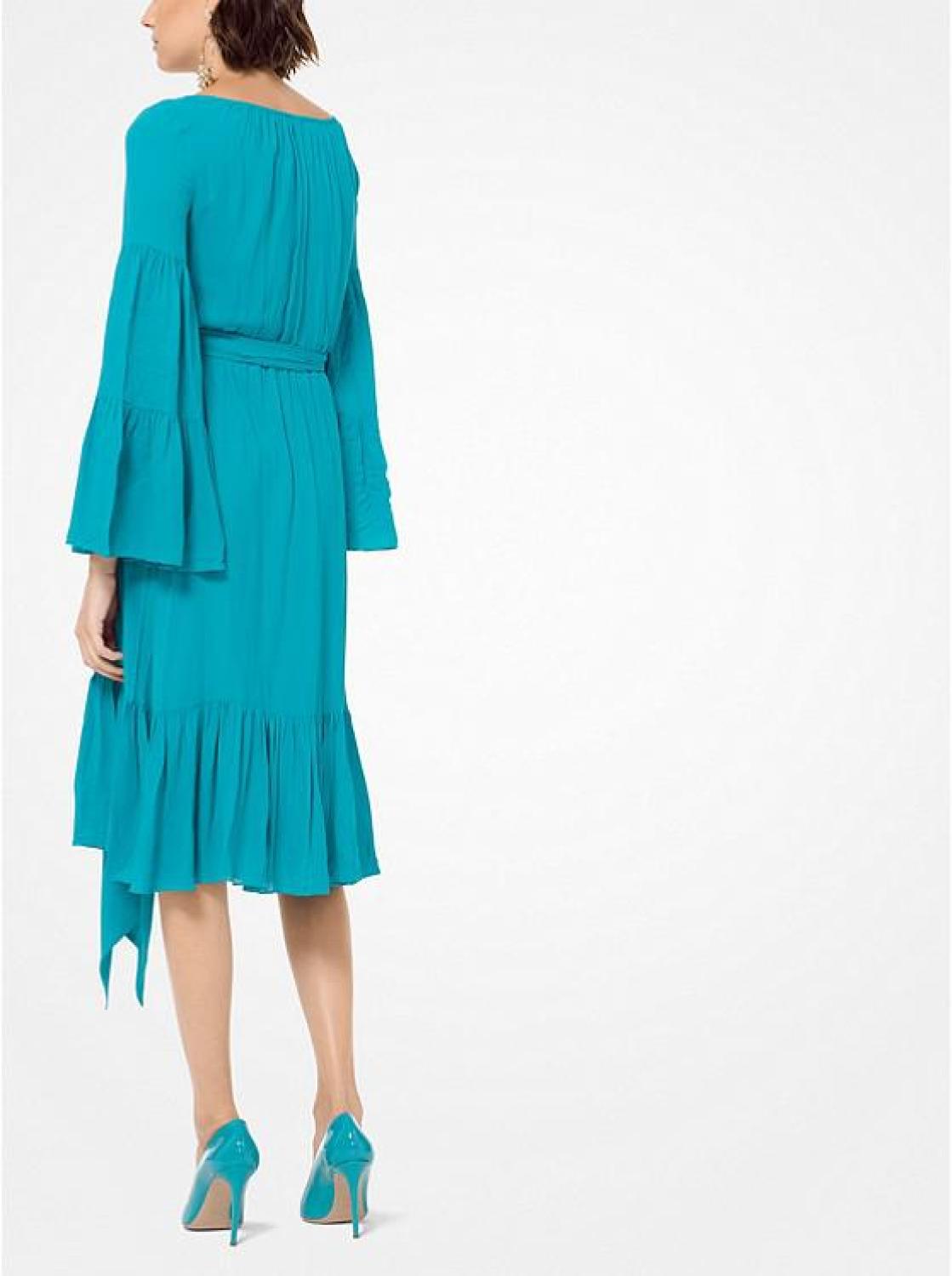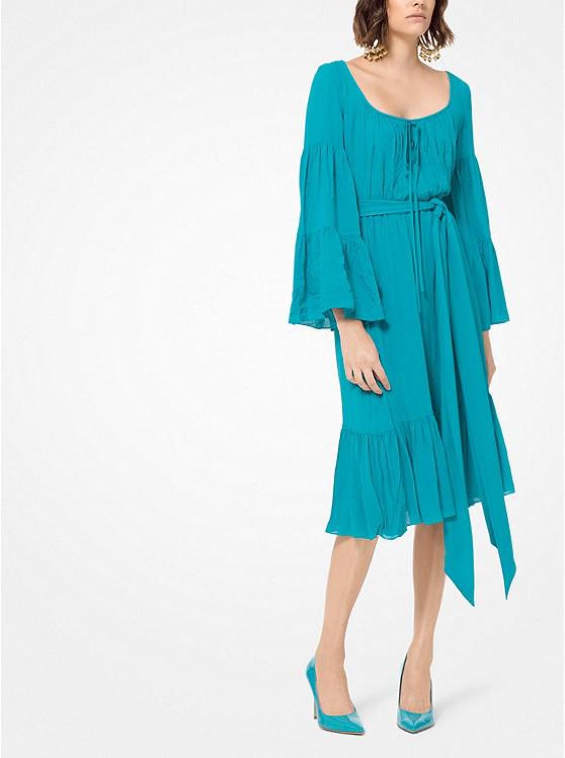 • Effortless and romantic, this peasant dress is an essential for an island getaway. It’s cast in crushed silk-georgette with a tie neckline and tiered sleeves, and features a matching sash to cinch the waist. Made in Italy.