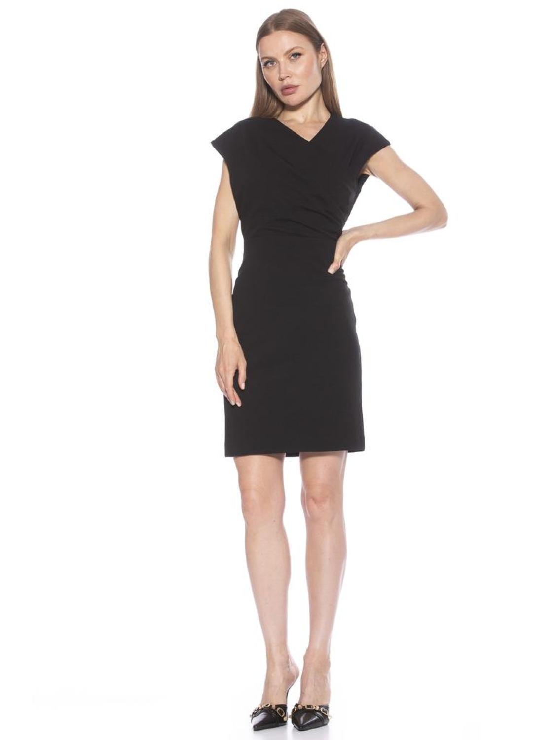 Daisy Dress is a mini dress is crafted with a cap sleeve, V-neck, and gracefully draped bodice to create a stunning figure flattering silhouette. PRODUCT FEATURES Cap Sleeve V-neck Draped Bodice Fitted Dress Mini Dress 95% Polyester, 5% Spandex Machine Wash Imported Style D5000