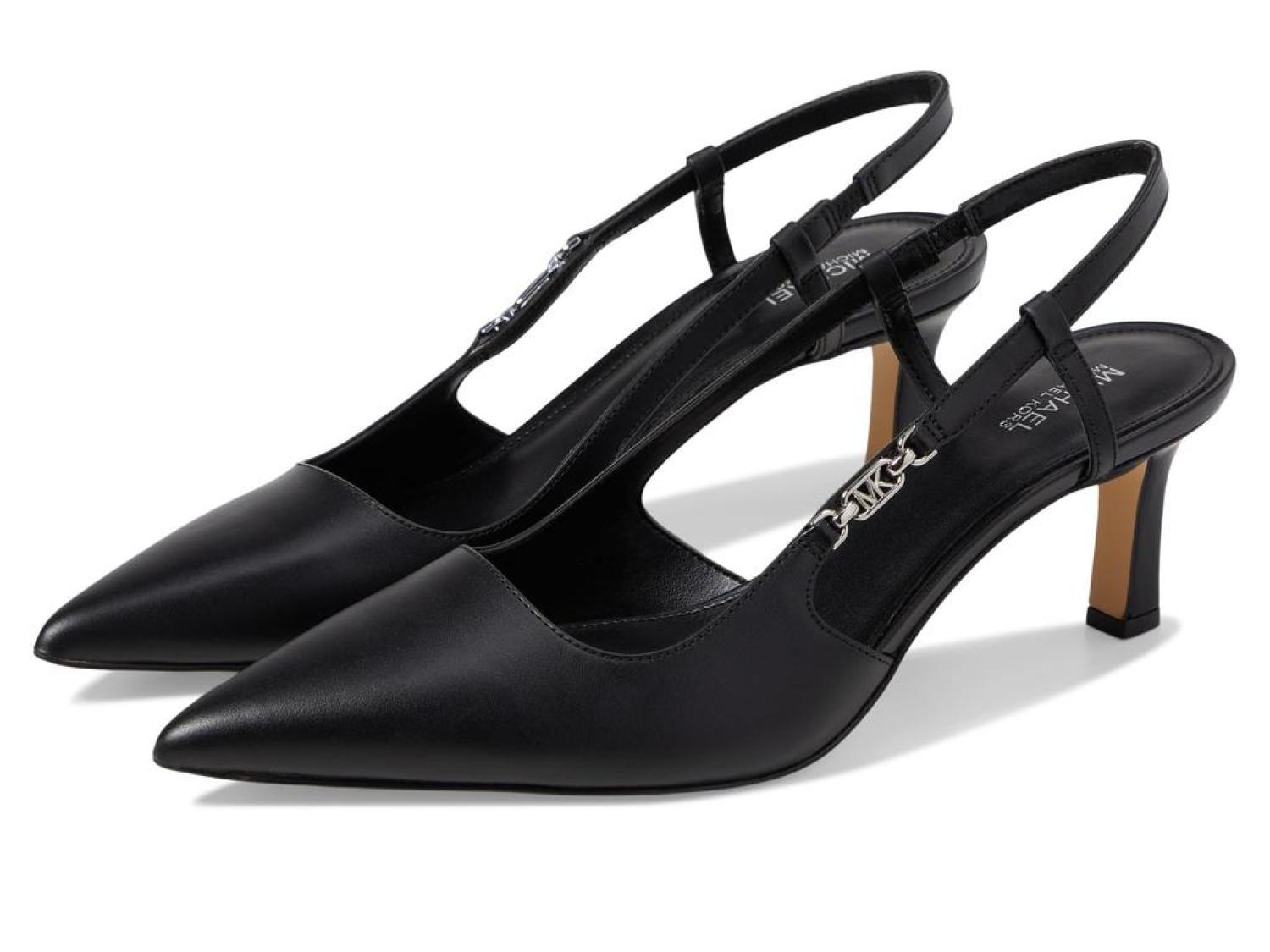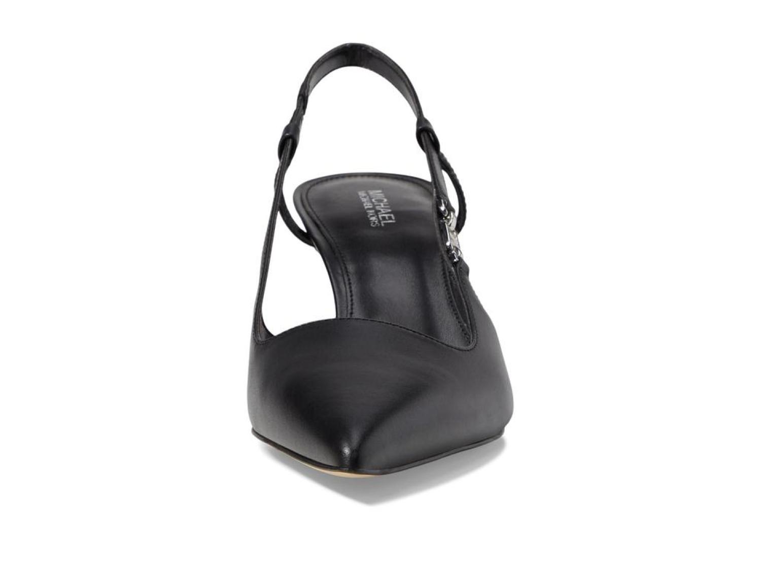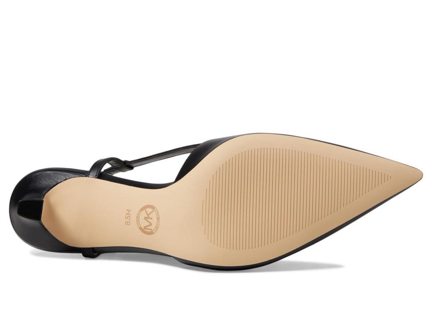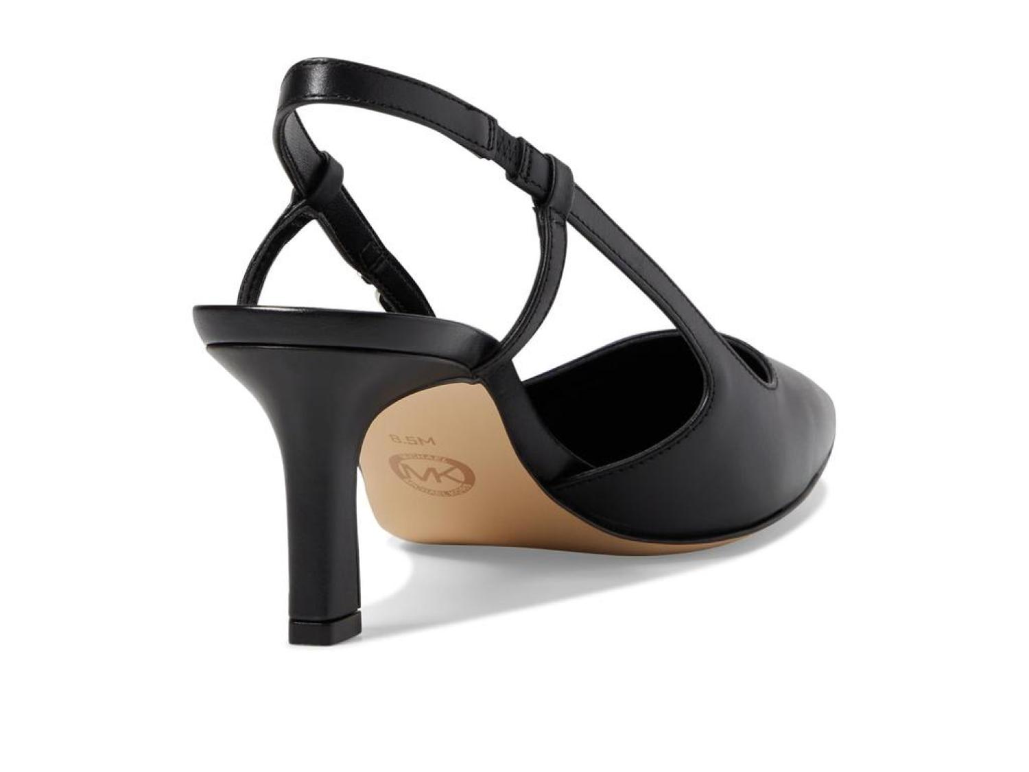 Be ready to slay in style donning the MICHAEL Michael Kors® Daniella Mid Sling. These stiletto pairs of heels feature pointed toe design, elasticized slingback strap closure, and Lightly padded synthetic insole. Leather upper. Faux leather lining. Brand detailing on the footbed. Rubber outsole. Imported.