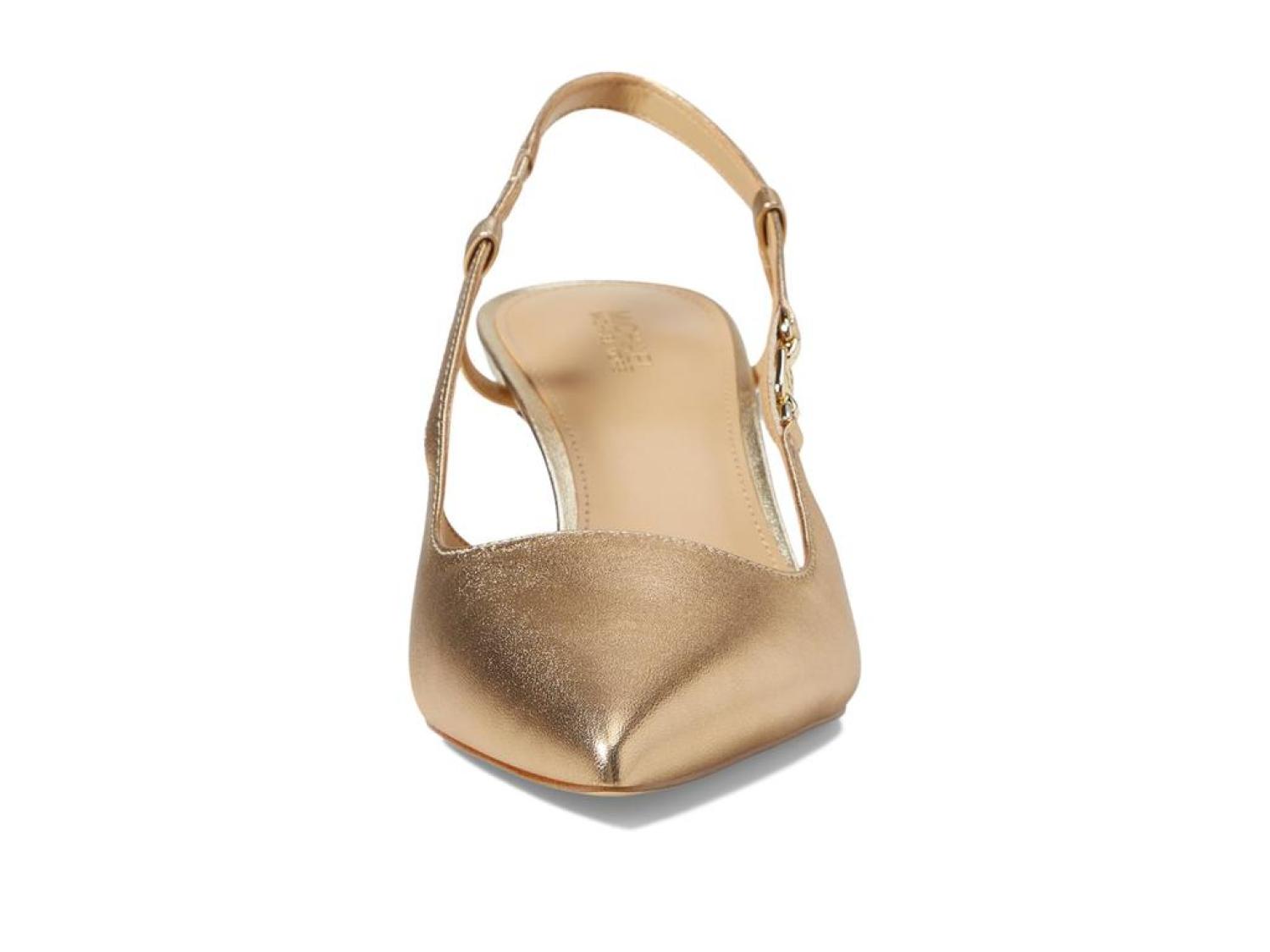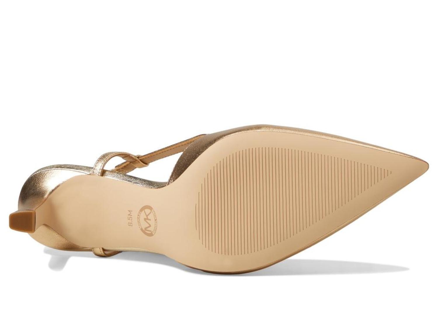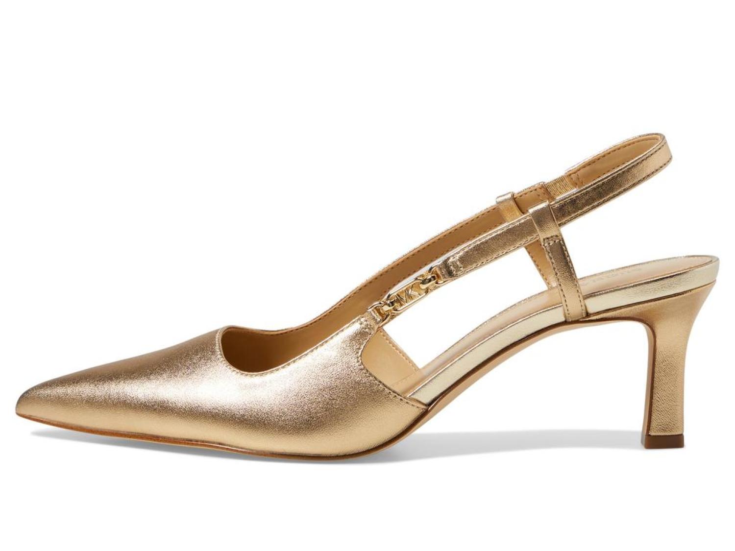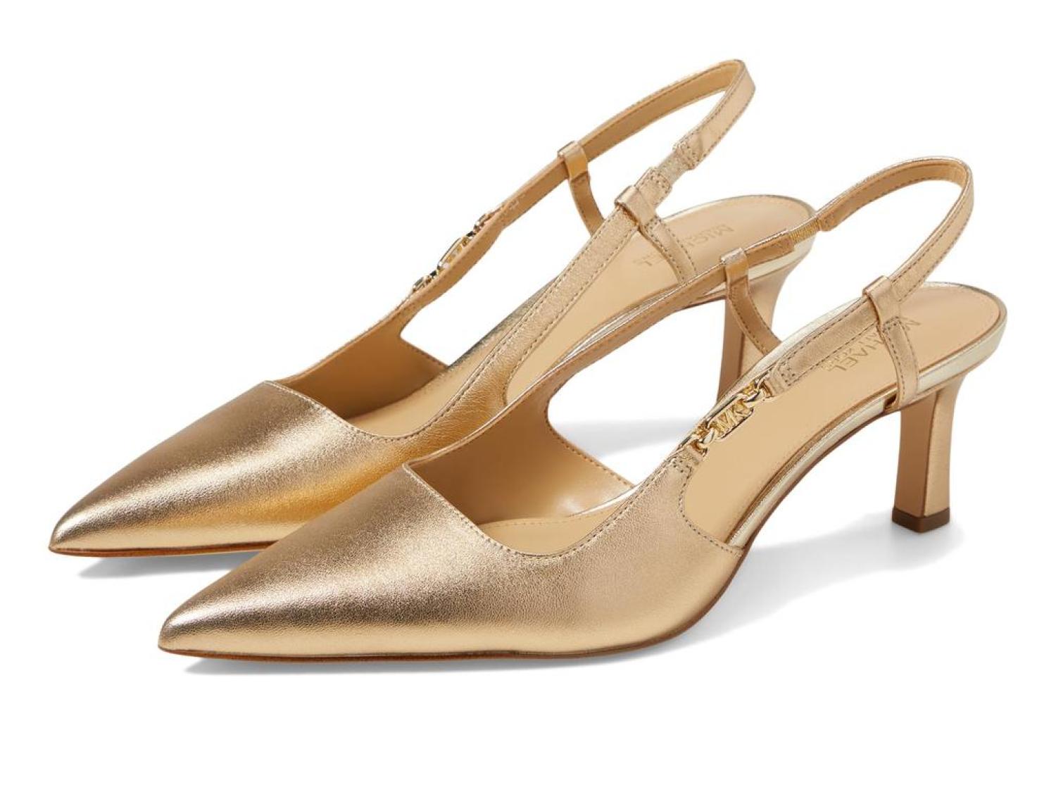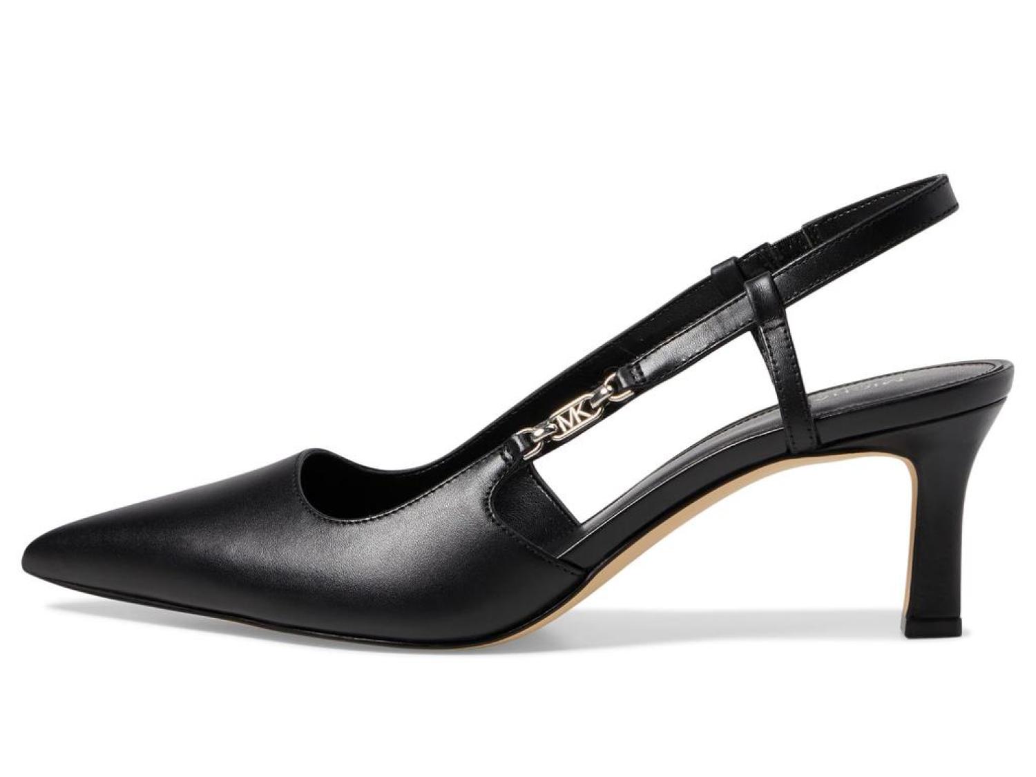 Be ready to slay in style donning the MICHAEL Michael Kors® Daniella Mid Sling. These stiletto pairs of heels feature pointed toe design, elasticized slingback strap closure, and Lightly padded synthetic insole. Leather upper. Faux leather lining. Brand detailing on the footbed. Rubber outsole. Imported.