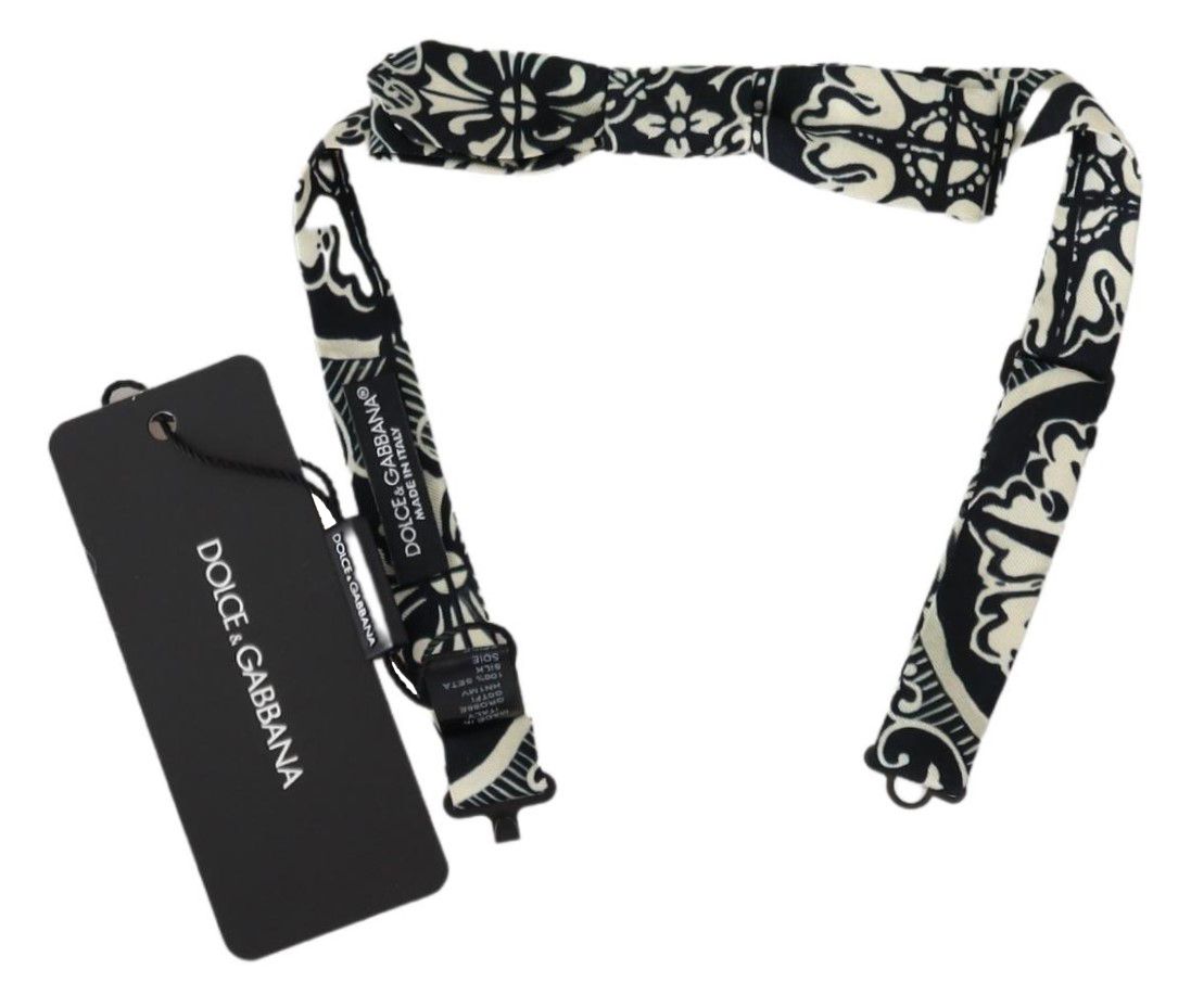Exude elegance with this authentic Dolce & Gabbana black silk bow tie, perfect for adding a touch of luxury to any formal ensemble. This 100% silk tie features a classic Sicily pattern and is expertly crafted in Italy. Designed to provide a seamless fit with an adjustable neck strap, this bow tie offers both timeless style and comfort.