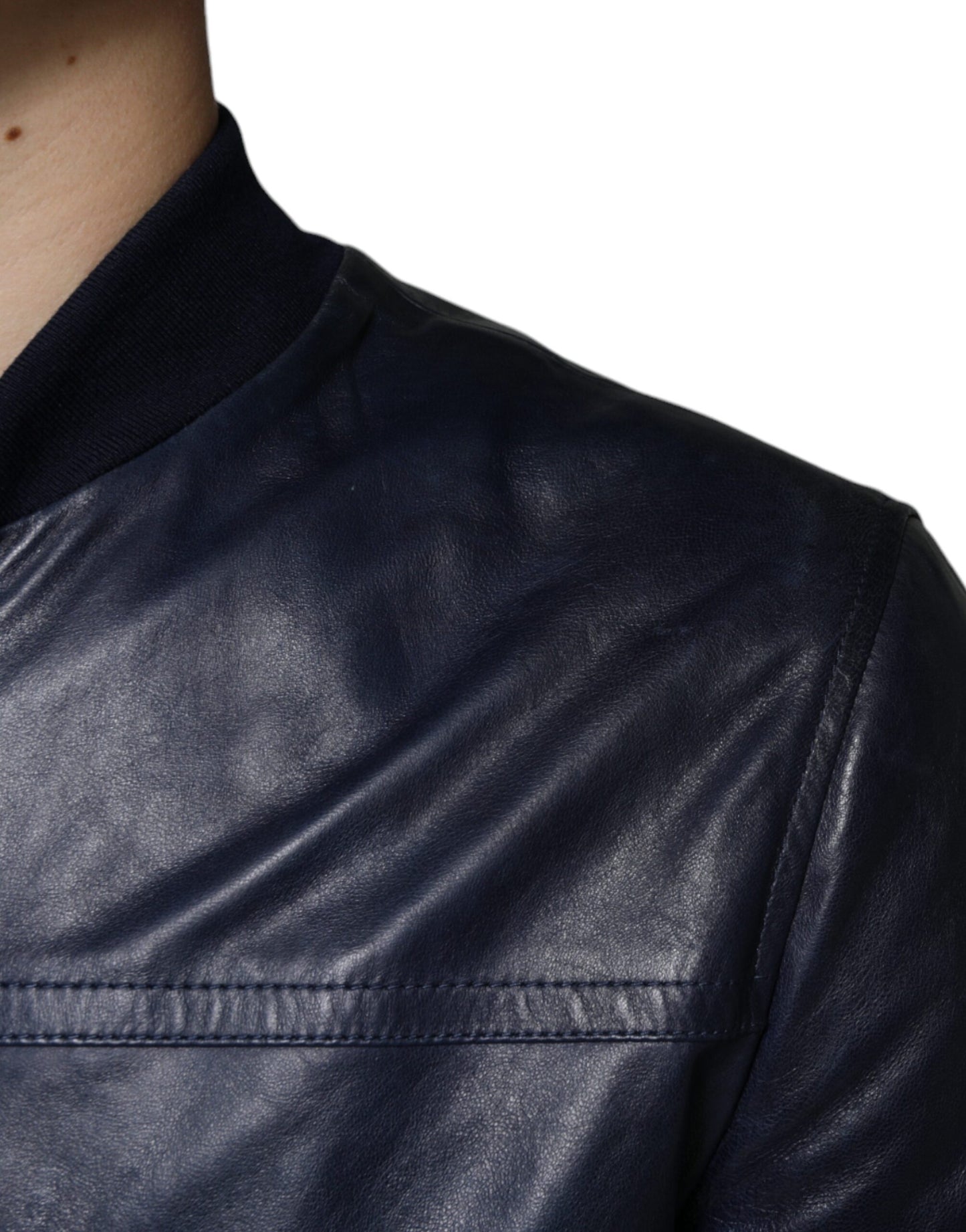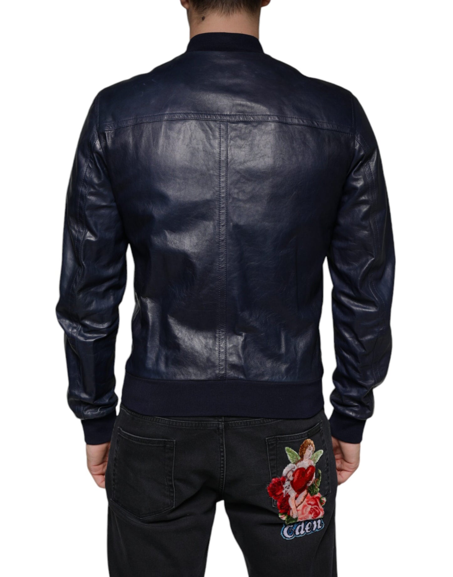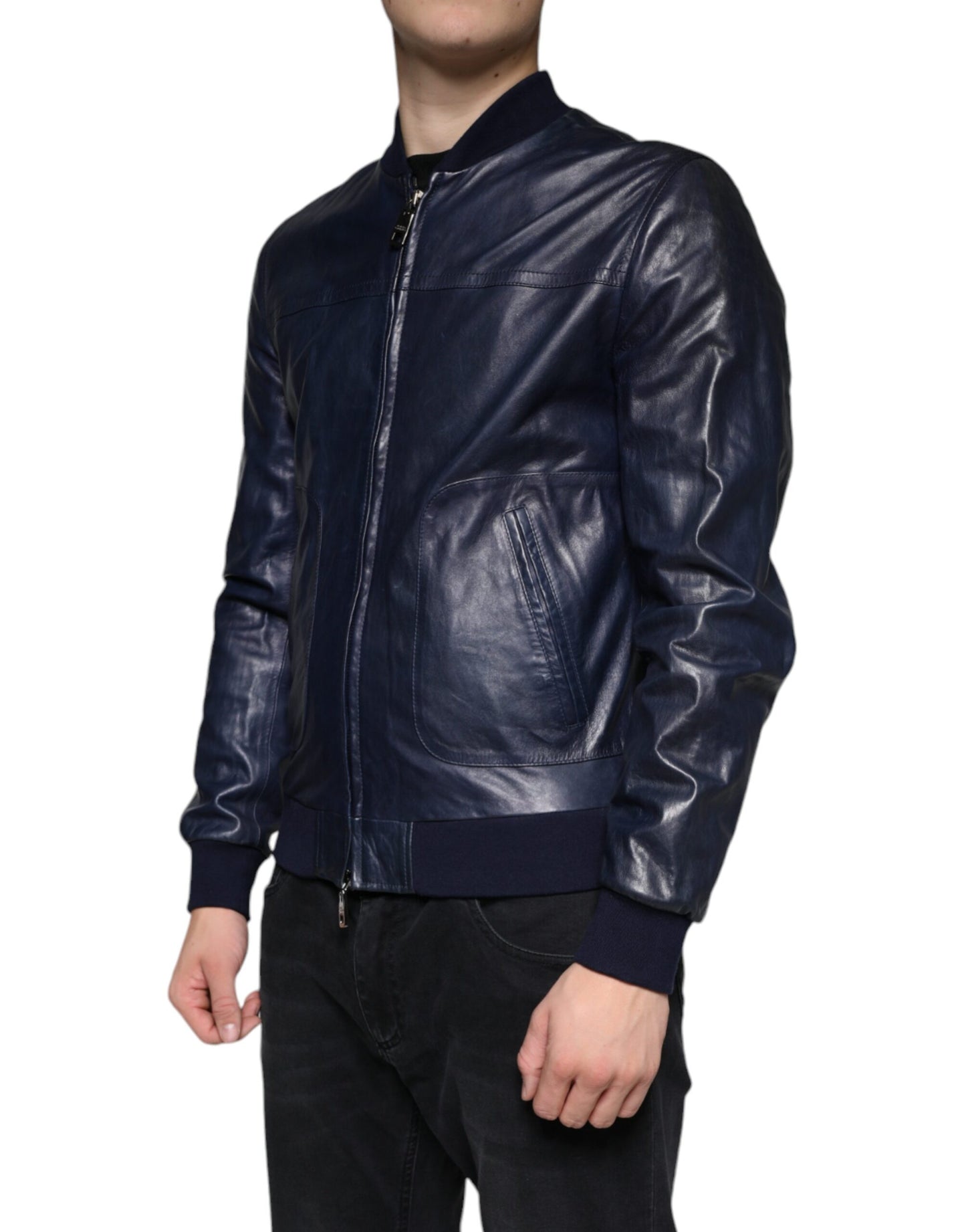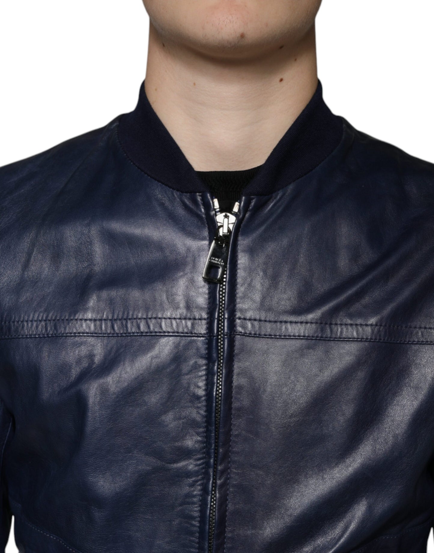 Dolce & Gabbana Blue Lambskin Leather Full Zip Biker Jacket