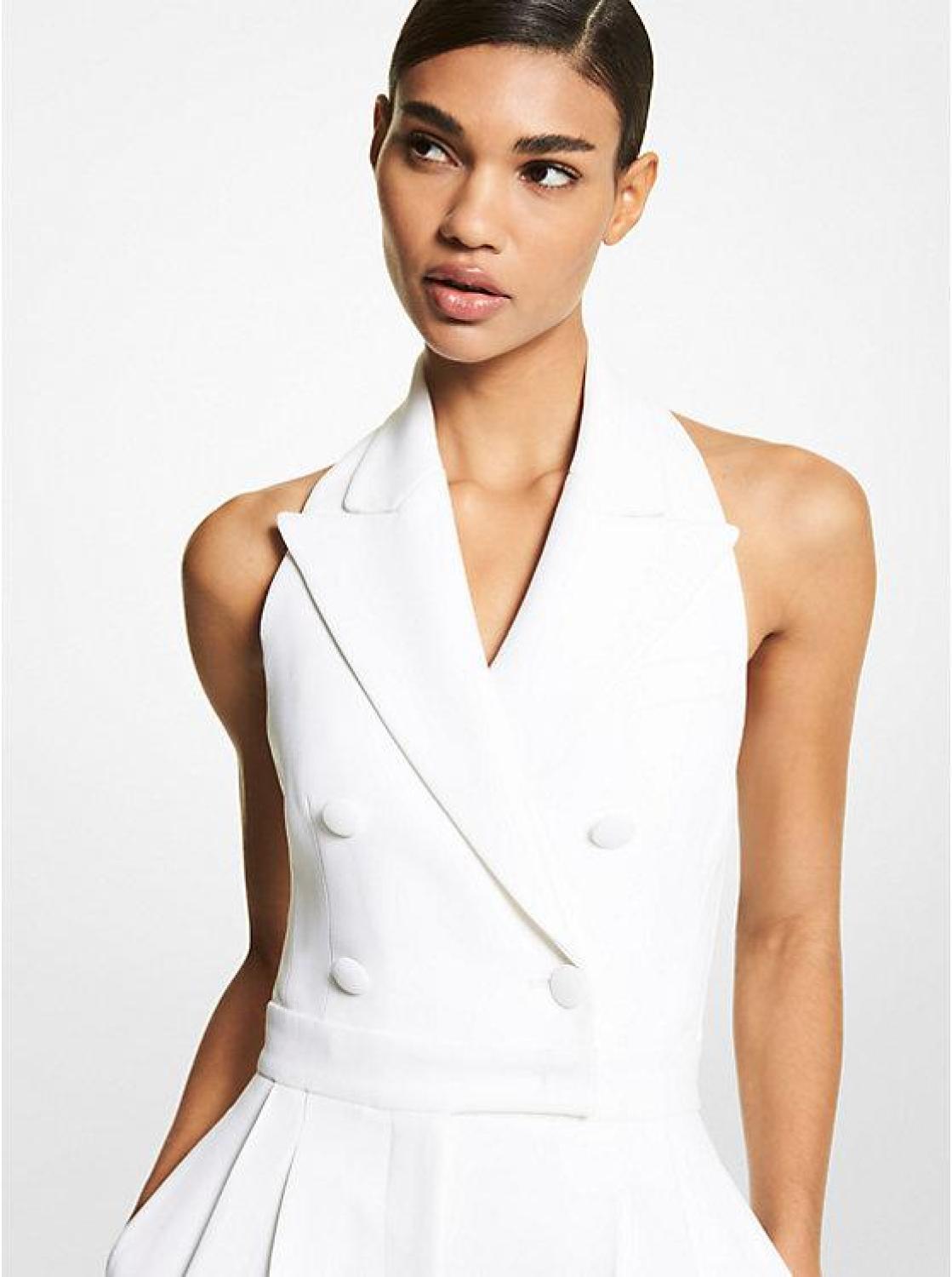 • With precise tuxedo tailoring, this halter jumpsuit is a chic and flattering option for your next special affair. Made in Italy from double crepe sablé, the fitted bodice features notched lapels and fabric-covered buttons that nod to menswear suiting. Keep emphasis on the straight-leg pants with understated sandals.
