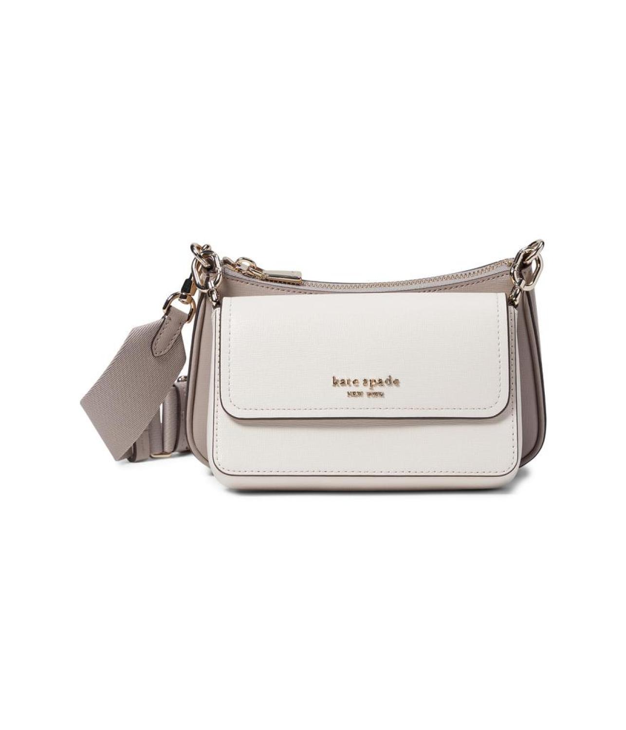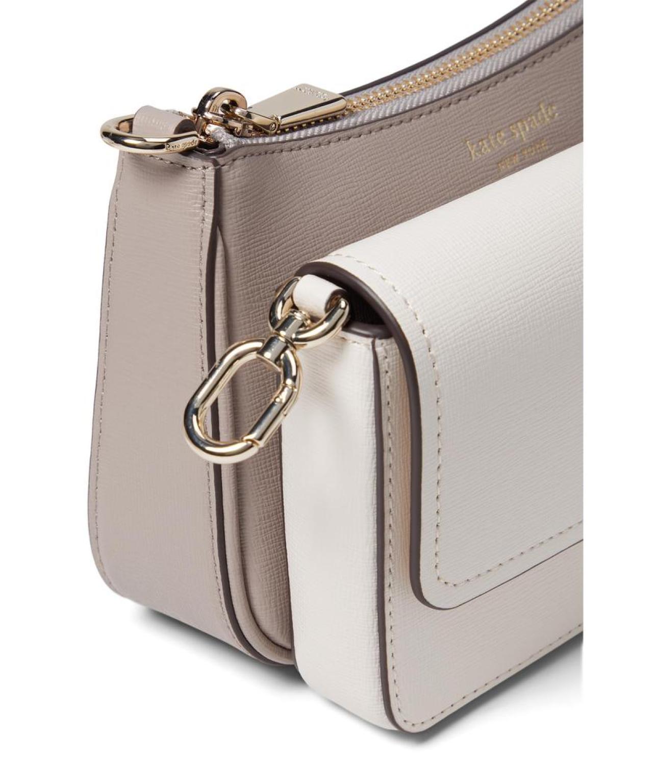Complete your ensemble with the Kate Spade New York® Double Up Color-Blocked Saffiano Leather Double Up Crossbody. Crafted in textured leather, it boasts a top zip closure and a removable, adjustable crossbody strap for personalized style. The foil-embossed logo adds glamor, while the detachable wallet with magnetic snap flap and internal slip pockets offers practical elegance. The two-way jacquard lining completes this chic accessory, making it a must-have for those who appreciate both style and functionality.
