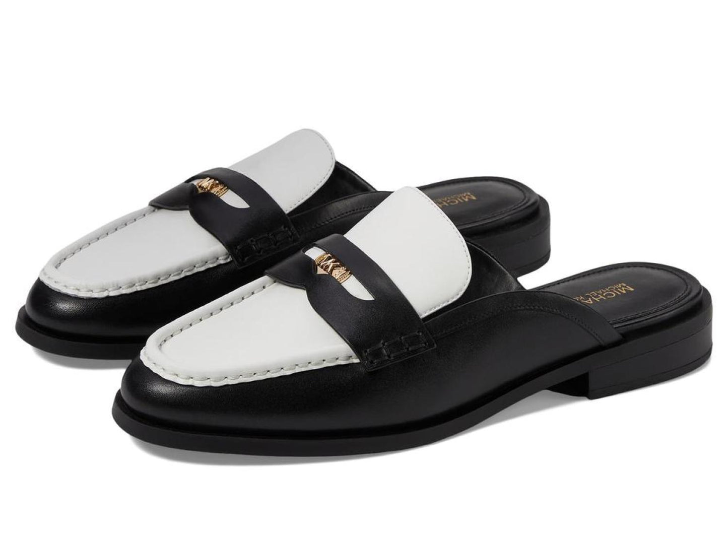 Exude class and sophistication with every step you take wearing MICHAEL Michael Kors® Eden Mule that features a moc toe shape and an attractive metal hardware logo detailing. The slip-on style mules are crafted with a leather upper with color-block detailing, synthetic lining, and synthetic insole. Signature branding on the insole. Block heel. Synthetic outsole. Imported. Product measurements were taken using size 8.5, width M. Please note that measurements may vary by size. Measurements: Heel Height: 1 in Weight: 11 oz-