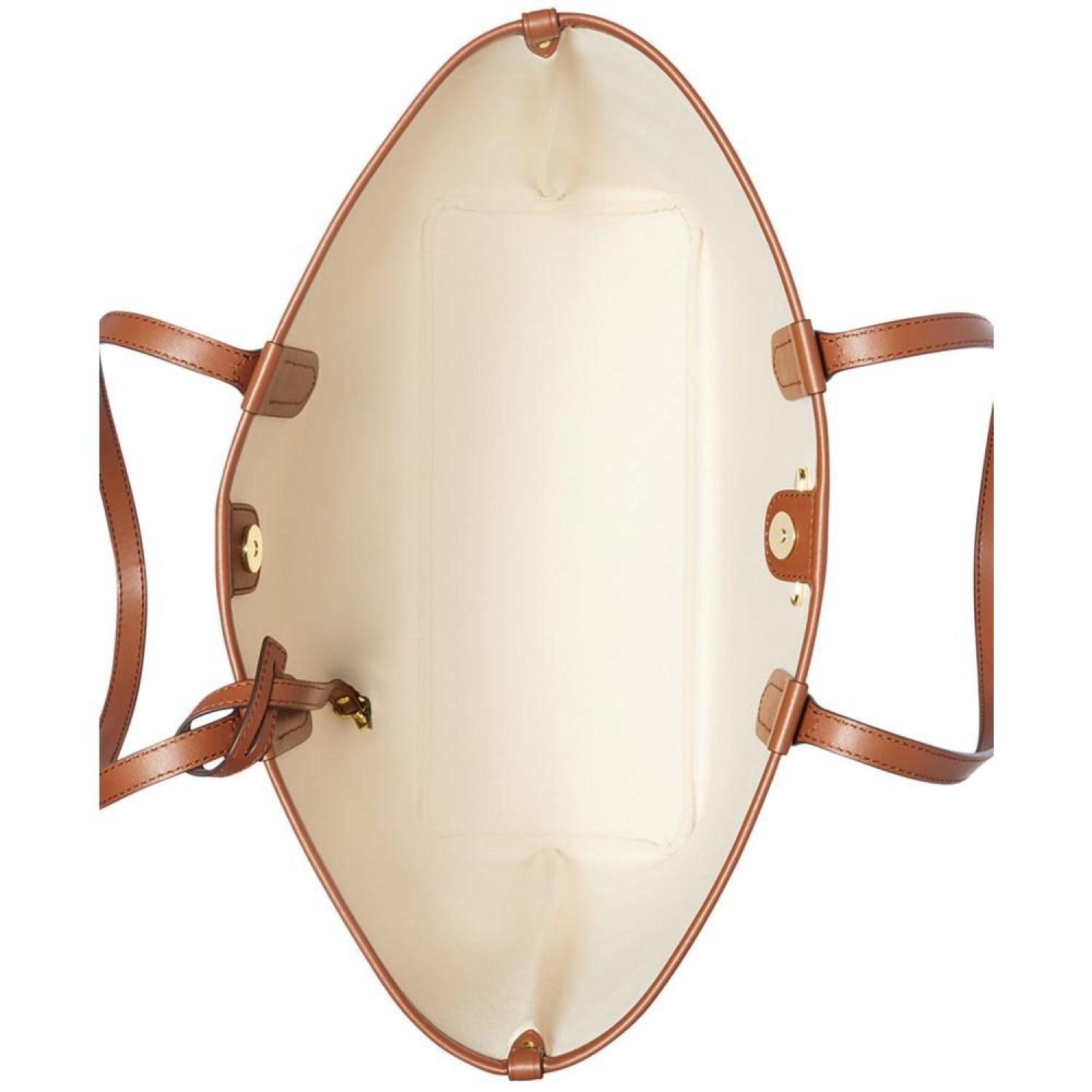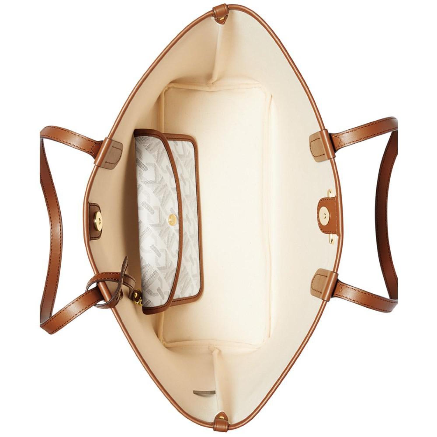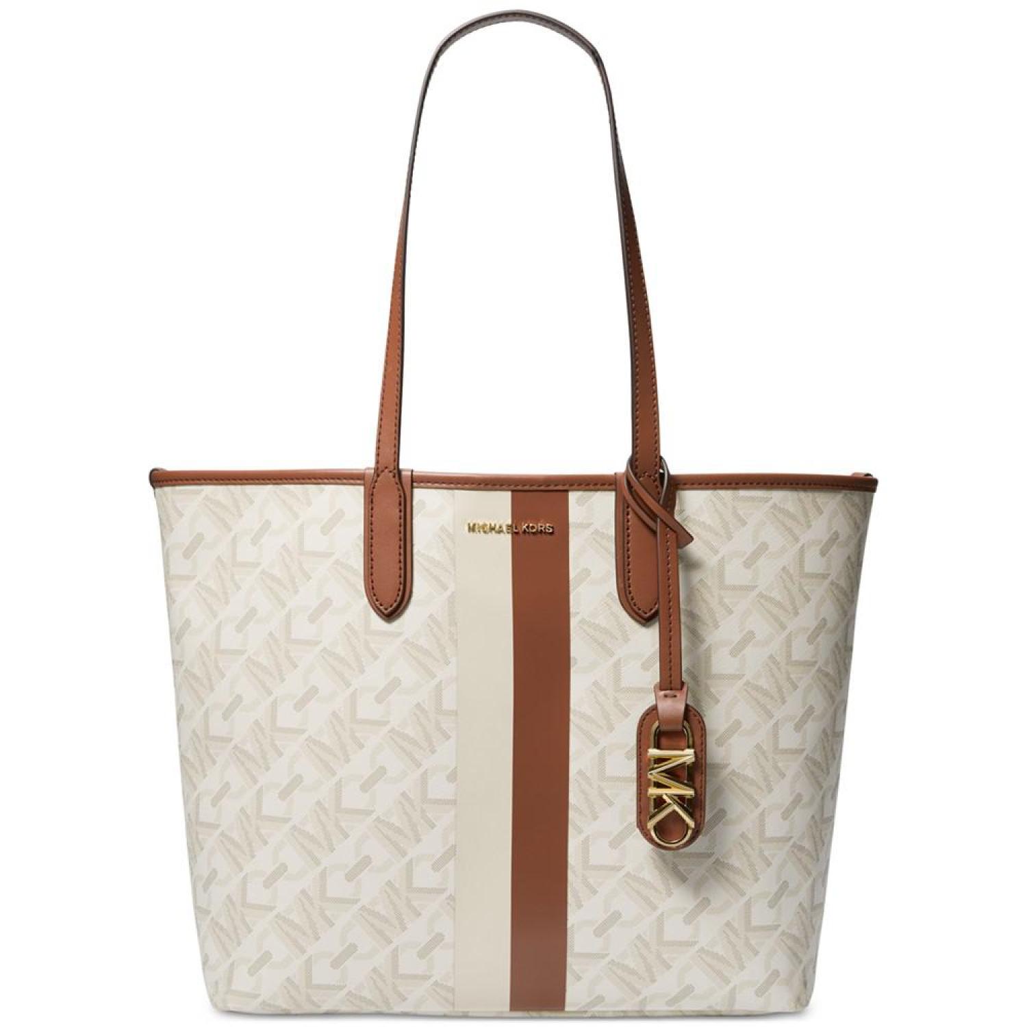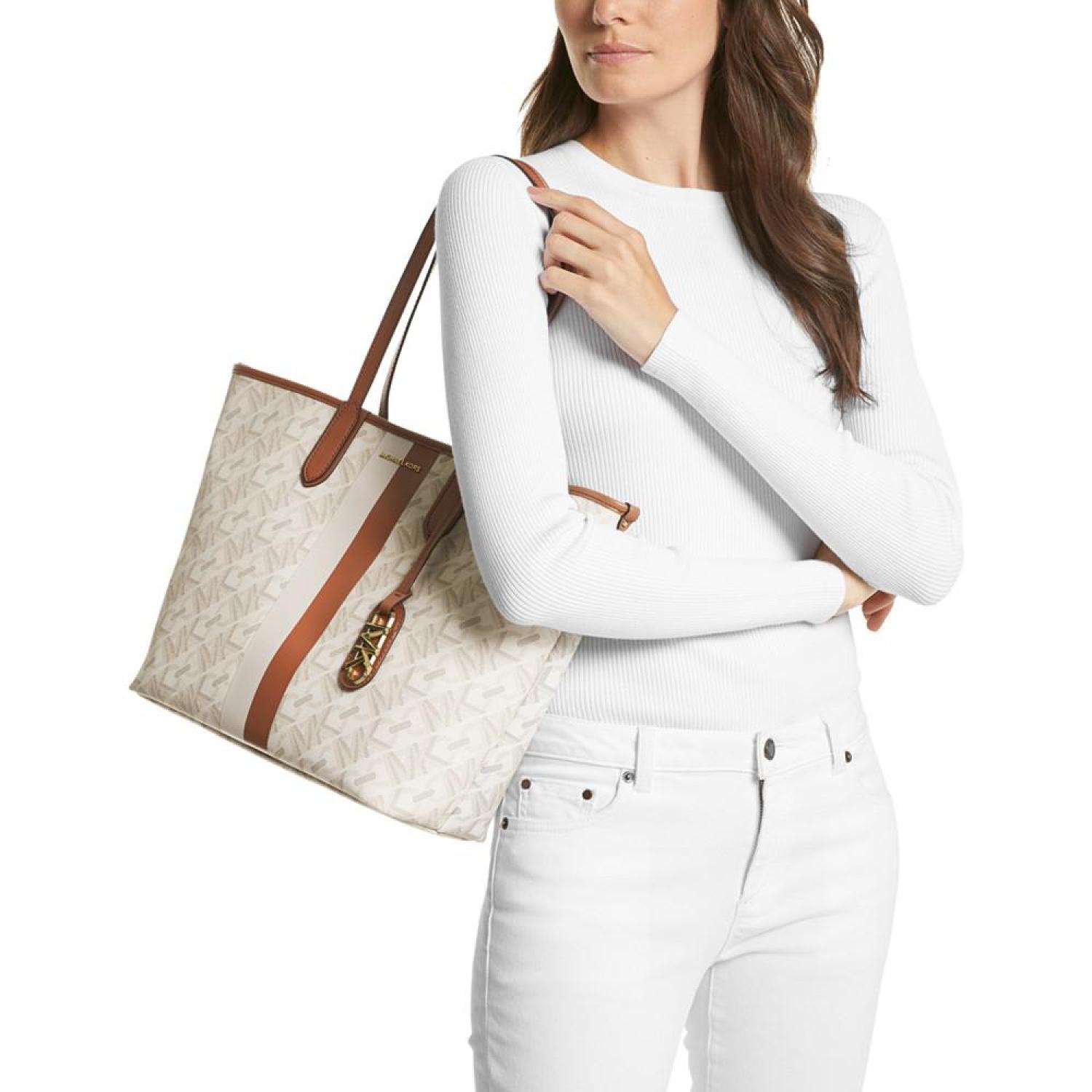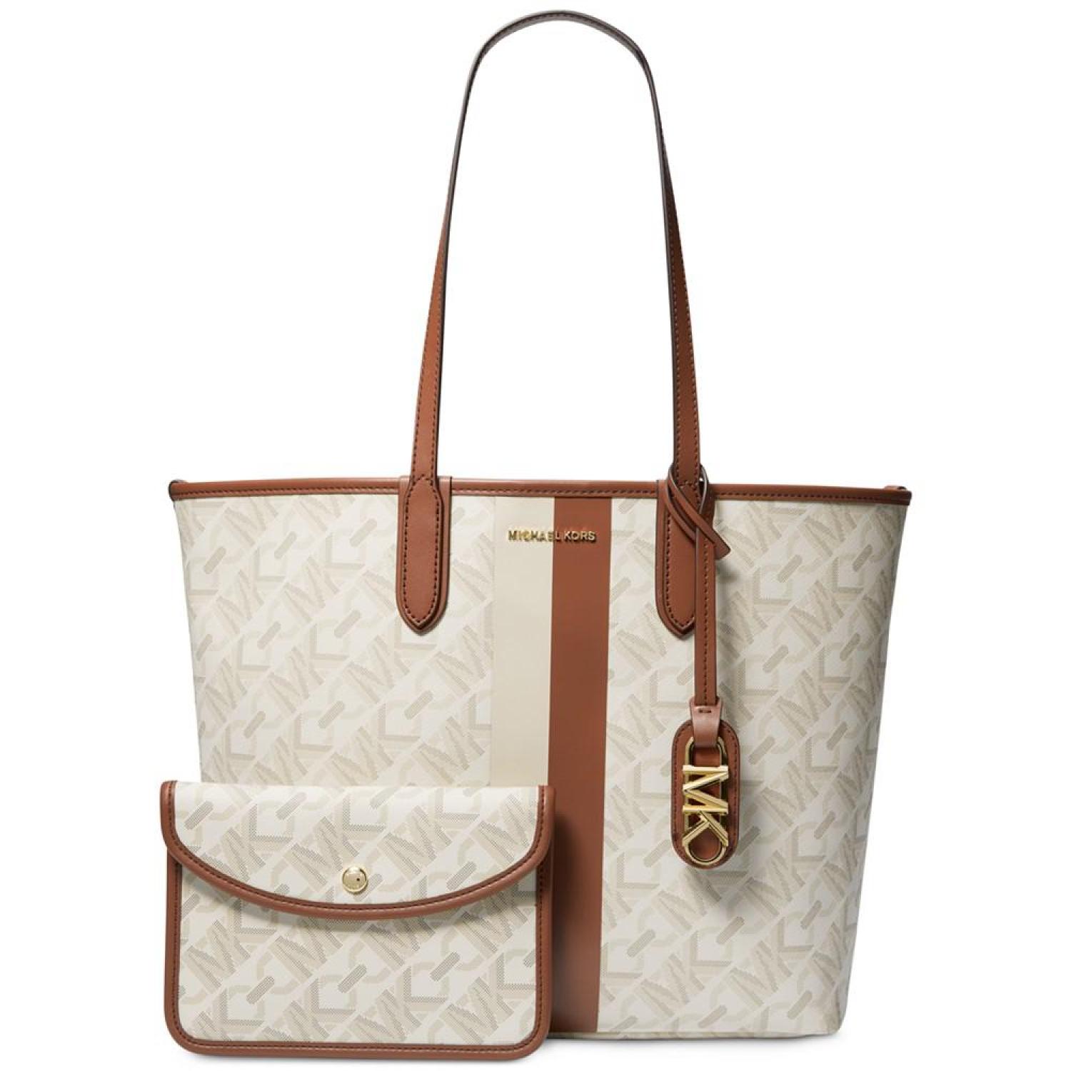 This classic tote by MICHAEL Michael Kors is sized for your busiest days in a monogram design that is forever in style. The drop-in interior pouch provides an extra compartment for small items while the polished logo charm lends an iconic finish. Large sized bag; 16-1/2"W x 11-3/4"H x 6"D (width is measured across the bottom of handbag); 1.16 lbs. approx. weight Silhouette is based off 5'9" model 9-1/2"L handle Snap closure Gold-tone hardware & logo charm Removable drop in pouch PVC, polyester, cotton; lining: 100% cotton; trim: polyurethane, cotton, polyester Spot clean Imported