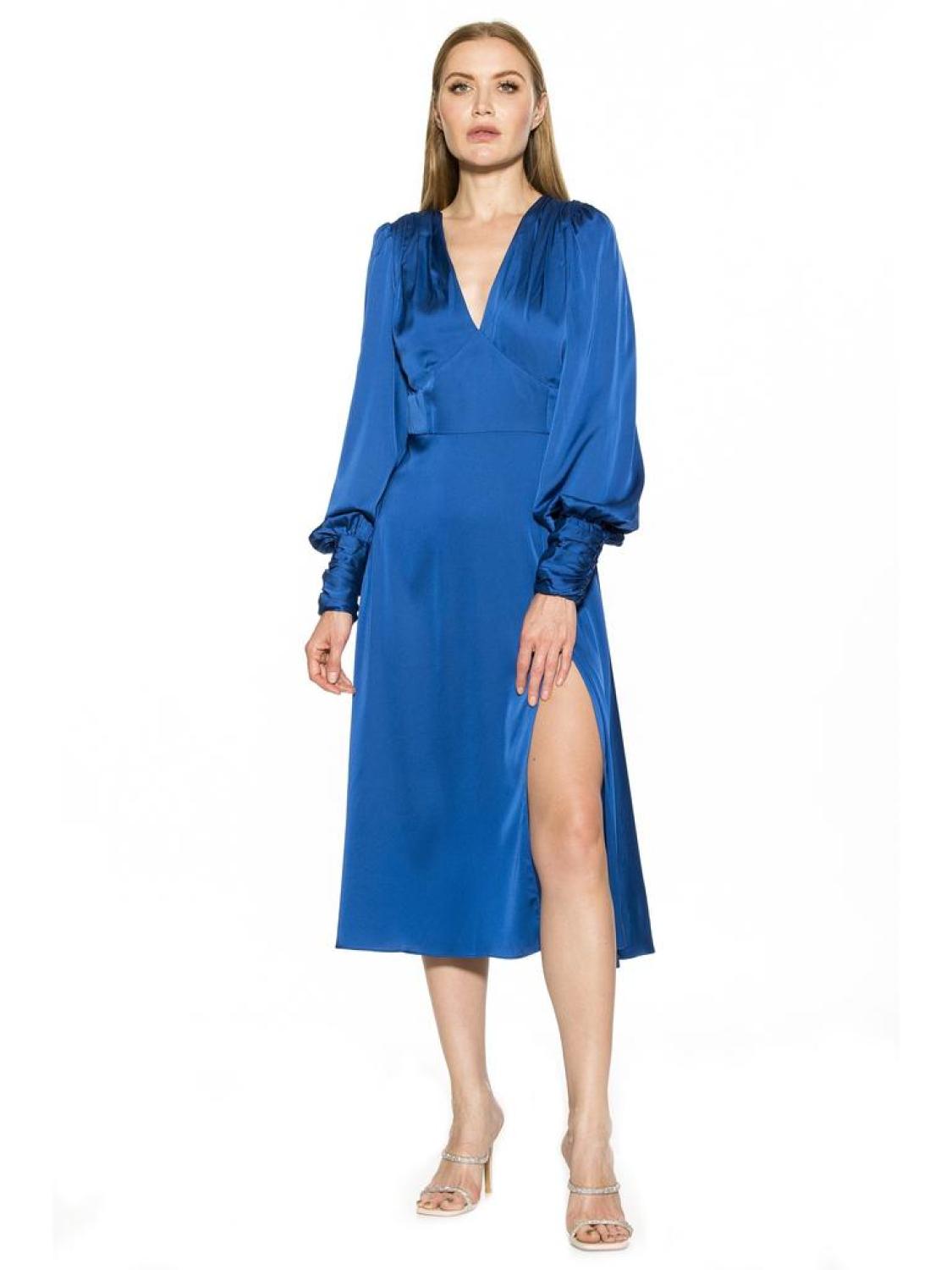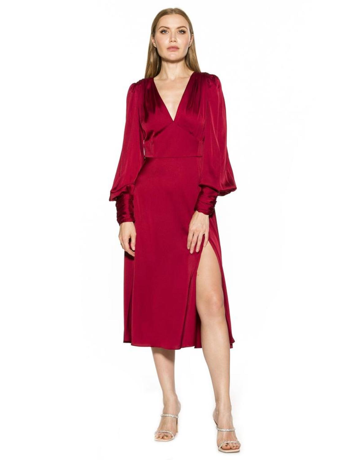 PRODUCT FEATURES 48 5/8" length Deep V-neck Long bishop sleeves with ruched cuffs Back keyhole with button-loop closure Back zip closure Satin construction Side slit 97% Polyester, 3% Spandex Partly Lined - 97% Polyester, 3% Spandex Machine wash, tumble dry Imported Style D3946