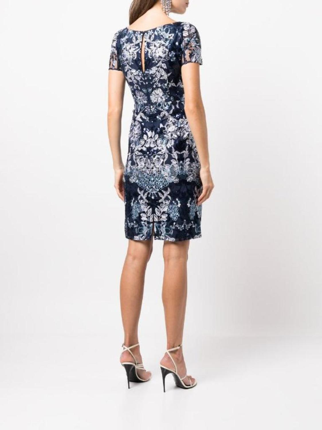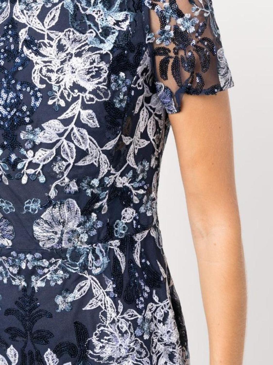The archetype of refined, this printed lace tea-length gown in navy features a high boat neckline, a fitted A-line silhouette, and a stunning lace design in shades of navy to ice blue embellished with sequins.Model is wearing size US 0.
