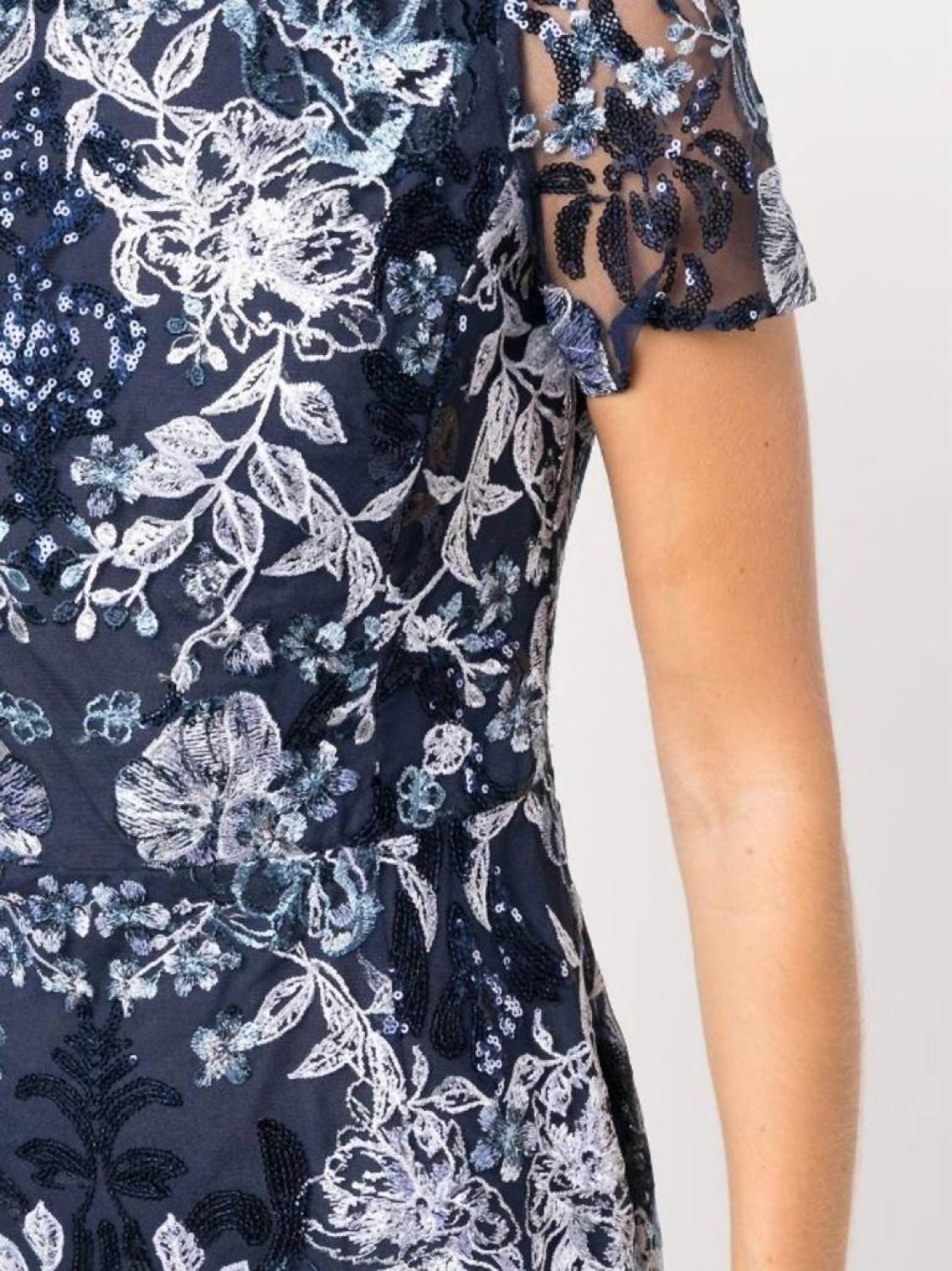 • The kind of easy and flattering dress you'll be reaching for all season long.Features a high boat neckline, a fitted A-line silhouette, and a stunning lace design in shades of navy to ice blue embellished with sequins. Model is wearing size US 0. Dry clean only.