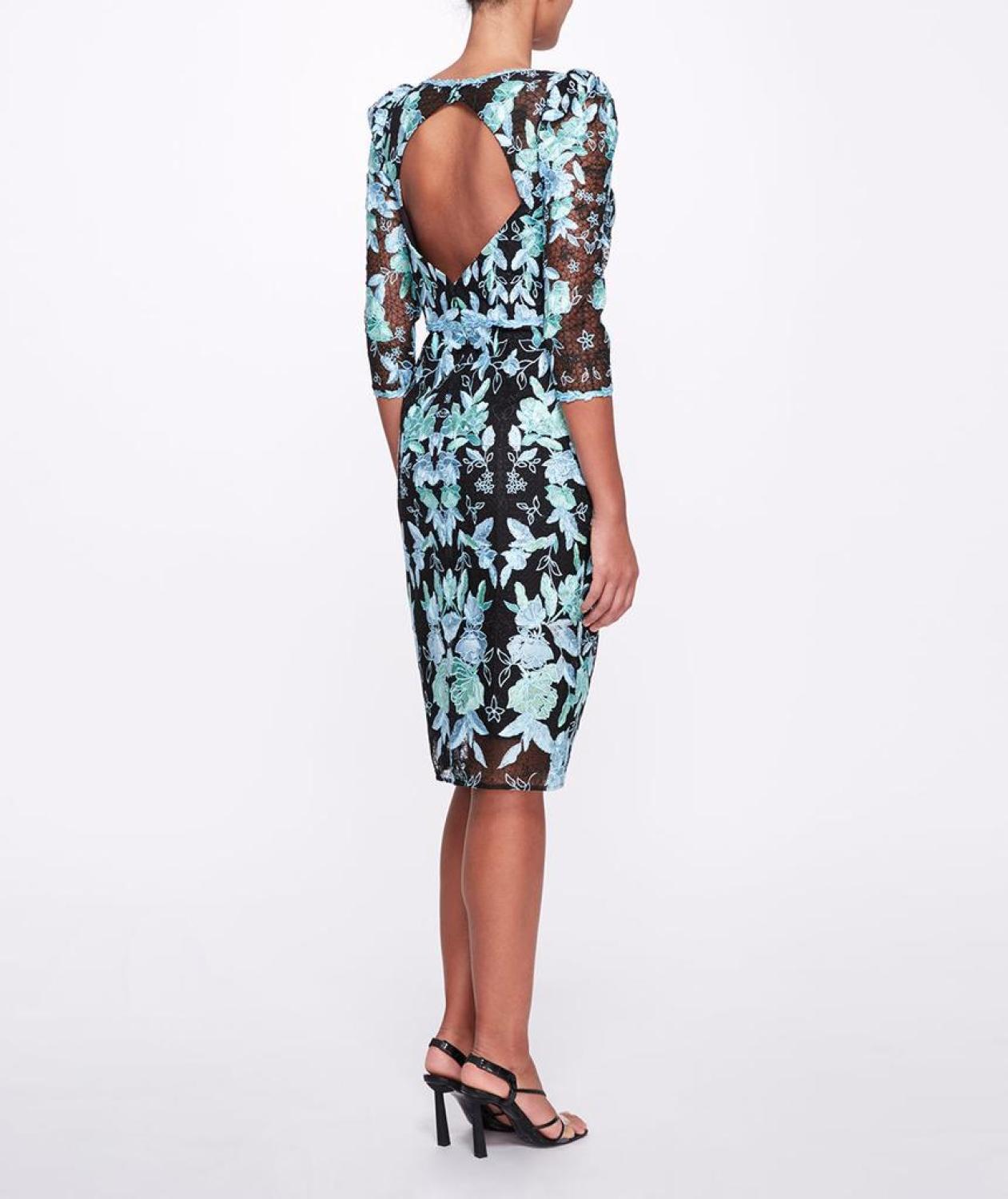 Beautifully bold, the embroidered tulle cocktail dress in black multi features a sheath silhouette, sweetheart neckline, and 3/4 sleeves to create an elevated hourglass figure. Striking in multicolor embroidered tulle, it's the quintessential addition to any glamorous wardrobe.Model is wearing size US 4.