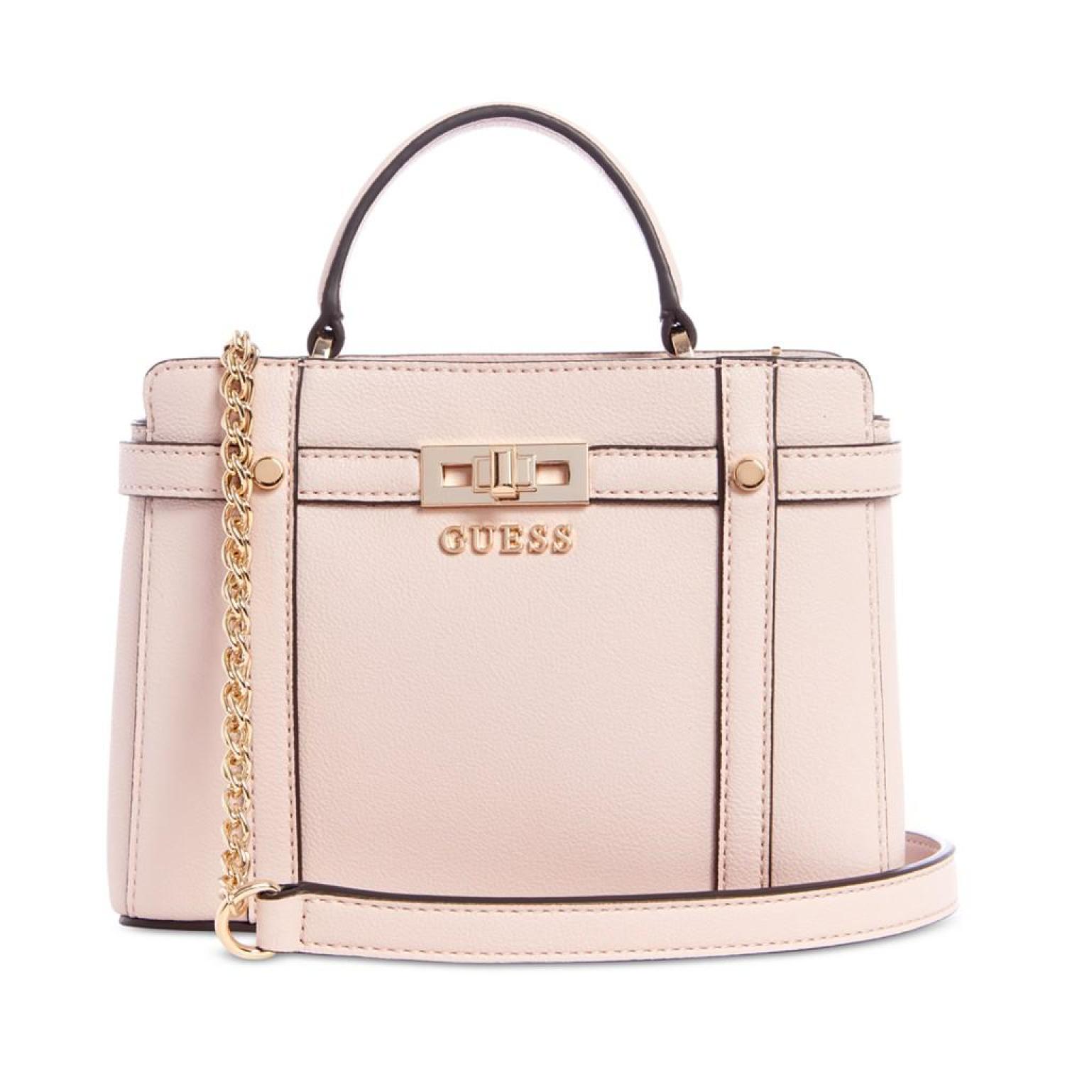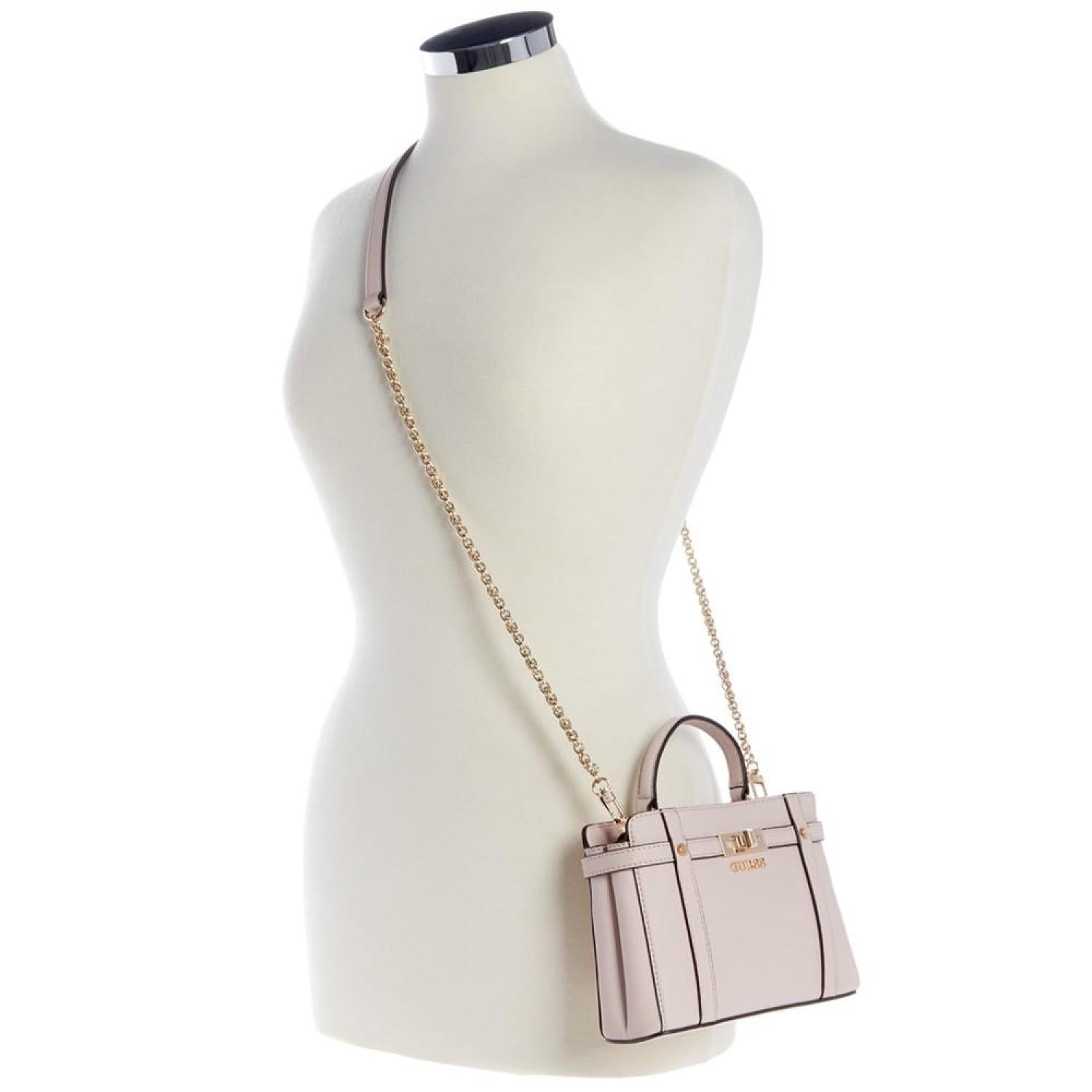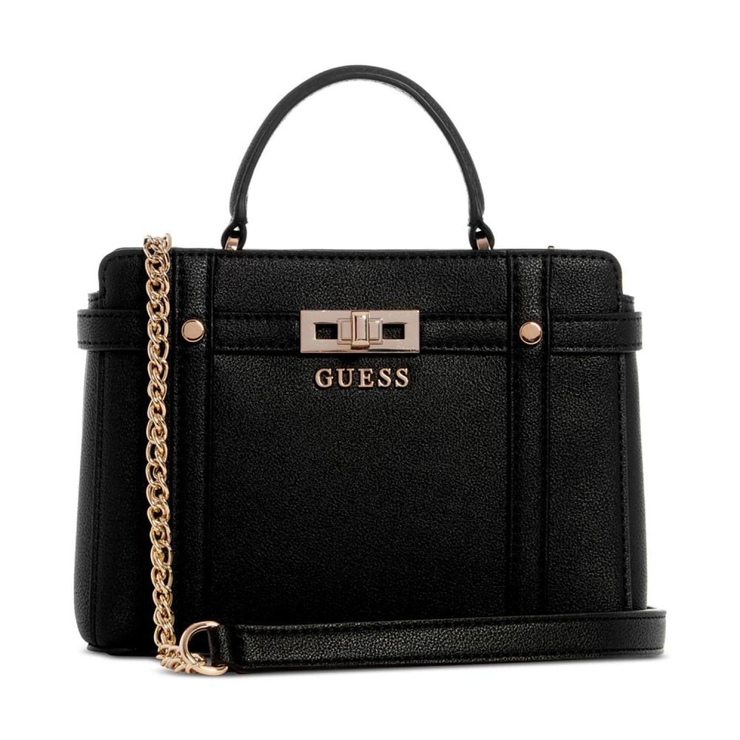 Compact and classic, this satchel by GUESS is accented with shiny gold-tone hardware and polished metal logo. Sure to become a favorite go-to, grab it by the handle or attach the strap to go handsfree. Mini sized bag; 7-1/2"W x 5-1/2"H x 2-1/4"D (width is measured across the bottom of handbag); 0.98 lbs. approx. weight Silhouette is based off 5'9" model 2-1/4"L handle; 22-3/4"L removable, adjustable strap Magnetic snap closure Shiny gold-tone hardware & logo 3 interior card slots & zip pocket Polyurethane Spot clean Imported