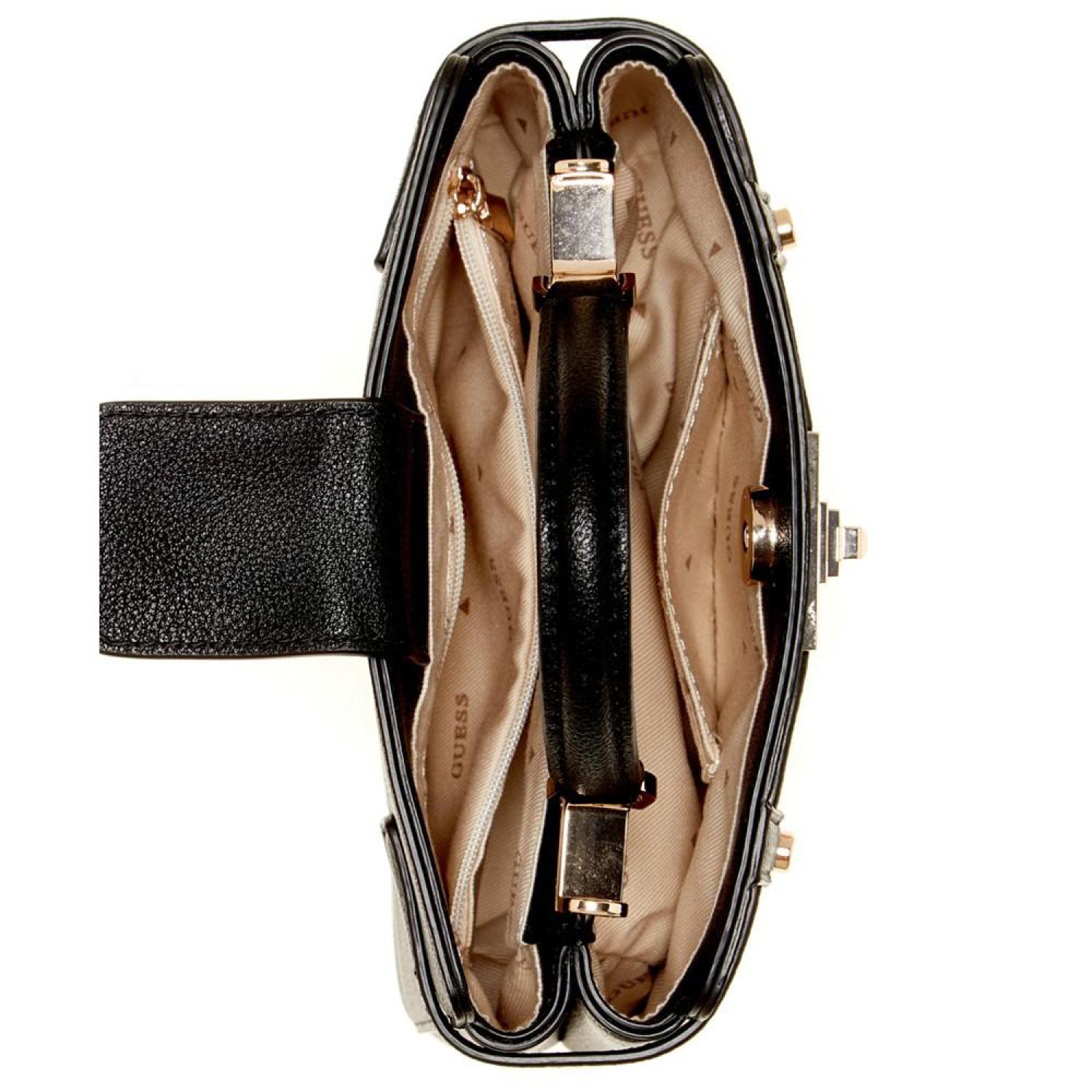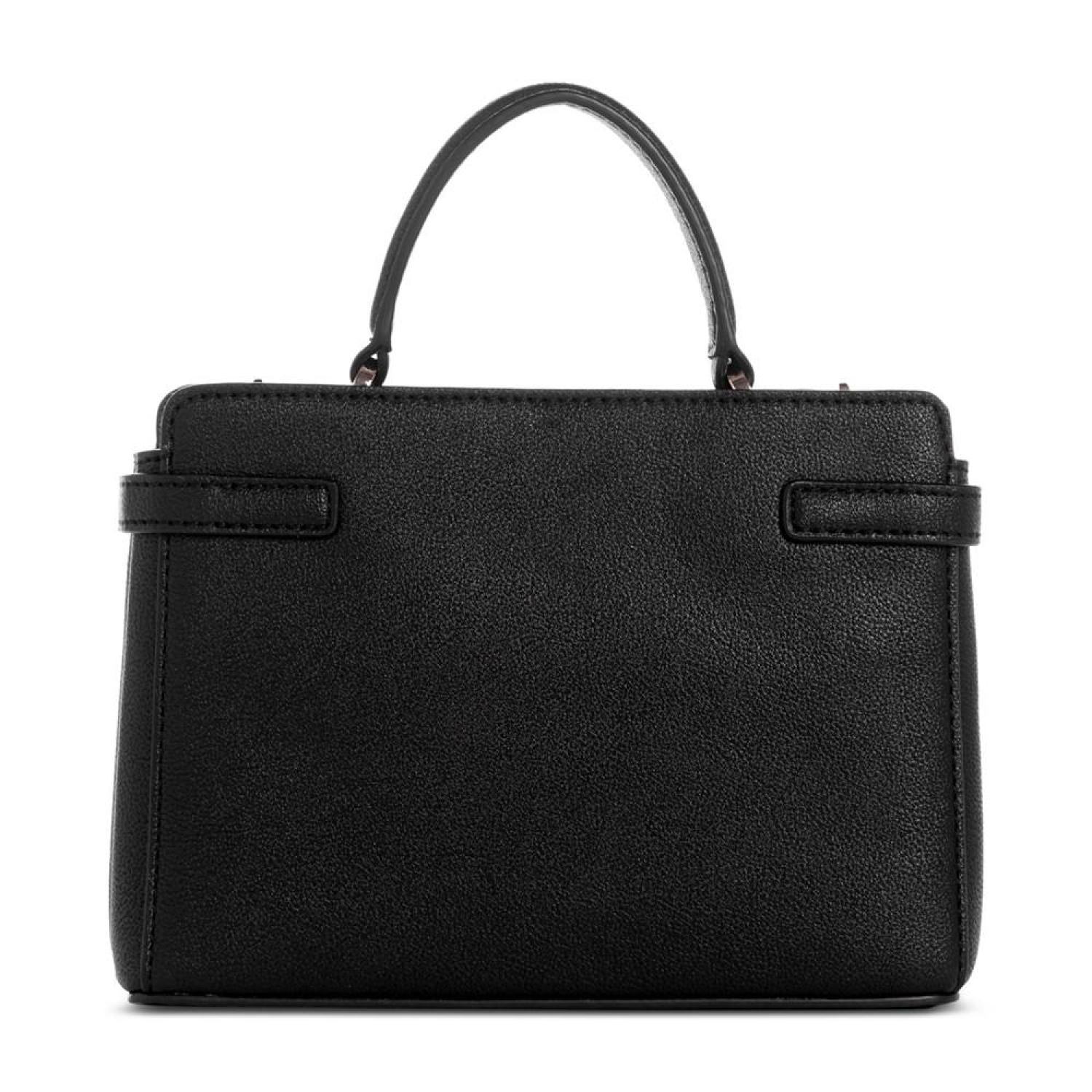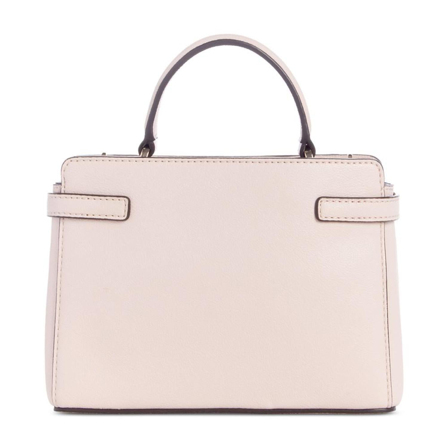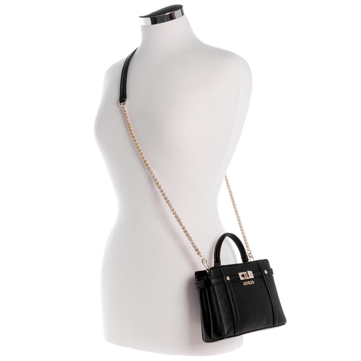 Compact and classic, this satchel by GUESS is accented with shiny gold-tone hardware and polished metal logo. Sure to become a favorite go-to, grab it by the handle or attach the strap to go handsfree. Mini sized bag; 7-1/2"W x 5-1/2"H x 2-1/4"D (width is measured across the bottom of handbag); 0.98 lbs. approx. weight Silhouette is based off 5'9" model 2-1/4"L handle; 22-3/4"L removable, adjustable strap Magnetic snap closure Shiny gold-tone hardware & logo 3 interior card slots & zip pocket Polyurethane Spot clean Imported