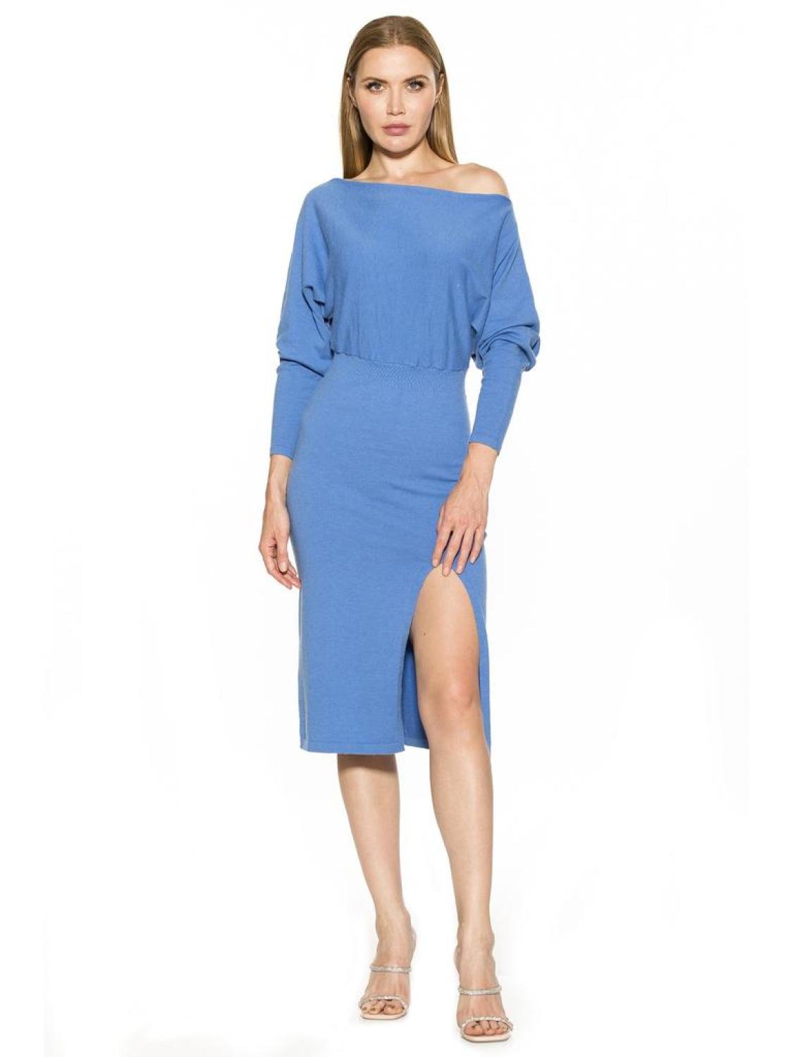 • PRODUCT FEATURES Off Shoulder design Long sleeves Front slit Knitted Midi length 50% Viscose, 30% Polyamide, 20% Polyester Hand wash Imported Style D3942