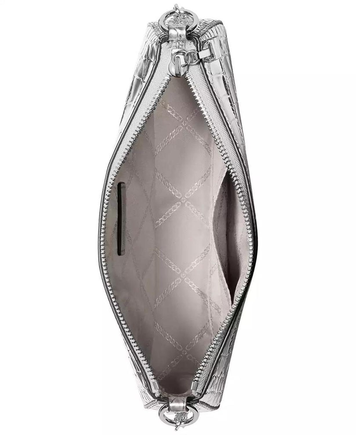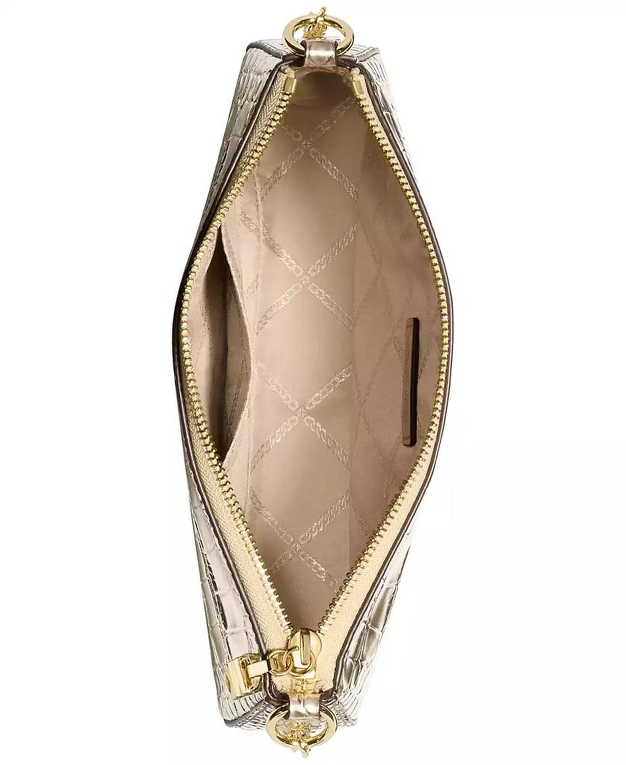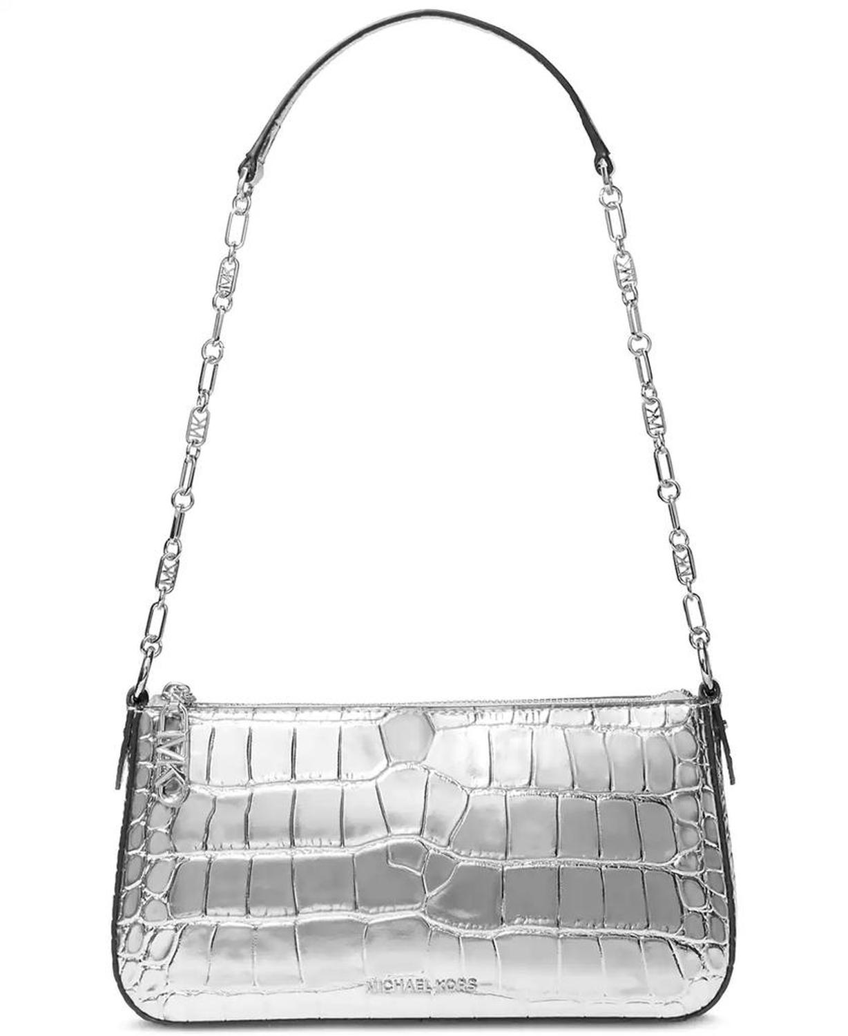 Crafted with luxe metallic leather, this pouchette by MICHAEL Michael Kors features signature hardware and a shiny chain strap. Small-sized bag; 10"W x 5"H x 2"D (width is measured across the bottom of handbag); 0.66 lbs. approx. weight Silhouette is based off 5'9" model 11-1/2"L handle Zippered closure Hardware tone varies by color, interior slip pocket Leather; lining: 100% polyester; trim: 60% PU, 20% cotton, 20% polyester Spot clean Imported