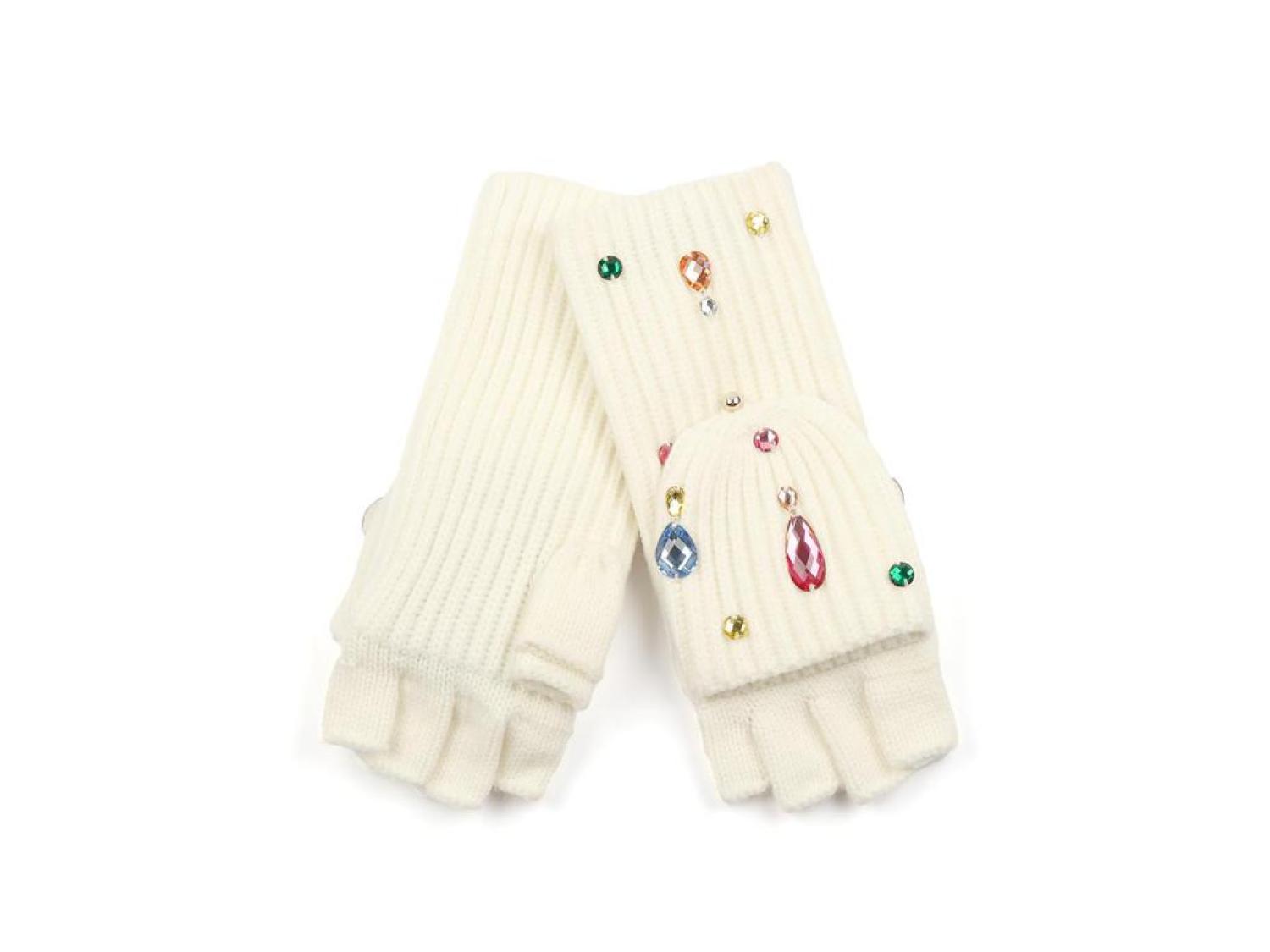 The primary materials that compose this product contain a minimum of 20 percent recycled content. Bring on a chic update to your chilly weather style by layering up with the Kate Spade New York® Embellished Pop Top Gloves that display multicolored crystal embellishments for an attractive appeal. Crafted from a super-soft and warm wool-blend fabric, these convertible fingerless gloves promise to keep you covered and comfortable. 45% acrylic, 30% wool, 25% recycled acrylic. Machine washable. Imported.