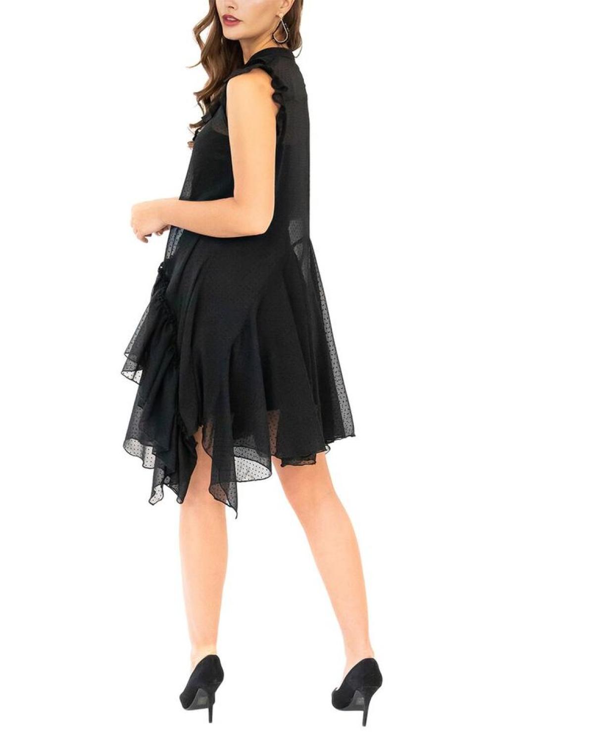 Introducing the Eva Franco Masel Mini Dress, the perfect addition to your wardrobe this season. This stunning midi dress features a ruffled detail, front button closure, and an uneven high-low hem for a unique and stylish look. Made from 100% polyester with a cozy lining, this dress is not only fashionable but also comfortable to wear. The black color adds a touch of elegance to any outfit. Designed and made in the USA, this dress is a must-have for any fashion-forward woman. Don't miss out on the opportunity to add this fabulous piece to your collection!