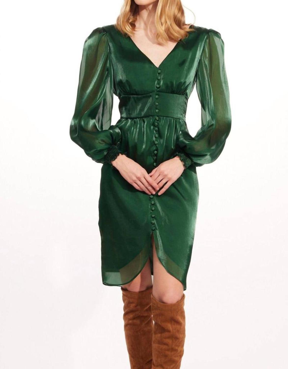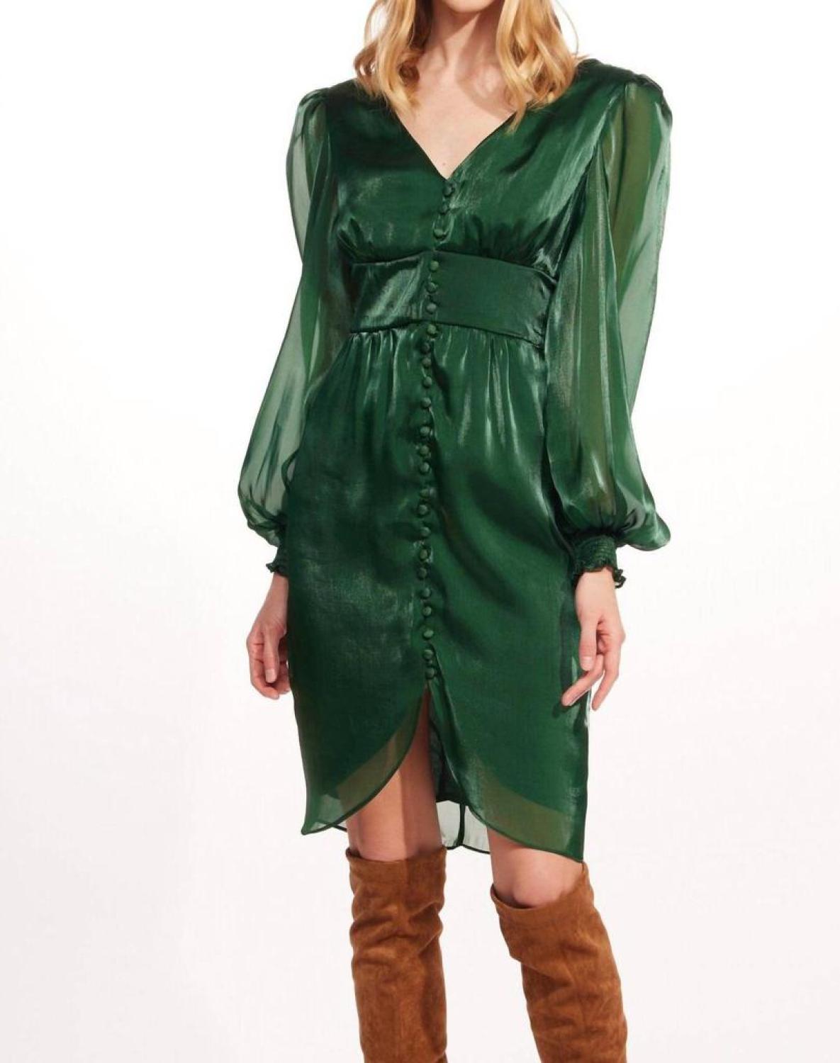 The perfect length dress does exist.You'll be turning heads wherever you go in this flattering midi dress. Crafted from a beautiful chiffon, our form fitting V neck dress is perfect for this season's upcoming occasions. Front covered button detail. Full sleeves. V-neck front and back. Midi length. Fully lined. Peekaboo slit in front. Back zip