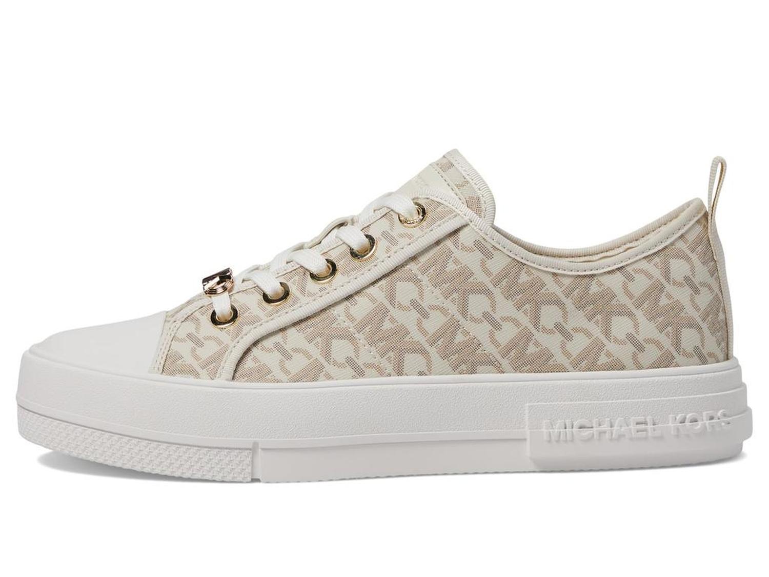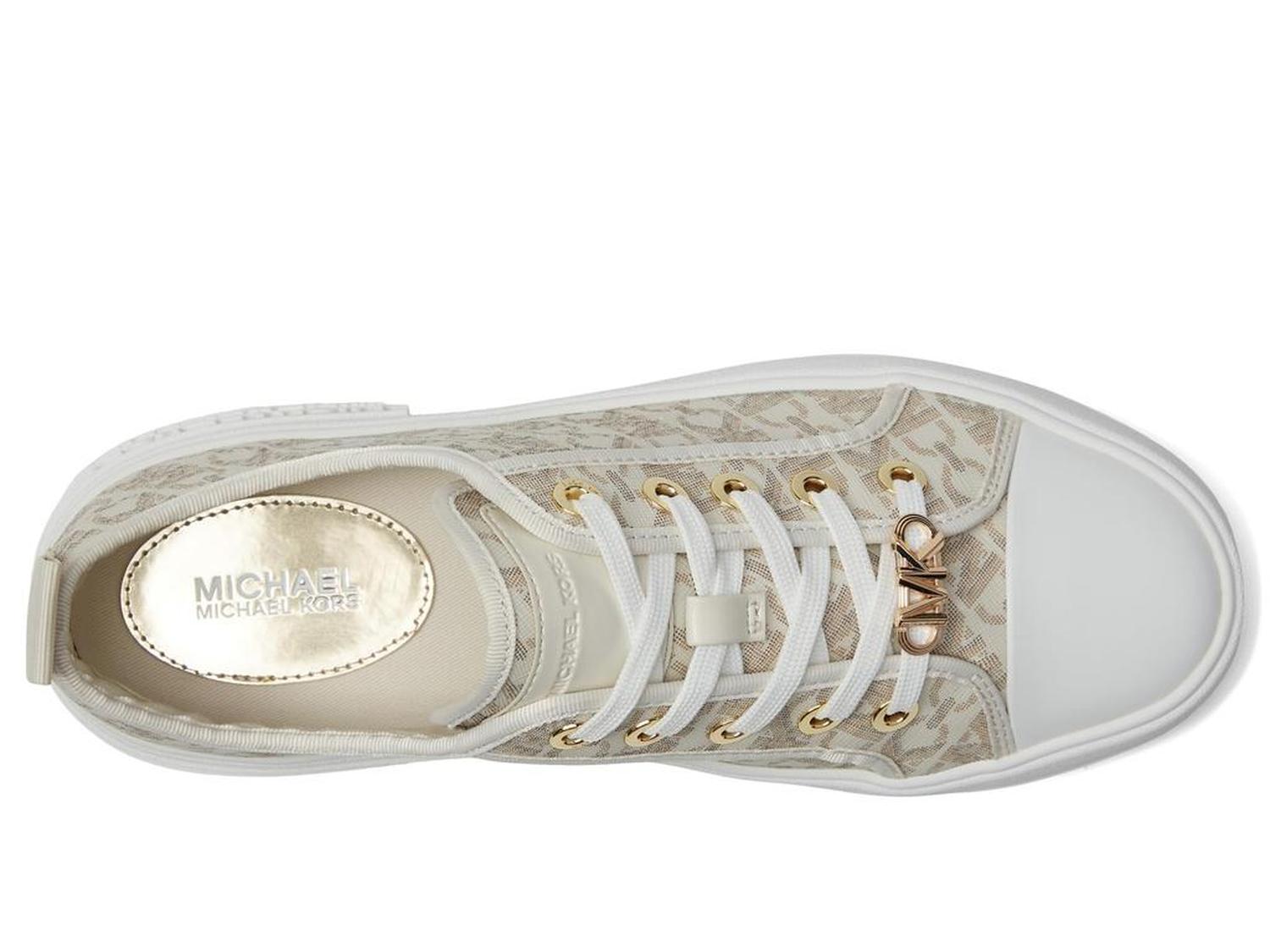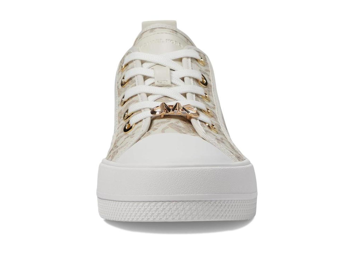 Let your steps talk to the air by wearing MICHAEL Michael Kors® Evy Lace-Up 9925733 footwear. The sneakers have leather upper, textile lining, and removable textile insole. A round toe with protective toe-cap and lace closure offer perfect traction. The shoes have heel pull-tabs. A flat platform gives consistency to the speed.