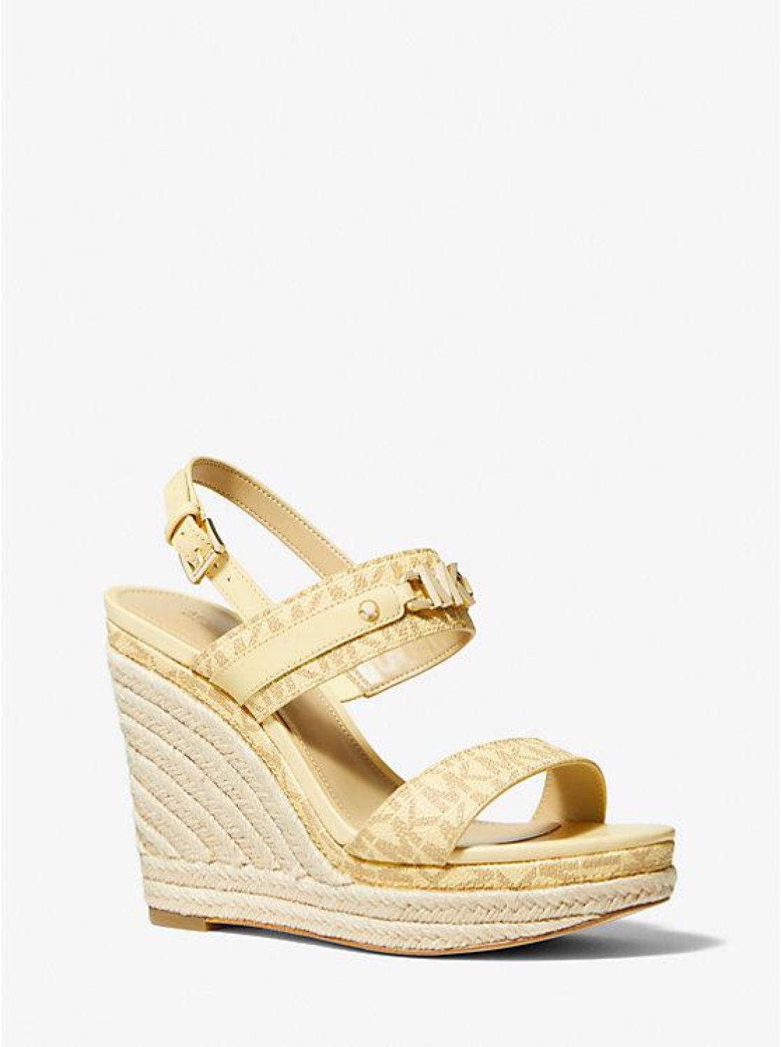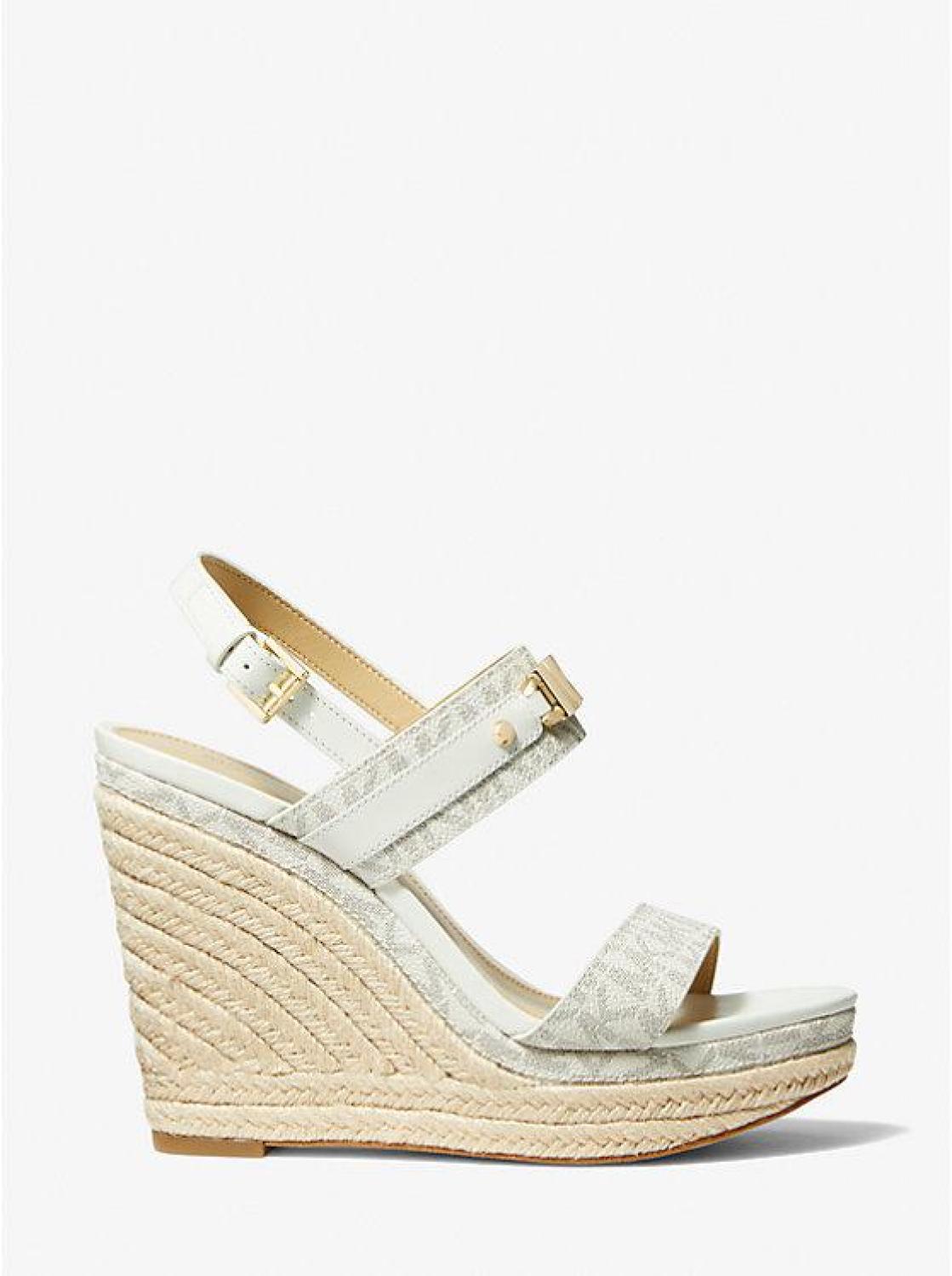 If your calendar is chock-full of events, our Farrah sandals are a wise investment. Adorned with Empire hardware, this Signature Logo print pair is set on high jute wedges balanced by platform soles, making them an ideal pair for day-long summer weddings and garden parties. Complete the look with a billowing floral dress. • Sandal • Logo-print canvas/polyurethane blend • 69% coated canvas/17% polyester/13% cotton/1% polyurethane • Lining: polyurethane blend • Sole: textile • Open toe • Buckle fastening • Heel height: 4.5" • Platform height: 1” • Heel type: jute • Imported • Sandal • Logo-print canvas/polyurethane blend • 69% coated canvas/17% polyester/13% cotton/1% polyurethane • Lining: polyurethane blend • Sole: textile • Open toe • Buckle fastening • Heel height: 4.5" • Platform height: 1” • Heel type: jute • Imported