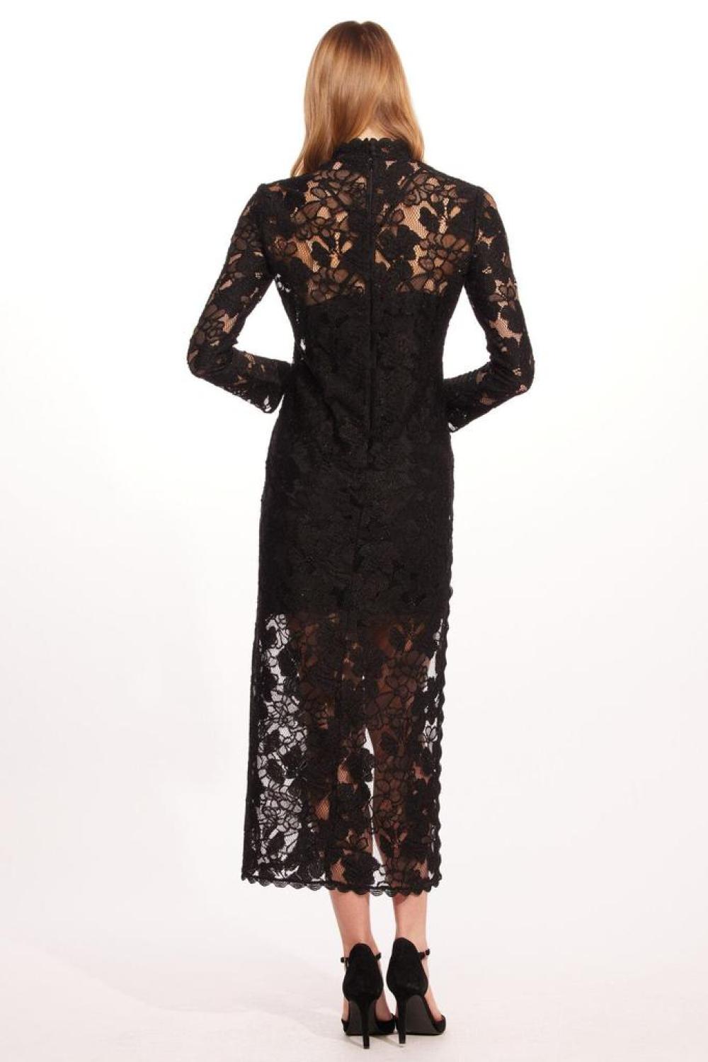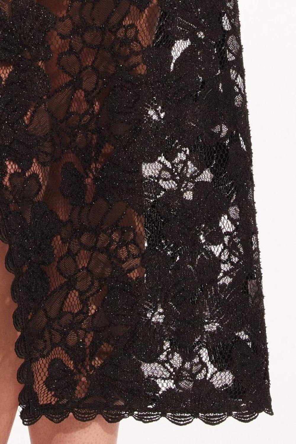 Make a lasting impression with this midi length black lace dress. This classy long sleeve occasion dress is cut with a scallop hem and has a side slip to add a flattering shape. Mock neck Long sleeves Partially lined Midi length Side slip Back zip