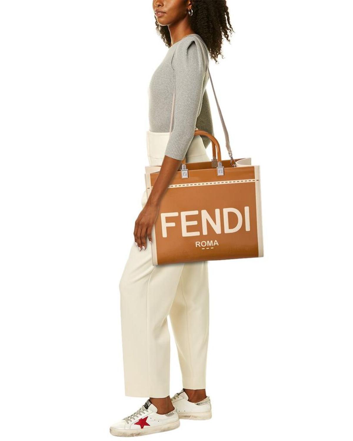Introducing the FENDI Sunshine Medium Patent Tote, a luxurious and innovative handbag perfect for the modern woman. Crafted with exquisite attention to detail in Italy, this tote is made with brown and white patent leather with silver-tone hardware and unique plexiglass top handles. The interior features microfiber lining and ample space to store all your essentials. Measuring 16 inches wide, 14 inches high, and 8.5 inches deep, this tote has both top handles with a 5-inch drop and a removable shoulder strap that drops 17.5 inches for added convenience. Its open top design makes it easy to access your belongings on-the-go. Please note, all measurements were taken by hand and are approximate; slight variations may occur. Rest assured knowing that our products are 100% genuine, with some items purchased from trusted independent suppliers and always standing by the authenticity of every product sold on our site. Elevate your style while showcasing your impeccable taste with the FENDI Sunshine Medium Patent Tote.