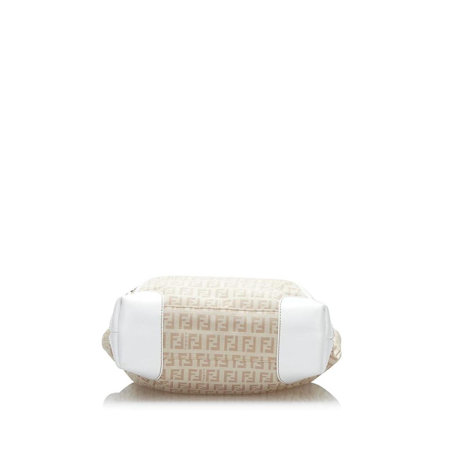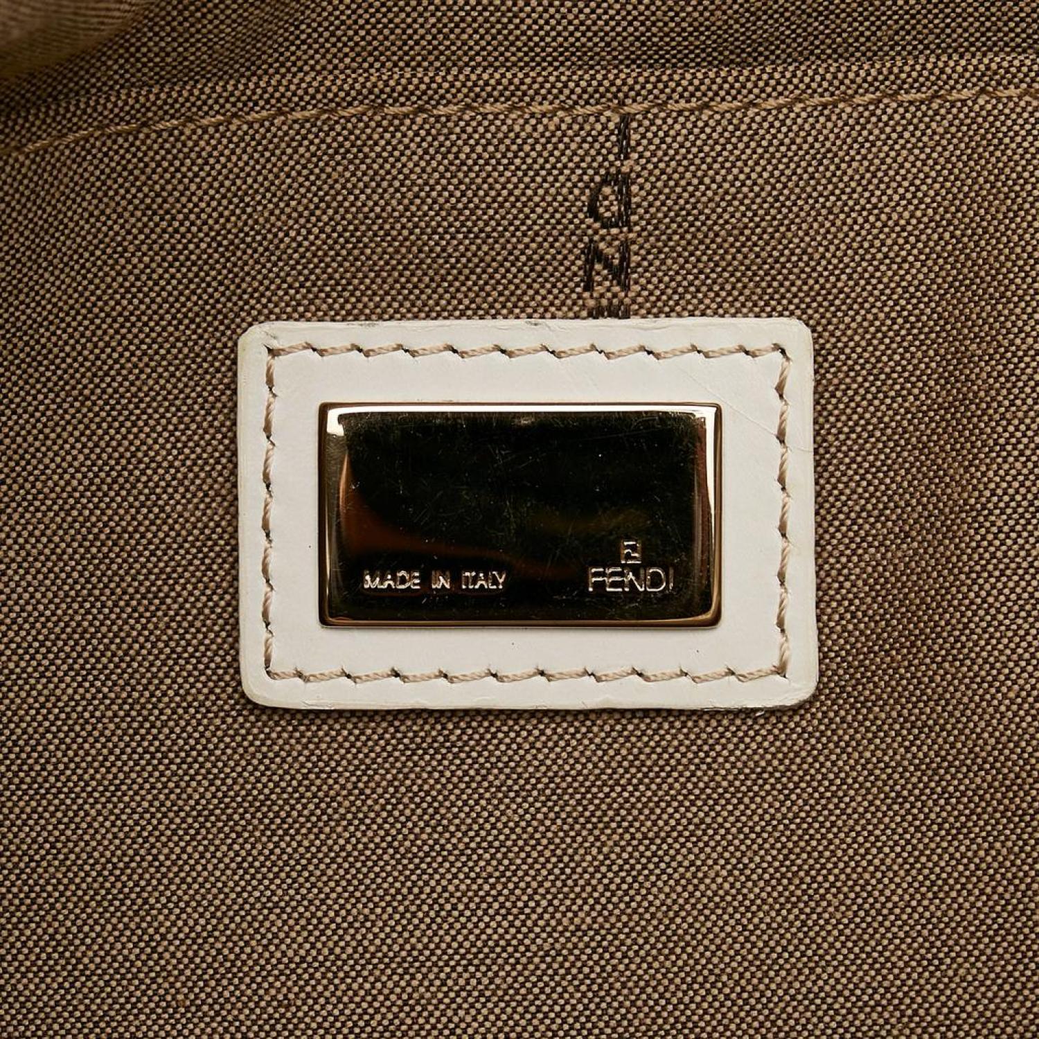 • This Fendi tote features a canvas body with leather trim rolled leather handles a top magnetic snap button closure and an interior slip pocket. It carries a B condition rating. Dimensions - Length 10.2, Width 10.63 and Depth 2.75 Inches. Color - Brown x Beige x White, Material - Fabric x Leather x Canvas x Calf, Country of Origin - Italy, Serial 8BH139. Condition notes (see photos) - Exterior - out of shape, worn, stained, handle cracked. Interior - lining stained with other, pocket discolored, hardware scratched. Grade - B