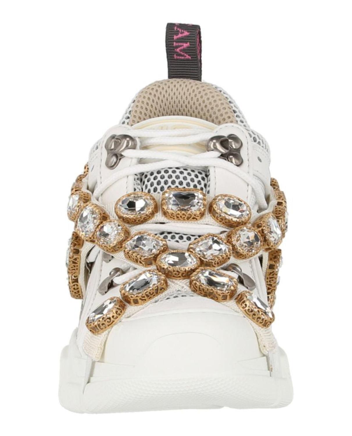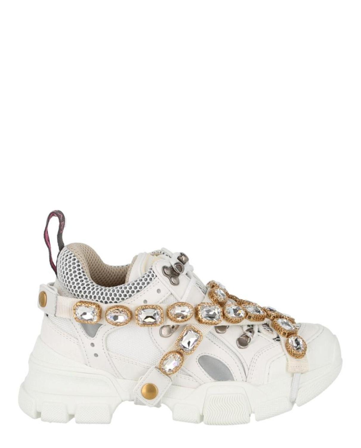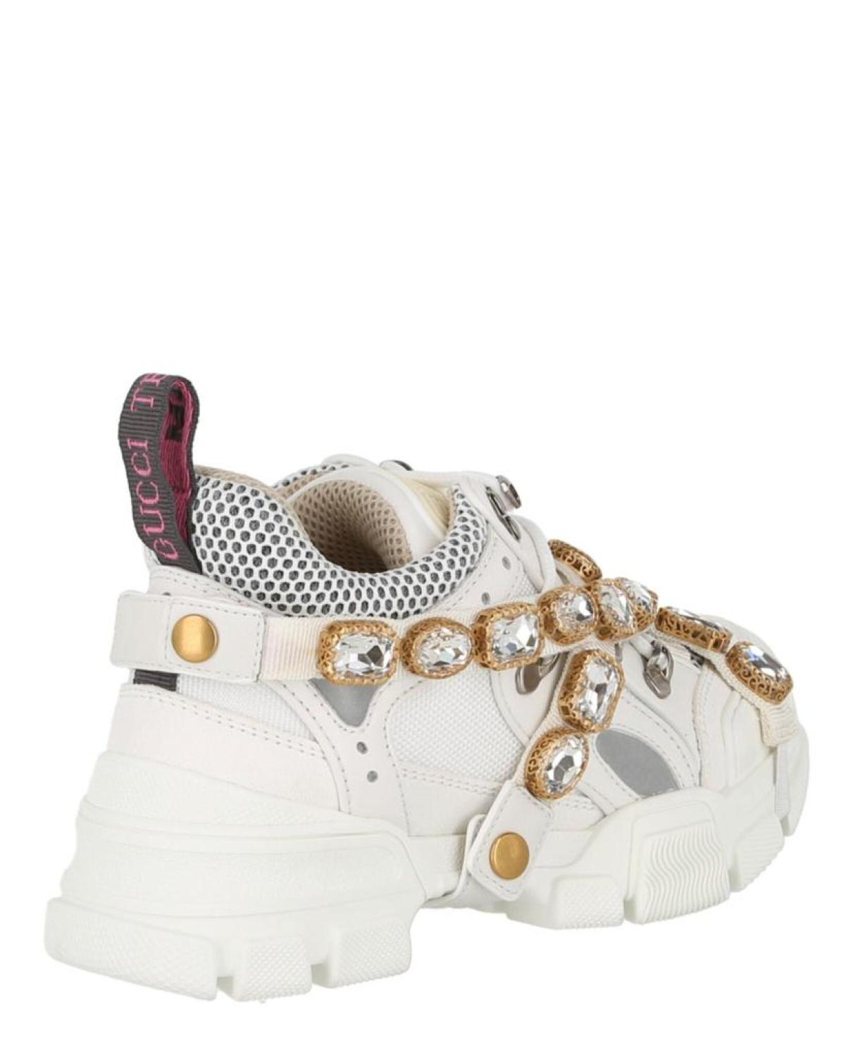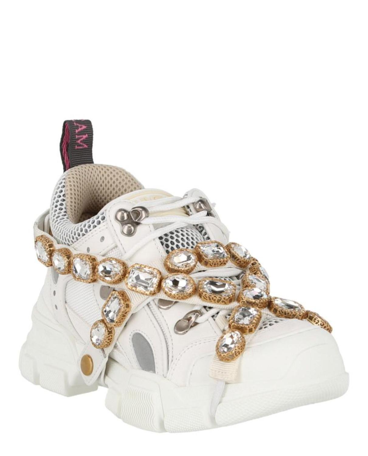• Heel measures at approximately - 2.25"; Lace-up front; 100% leather; Closed round toe,thick rubber sole; Large GUCCI rubber patch on the tongue; Removable elastic ribbon with crystal embellishments