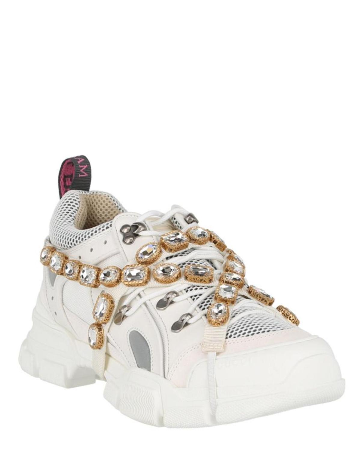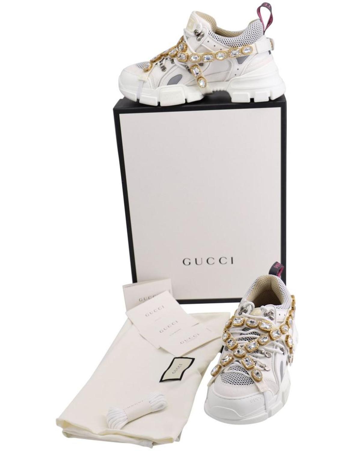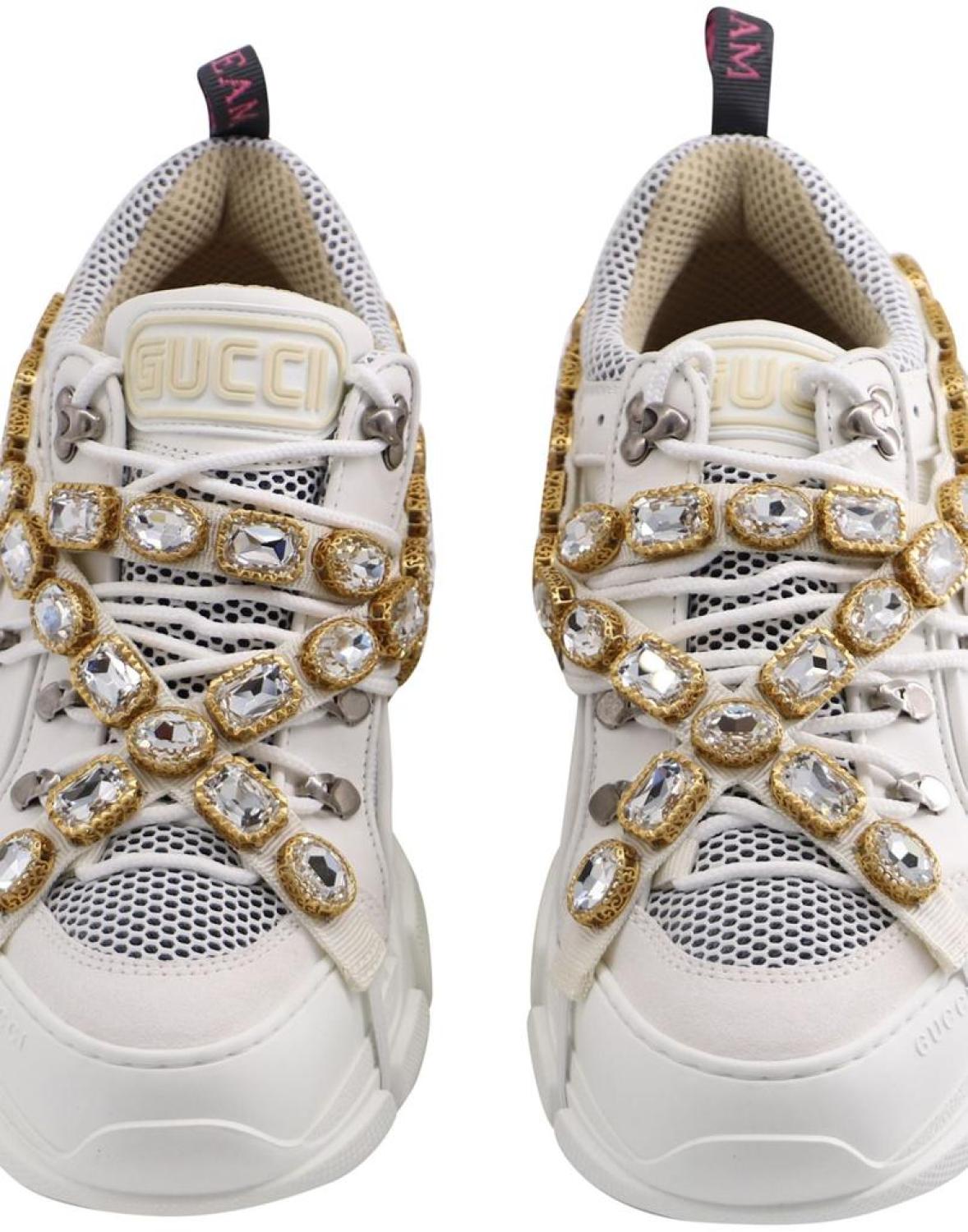 • Heel measures at approximately - 2.25"; Lace-up front; 100% leather; Closed round toe,thick rubber sole; Large GUCCI rubber patch on the tongue; Removable elastic ribbon with crystal embellishments