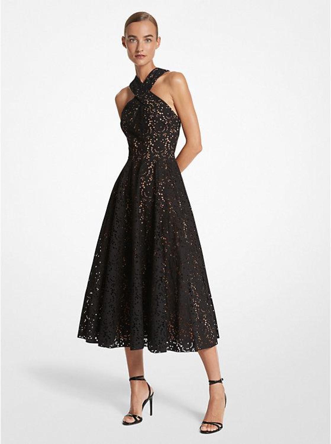 • It’s impossible to feel anything but romantic in this dress, which features a halter neckline and a crossover back. Soft cotton and intricate eyelet embroidery create the appearance of floral blooms on the fitted bodice and flattering A-line midi skirt. Complete the look with sandals and a woven handbag.