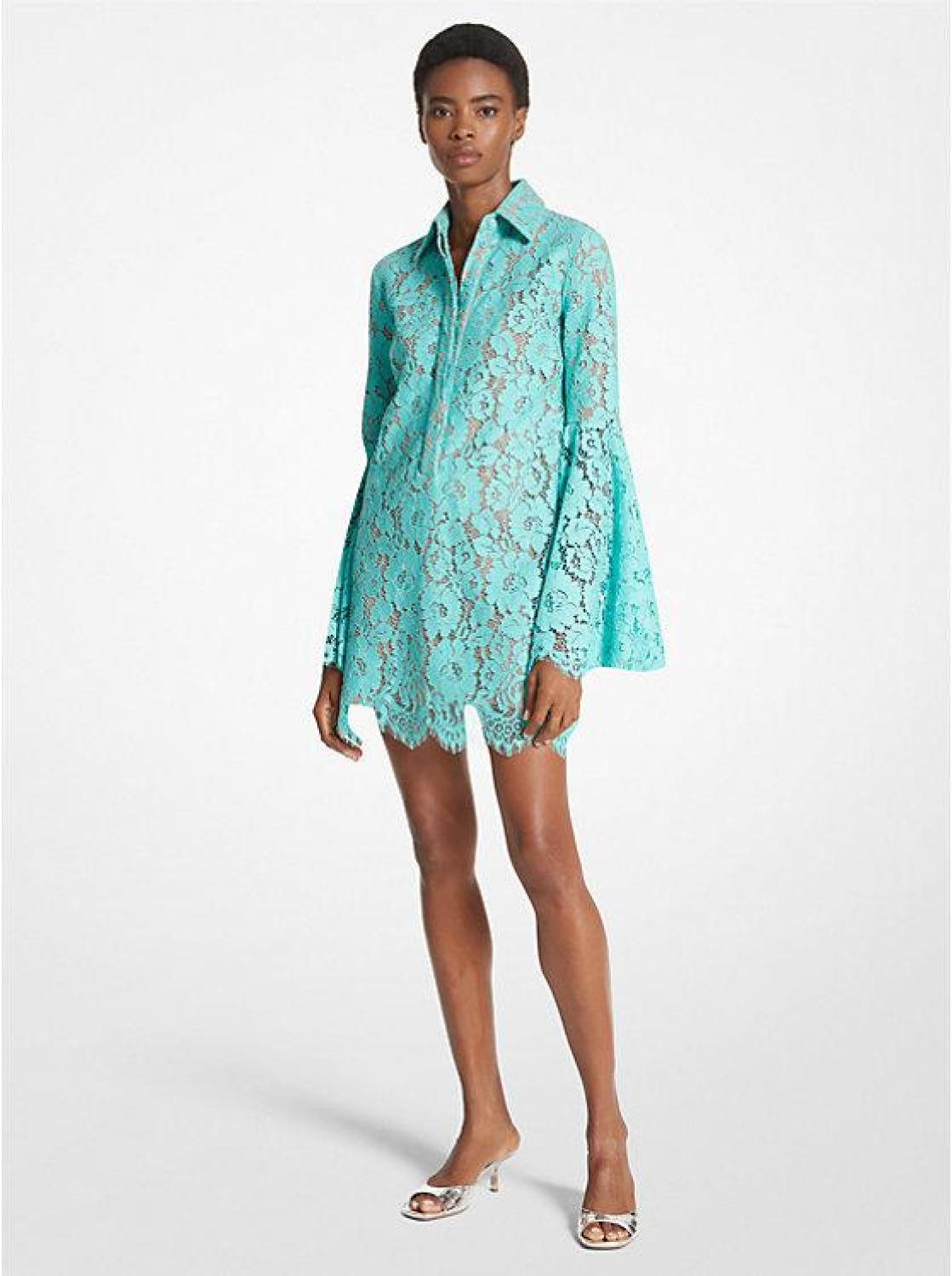 • Embodying the barefoot glamour of Spring/Summer 2024, this shirtdress is cut from floral lace that’s further accentuated by bell sleeves and a scalloped mini hem. A pointed collar and concealed button placket add a structured element that sets it apart from other lace styles. Ground the look with minimal jewelry and matching accessories.