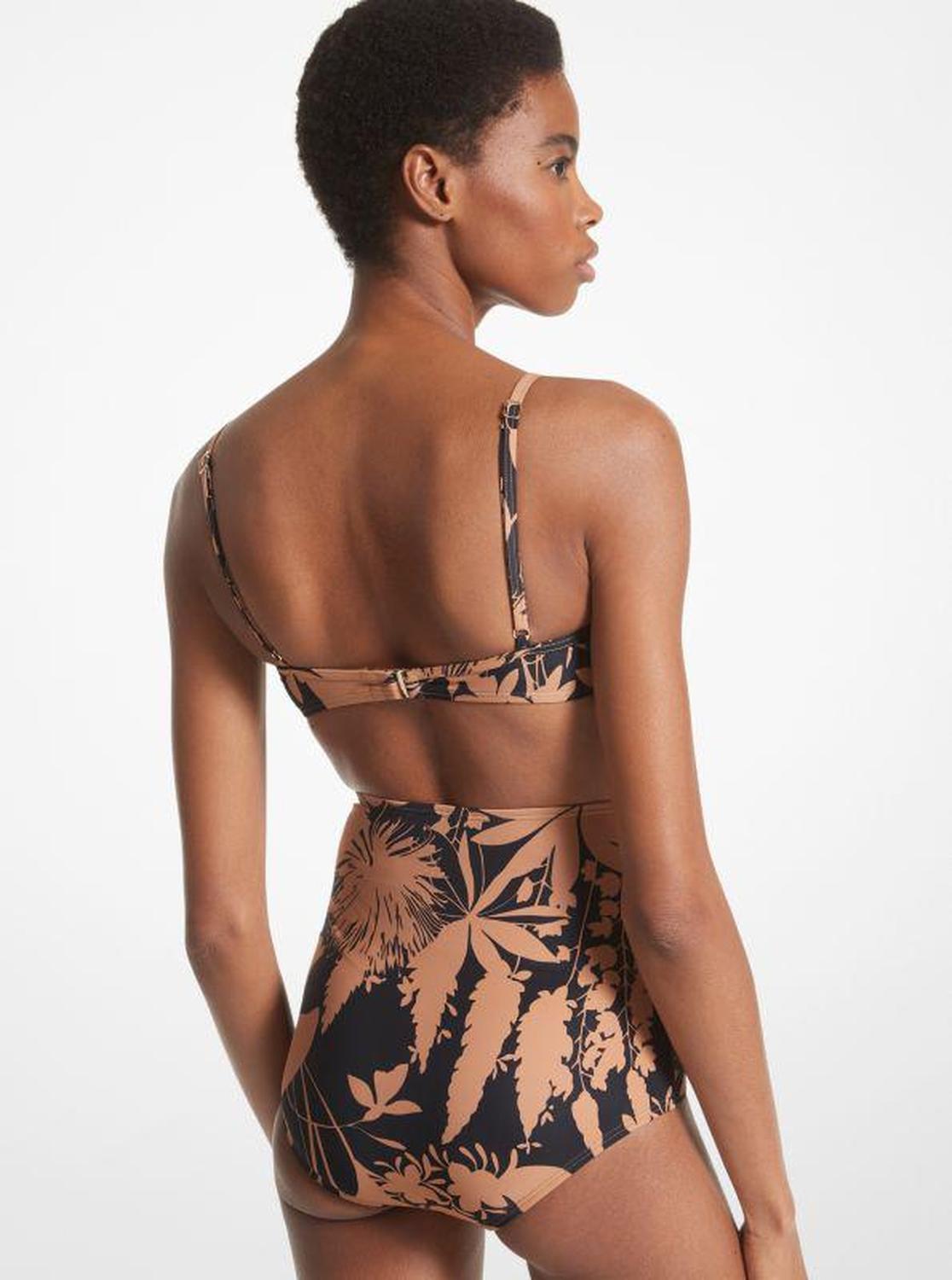 This two-piece swimsuit is defined by a bold floral motif inspired by a tropical island getaway. It features a supportive underwire bra top and briefs with a high waist for extra coverage. Complete the look with sunglasses and a sarong skirt when lounging by the pool.
