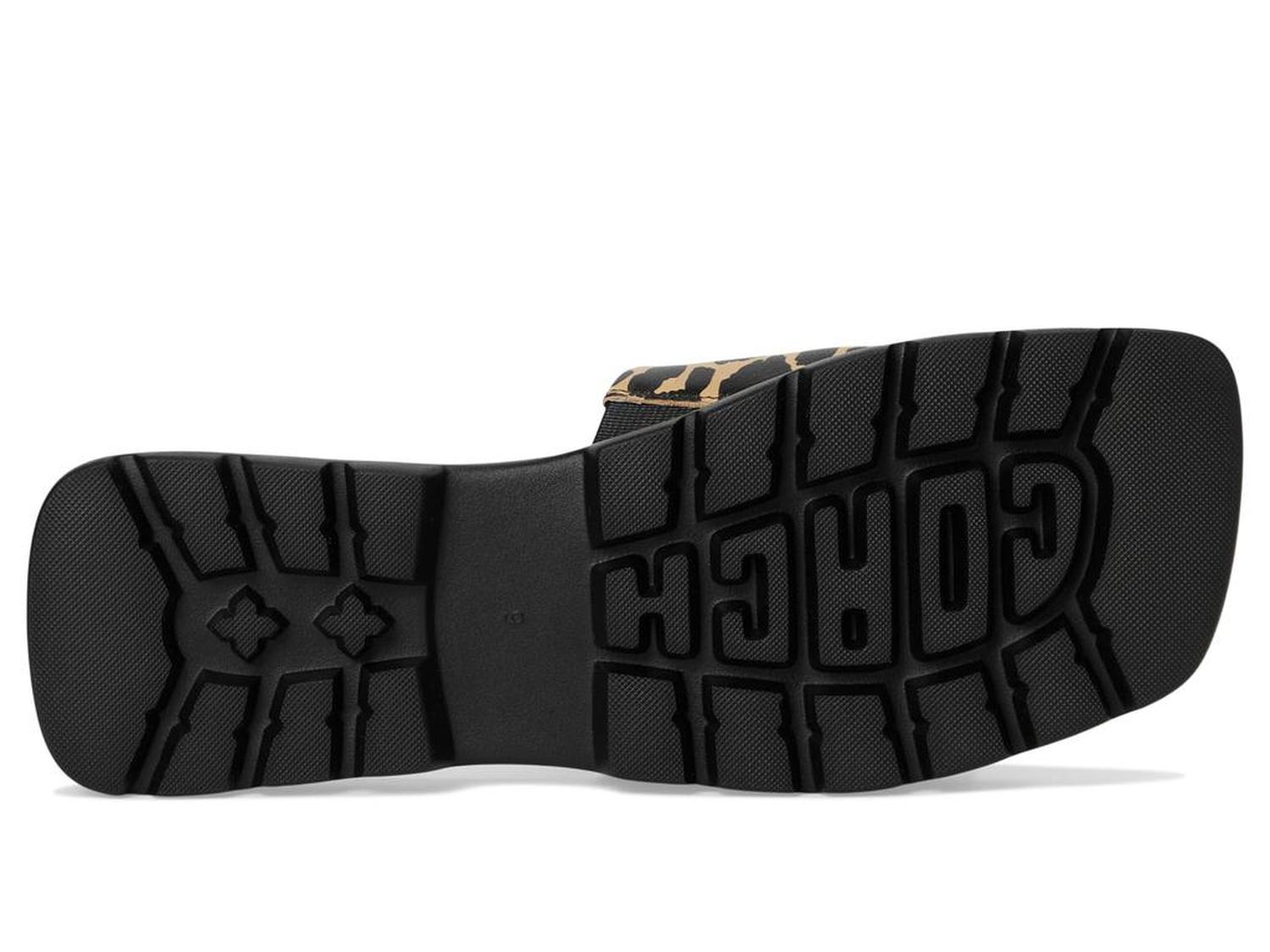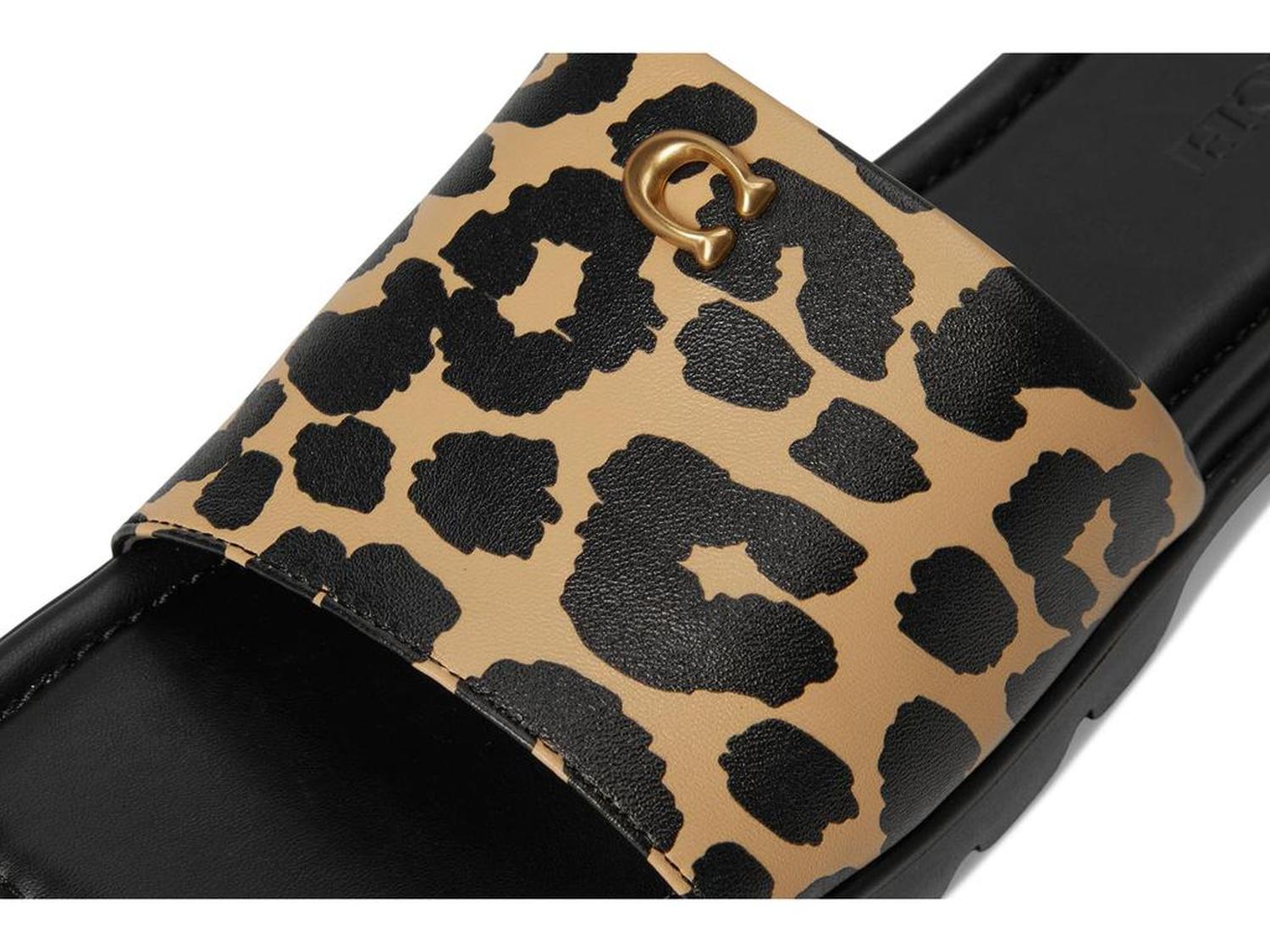 Let your feet roar with confidence wearing COACH® Florence Sandal, featuring a bold leopard print on a sleek leather upper that exudes fierce sophistication. The faux leather lining and footbed pamper your feet with luxurious softness, while the lightweight EVA insole and outsole deliver cushioned support for all-day ease. Designed for effortless wear, this slip-on silhouette ensures you stride in style and comfort, whether you're lounging poolside or exploring city streets.