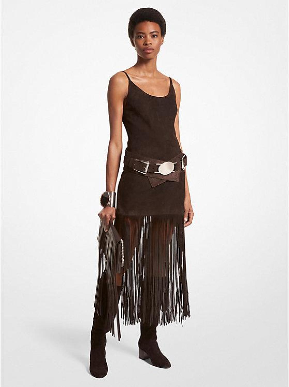 Crafted in Italy from supple suede, this minimalist tank dress features a mini hem with extra-long fringe that sways with every step. Team it with matching chocolate-hued boots for a sleek, monochromatic look inspired by the Fall/Winter 2023 runway. Made in Italy.