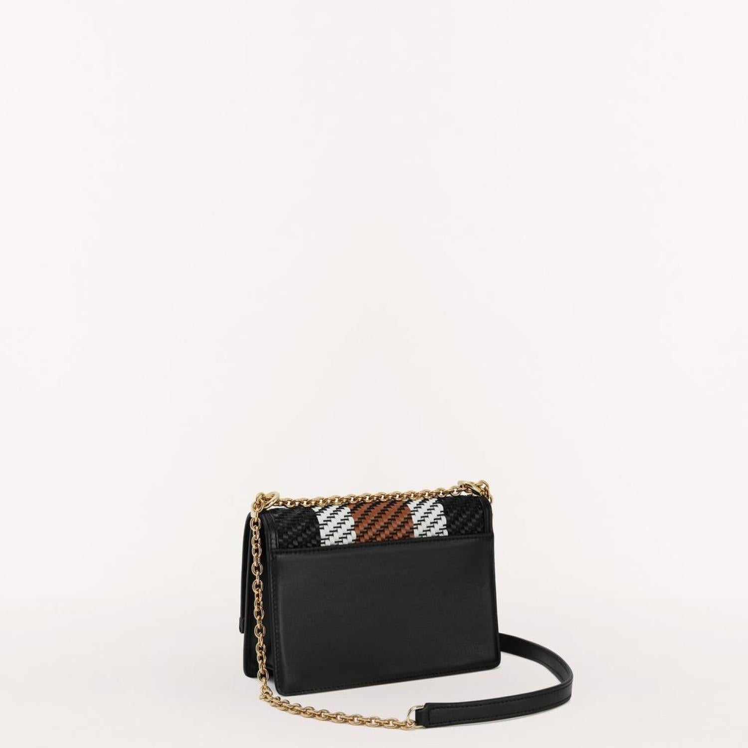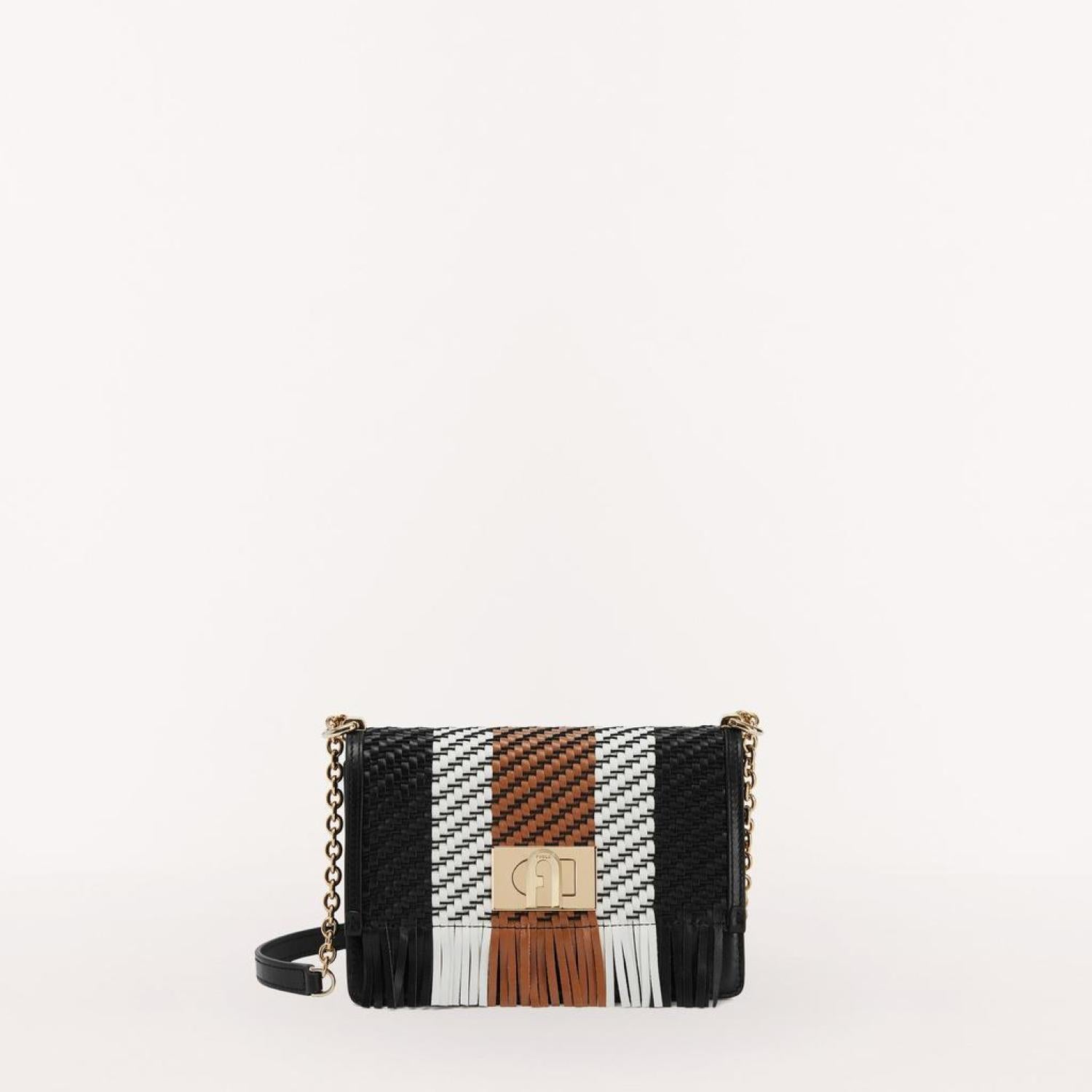 Furla 1927 is a mini crossbody bag made from a combination of Sorrento calfskin and woven Sorrento calfskin. With its matching leather and metal chain shoulder strap, it can be worn on the shoulder too. The practical, functional twist closure with flap embellished with fringing and the Furla logo on the from makes the accessory stand out. - Small inside pocket- Outer pocket on the back - Galvanised light gold finishes Dimensions 7.87 x 5.32 x 2.76 (w x h x d)