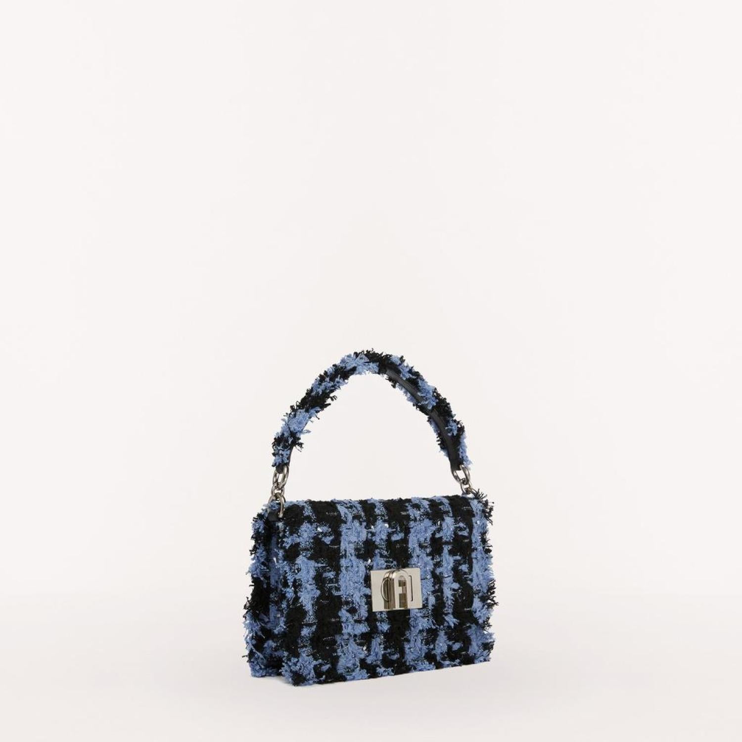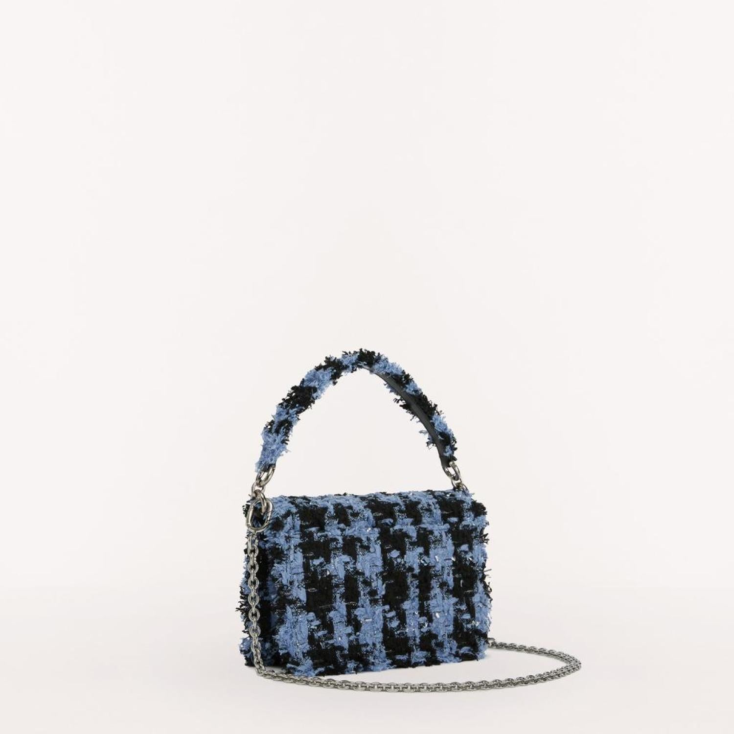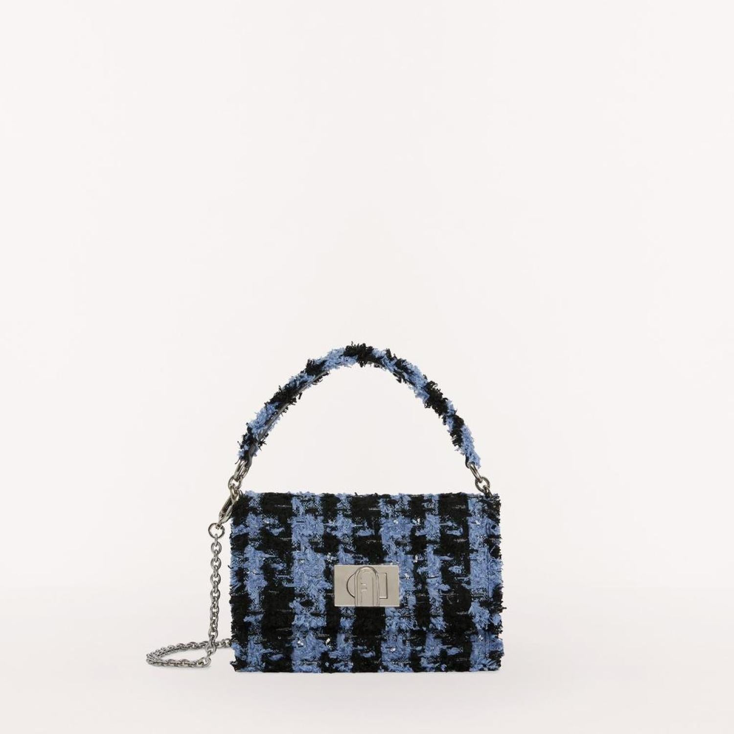 Furla 1927 is a mini crossbody bag made of checked bouclé fabric. The bag features a metal chain shoulder strap on the sides with a leather insert, allowing it to be comfortably worn also as a shoulder bag. The accessory stands out for its twist closure with the Furla logo. - Small inside pocket- Outer pocket on the back- Galvanised silver-grey finishes Dimensions 7.87 x 5.32 x 2.76 (w x h x d)