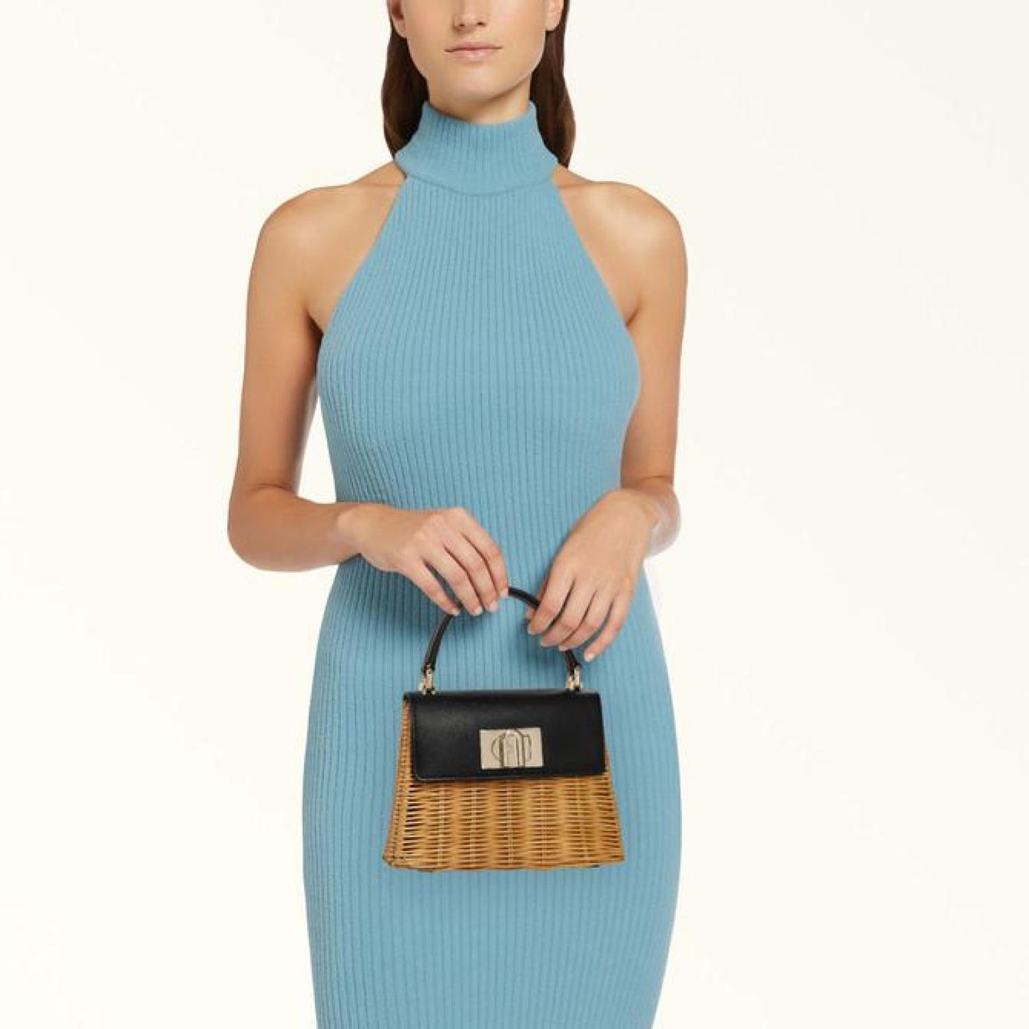 This Furla 1927 mini bag is a casual day piece, featuring an alluring combination of materials for a summertime aesthetic. The luxurious and elegant leather flap frames the wicker body of the bag, and it can be carried in the hand or worn crossbody, making it a real treasure trove for carrying your essentials. - Top handle made of leather - Removable strap - Inner pocket with zip closure - Metal feet - Twist closure with Arch logo Dimensions 8.27 x 6.3 x 3.35 (w x h x d) material Weave Wicker,Textured Leather composition 30% Leather 70% Rattan Plating Gold Height 6.3 in product code WB00991_BX1912_1007_O6000